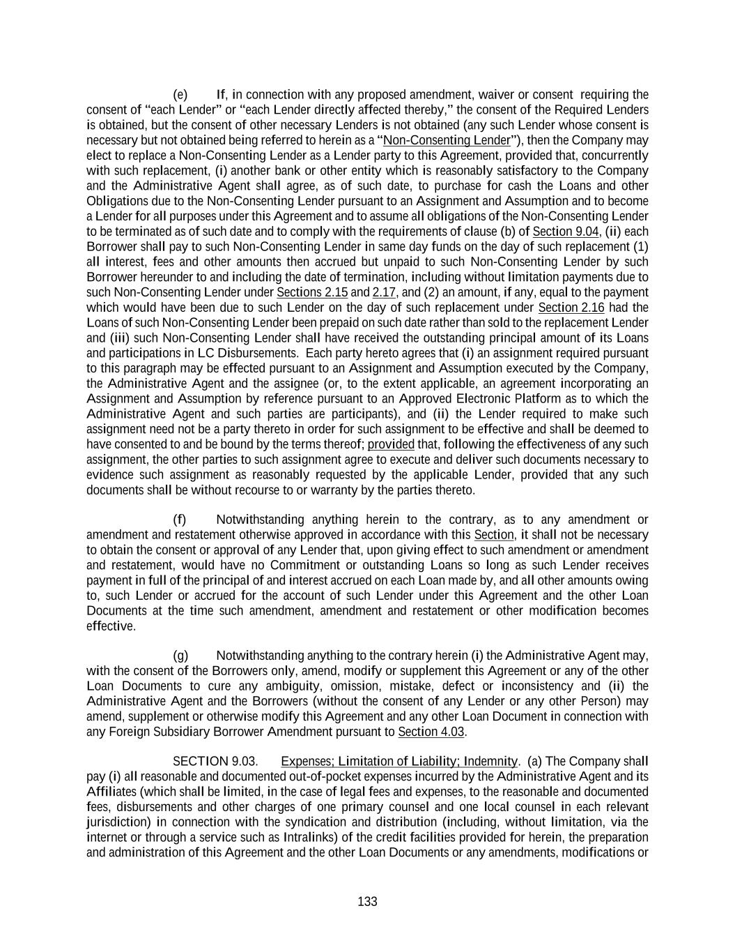 133 (e) If, in connection with any proposed amendment, waiver or consent requiring the consent of “each Lender” or “each Lender directly affected thereby,” the consent of the Required Lenders is obtained, but the consent of other necessary Lenders is not obtained (any such Lender whose consent is necessary but not obtained being referred to herein as a “Non-Consenting Lender”), then the Company may elect to replace a Non-Consenting Lender as a Lender party to this Agreement, provided that, concurrently with such replacement, (i) another bank or other entity which is reasonably satisfactory to the Company and the Administrative Agent shall agree, as of such date, to purchase for cash the Loans and other Obligations due to the Non-Consenting Lender pursuant to an Assignment and Assumption and to become a Lender for all purposes under this Agreement and to assume all obligations of the Non-Consenting Lender to be terminated as of such date and to comply with the requirements of clause (b) of Section 9.04, (ii) each Borrower shall pay to such Non-Consenting Lender in same day funds on the day of such replacement (1) all interest, fees and other amounts then accrued but unpaid to such Non-Consenting Lender by such Borrower hereunder to and including the date of termination, including without limitation payments due to such Non-Consenting Lender under Sections 2.15 and 2.17, and (2) an amount, if any, equal to the payment which would have been due to such Lender on the day of such replacement under Section 2.16 had the Loans of such Non-Consenting Lender been prepaid on such date rather than sold to the replacement Lender and (iii) such Non-Consenting Lender shall have received the outstanding principal amount of its Loans and participations in LC Disbursements. Each party hereto agrees that (i) an assignment required pursuant to this paragraph may be effected pursuant to an Assignment and Assumption executed by the Company, the Administrative Agent and the assignee (or, to the extent applicable, an agreement incorporating an Assignment and Assumption by reference pursuant to an Approved Electronic Platform as to which the Administrative Agent and such parties are participants), and (ii) the Lender required to make such assignment need not be a party thereto in order for such assignment to be effective and shall be deemed to have consented to and be bound by the terms thereof; provided that, following the effectiveness of any such assignment, the other parties to such assignment agree to execute and deliver such documents necessary to evidence such assignment as reasonably requested by the applicable Lender, provided that any such documents shall be without recourse to or warranty by the parties thereto. (f) Notwithstanding anything herein to the contrary, as to any amendment or amendment and restatement otherwise approved in accordance with this Section, it shall not be necessary to obtain the consent or approval of any Lender that, upon giving effect to such amendment or amendment and restatement, would have no Commitment or outstanding Loans so long as such Lender receives payment in full of the principal of and interest accrued on each Loan made by, and all other amounts owing to, such Lender or accrued for the account of such Lender under this Agreement and the other Loan Documents at the time such amendment, amendment and restatement or other modification becomes effective. (g) Notwithstanding anything to the contrary herein (i) the Administrative Agent may, with the consent of the Borrowers only, amend, modify or supplement this Agreement or any of the other Loan Documents to cure any ambiguity, omission, mistake, defect or inconsistency and (ii) the Administrative Agent and the Borrowers (without the consent of any Lender or any other Person) may amend, supplement or otherwise modify this Agreement and any other Loan Document in connection with any Foreign Subsidiary Borrower Amendment pursuant to Section 4.03. SECTION 9.03. Expenses; Limitation of Liability; Indemnity. (a) The Company shall pay (i) all reasonable and documented out-of-pocket expenses incurred by the Administrative Agent and its Affiliates (which shall be limited, in the case of legal fees and expenses, to the reasonable and documented fees, disbursements and other charges of one primary counsel and one local counsel in each relevant jurisdiction) in connection with the syndication and distribution (including, without limitation, via the internet or through a service such as Intralinks) of the credit facilities provided for herein, the preparation and administration of this Agreement and the other Loan Documents or any amendments, modifications or
