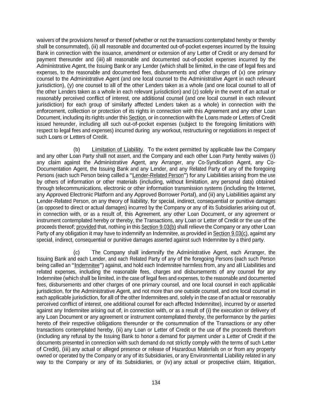 134 waivers of the provisions hereof or thereof (whether or not the transactions contemplated hereby or thereby shall be consummated), (ii) all reasonable and documented out-of-pocket expenses incurred by the Issuing Bank in connection with the issuance, amendment or extension of any Letter of Credit or any demand for payment thereunder and (iii) all reasonable and documented out-of-pocket expenses incurred by the Administrative Agent, the Issuing Bank or any Lender (which shall be limited, in the case of legal fees and expenses, to the reasonable and documented fees, disbursements and other charges of (x) one primary counsel to the Administrative Agent (and one local counsel to the Administrative Agent in each relevant jurisdiction), (y) one counsel to all of the other Lenders taken as a whole (and one local counsel to all of the other Lenders taken as a whole in each relevant jurisdiction) and (z) solely in the event of an actual or reasonably perceived conflict of interest, one additional counsel (and one local counsel in each relevant jurisdiction) for each group of similarly affected Lenders taken as a whole) in connection with the enforcement, collection or protection of its rights in connection with this Agreement and any other Loan Document, including its rights under this Section, or in connection with the Loans made or Letters of Credit issued hereunder, including all such out-of-pocket expenses (subject to the foregoing limitations with respect to legal fees and expenses) incurred during any workout, restructuring or negotiations in respect of such Loans or Letters of Credit. (b) Limitation of Liability. To the extent permitted by applicable law the Company and any other Loan Party shall not assert, and the Company and each other Loan Party hereby waives (i) any claim against the Administrative Agent, any Arranger, any Co-Syndication Agent, any Co- Documentation Agent, the Issuing Bank and any Lender, and any Related Party of any of the foregoing Persons (each such Person being called a “Lender-Related Person”) for any Liabilities arising from the use by others of information or other materials (including, without limitation, any personal data) obtained through telecommunications, electronic or other information transmission systems (including the Internet, any Approved Electronic Platform and any Approved Borrower Portal), and (ii) any Liabilities against any Lender-Related Person, on any theory of liability, for special, indirect, consequential or punitive damages (as opposed to direct or actual damages) incurred by the Company or any of its Subsidiaries arising out of, in connection with, or as a result of, this Agreement, any other Loan Document, or any agreement or instrument contemplated hereby or thereby, the Transactions, any Loan or Letter of Credit or the use of the proceeds thereof; provided that, nothing in this Section 9.03(b) shall relieve the Company or any other Loan Party of any obligation it may have to indemnify an Indemnitee, as provided in Section 9.03(c), against any special, indirect, consequential or punitive damages asserted against such Indemnitee by a third party. (c) The Company shall indemnify the Administrative Agent, each Arranger, the Issuing Bank and each Lender, and each Related Party of any of the foregoing Persons (each such Person being called an “Indemnitee”) against, and hold each Indemnitee harmless from, any and all Liabilities and related expenses, including the reasonable fees, charges and disbursements of any counsel for any Indemnitee (which shall be limited, in the case of legal fees and expenses, to the reasonable and documented fees, disbursements and other charges of one primary counsel, and one local counsel in each applicable jurisdiction, for the Administrative Agent, and not more than one outside counsel, and one local counsel in each applicable jurisdiction, for all of the other Indemnitees and, solely in the case of an actual or reasonably perceived conflict of interest, one additional counsel for each affected Indemnitee), incurred by or asserted against any Indemnitee arising out of, in connection with, or as a result of (i) the execution or delivery of any Loan Document or any agreement or instrument contemplated thereby, the performance by the parties hereto of their respective obligations thereunder or the consummation of the Transactions or any other transactions contemplated hereby, (ii) any Loan or Letter of Credit or the use of the proceeds therefrom (including any refusal by the Issuing Bank to honor a demand for payment under a Letter of Credit if the documents presented in connection with such demand do not strictly comply with the terms of such Letter of Credit), (iii) any actual or alleged presence or release of Hazardous Materials on or from any property owned or operated by the Company or any of its Subsidiaries, or any Environmental Liability related in any way to the Company or any of its Subsidiaries, or (iv) any actual or prospective claim, litigation,