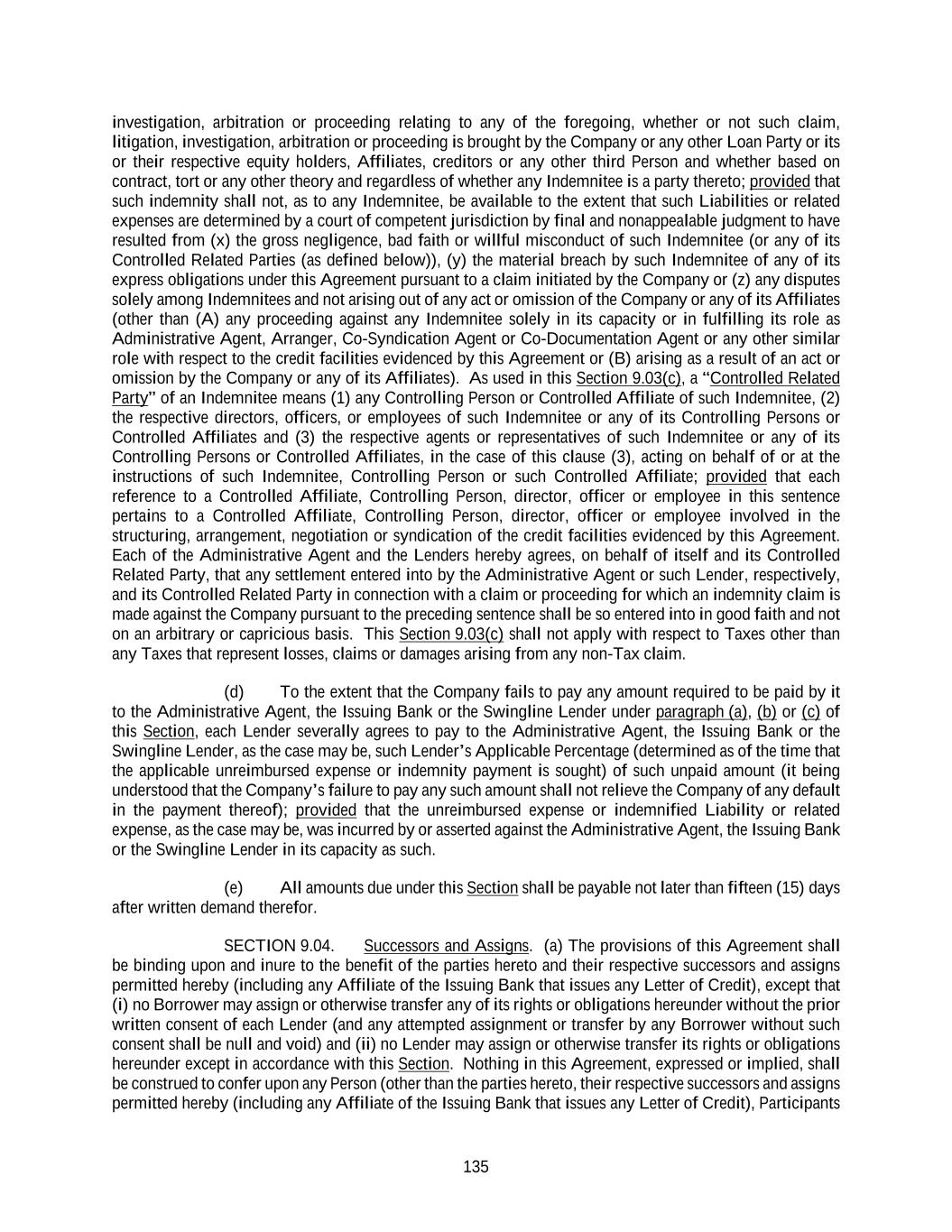 135 investigation, arbitration or proceeding relating to any of the foregoing, whether or not such claim, litigation, investigation, arbitration or proceeding is brought by the Company or any other Loan Party or its or their respective equity holders, Affiliates, creditors or any other third Person and whether based on contract, tort or any other theory and regardless of whether any Indemnitee is a party thereto; provided that such indemnity shall not, as to any Indemnitee, be available to the extent that such Liabilities or related expenses are determined by a court of competent jurisdiction by final and nonappealable judgment to have resulted from (x) the gross negligence, bad faith or willful misconduct of such Indemnitee (or any of its Controlled Related Parties (as defined below)), (y) the material breach by such Indemnitee of any of its express obligations under this Agreement pursuant to a claim initiated by the Company or (z) any disputes solely among Indemnitees and not arising out of any act or omission of the Company or any of its Affiliates (other than (A) any proceeding against any Indemnitee solely in its capacity or in fulfilling its role as Administrative Agent, Arranger, Co-Syndication Agent or Co-Documentation Agent or any other similar role with respect to the credit facilities evidenced by this Agreement or (B) arising as a result of an act or omission by the Company or any of its Affiliates). As used in this Section 9.03(c), a “Controlled Related Party” of an Indemnitee means (1) any Controlling Person or Controlled Affiliate of such Indemnitee, (2) the respective directors, officers, or employees of such Indemnitee or any of its Controlling Persons or Controlled Affiliates and (3) the respective agents or representatives of such Indemnitee or any of its Controlling Persons or Controlled Affiliates, in the case of this clause (3), acting on behalf of or at the instructions of such Indemnitee, Controlling Person or such Controlled Affiliate; provided that each reference to a Controlled Affiliate, Controlling Person, director, officer or employee in this sentence pertains to a Controlled Affiliate, Controlling Person, director, officer or employee involved in the structuring, arrangement, negotiation or syndication of the credit facilities evidenced by this Agreement. Each of the Administrative Agent and the Lenders hereby agrees, on behalf of itself and its Controlled Related Party, that any settlement entered into by the Administrative Agent or such Lender, respectively, and its Controlled Related Party in connection with a claim or proceeding for which an indemnity claim is made against the Company pursuant to the preceding sentence shall be so entered into in good faith and not on an arbitrary or capricious basis. This Section 9.03(c) shall not apply with respect to Taxes other than any Taxes that represent losses, claims or damages arising from any non-Tax claim. (d) To the extent that the Company fails to pay any amount required to be paid by it to the Administrative Agent, the Issuing Bank or the Swingline Lender under paragraph (a), (b) or (c) of this Section, each Lender severally agrees to pay to the Administrative Agent, the Issuing Bank or the Swingline Lender, as the case may be, such Lender’s Applicable Percentage (determined as of the time that the applicable unreimbursed expense or indemnity payment is sought) of such unpaid amount (it being understood that the Company’s failure to pay any such amount shall not relieve the Company of any default in the payment thereof); provided that the unreimbursed expense or indemnified Liability or related expense, as the case may be, was incurred by or asserted against the Administrative Agent, the Issuing Bank or the Swingline Lender in its capacity as such. (e) All amounts due under this Section shall be payable not later than fifteen (15) days after written demand therefor. SECTION 9.04. Successors and Assigns. (a) The provisions of this Agreement shall be binding upon and inure to the benefit of the parties hereto and their respective successors and assigns permitted hereby (including any Affiliate of the Issuing Bank that issues any Letter of Credit), except that (i) no Borrower may assign or otherwise transfer any of its rights or obligations hereunder without the prior written consent of each Lender (and any attempted assignment or transfer by any Borrower without such consent shall be null and void) and (ii) no Lender may assign or otherwise transfer its rights or obligations hereunder except in accordance with this Section. Nothing in this Agreement, expressed or implied, shall be construed to confer upon any Person (other than the parties hereto, their respective successors and assigns permitted hereby (including any Affiliate of the Issuing Bank that issues any Letter of Credit), Participants