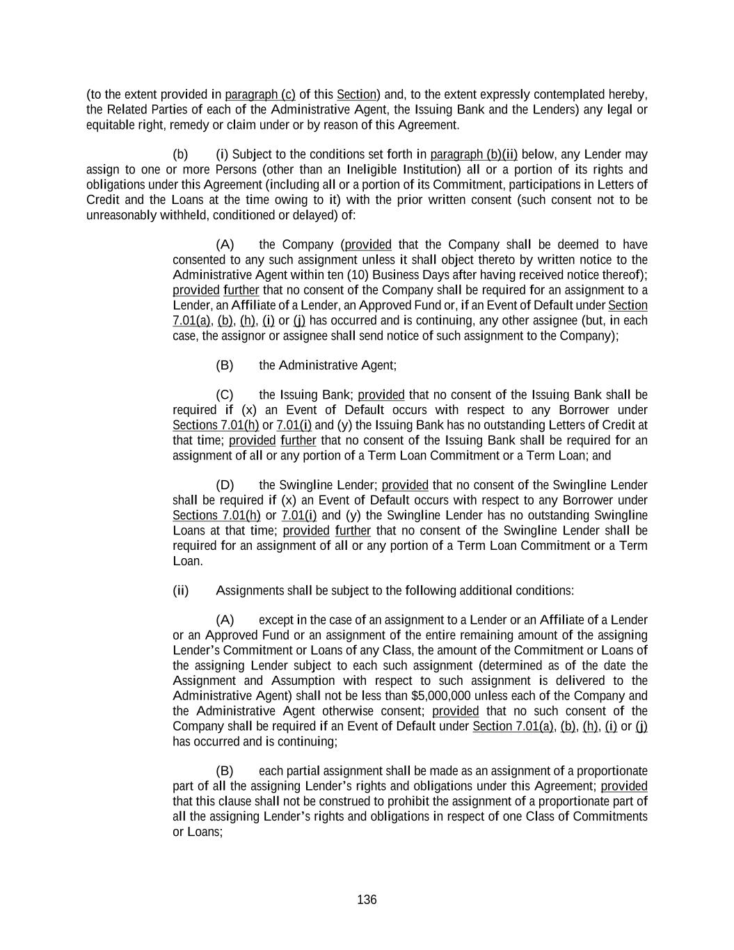 136 (to the extent provided in paragraph (c) of this Section) and, to the extent expressly contemplated hereby, the Related Parties of each of the Administrative Agent, the Issuing Bank and the Lenders) any legal or equitable right, remedy or claim under or by reason of this Agreement. (b) (i) Subject to the conditions set forth in paragraph (b)(ii) below, any Lender may assign to one or more Persons (other than an Ineligible Institution) all or a portion of its rights and obligations under this Agreement (including all or a portion of its Commitment, participations in Letters of Credit and the Loans at the time owing to it) with the prior written consent (such consent not to be unreasonably withheld, conditioned or delayed) of: (A) the Company (provided that the Company shall be deemed to have consented to any such assignment unless it shall object thereto by written notice to the Administrative Agent within ten (10) Business Days after having received notice thereof); provided further that no consent of the Company shall be required for an assignment to a Lender, an Affiliate of a Lender, an Approved Fund or, if an Event of Default under Section 7.01(a), (b), (h), (i) or (j) has occurred and is continuing, any other assignee (but, in each case, the assignor or assignee shall send notice of such assignment to the Company); (B) the Administrative Agent; (C) the Issuing Bank; provided that no consent of the Issuing Bank shall be required if (x) an Event of Default occurs with respect to any Borrower under Sections 7.01(h) or 7.01(i) and (y) the Issuing Bank has no outstanding Letters of Credit at that time; provided further that no consent of the Issuing Bank shall be required for an assignment of all or any portion of a Term Loan Commitment or a Term Loan; and (D) the Swingline Lender; provided that no consent of the Swingline Lender shall be required if (x) an Event of Default occurs with respect to any Borrower under Sections 7.01(h) or 7.01(i) and (y) the Swingline Lender has no outstanding Swingline Loans at that time; provided further that no consent of the Swingline Lender shall be required for an assignment of all or any portion of a Term Loan Commitment or a Term Loan. (ii) Assignments shall be subject to the following additional conditions: (A) except in the case of an assignment to a Lender or an Affiliate of a Lender or an Approved Fund or an assignment of the entire remaining amount of the assigning Lender’s Commitment or Loans of any Class, the amount of the Commitment or Loans of the assigning Lender subject to each such assignment (determined as of the date the Assignment and Assumption with respect to such assignment is delivered to the Administrative Agent) shall not be less than $5,000,000 unless each of the Company and the Administrative Agent otherwise consent; provided that no such consent of the Company shall be required if an Event of Default under Section 7.01(a), (b), (h), (i) or (j) has occurred and is continuing; (B) each partial assignment shall be made as an assignment of a proportionate part of all the assigning Lender’s rights and obligations under this Agreement; provided that this clause shall not be construed to prohibit the assignment of a proportionate part of all the assigning Lender’s rights and obligations in respect of one Class of Commitments or Loans;