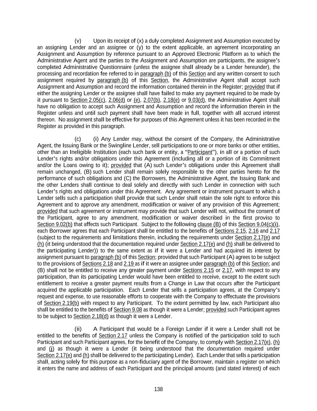 138 (v) Upon its receipt of (x) a duly completed Assignment and Assumption executed by an assigning Lender and an assignee or (y) to the extent applicable, an agreement incorporating an Assignment and Assumption by reference pursuant to an Approved Electronic Platform as to which the Administrative Agent and the parties to the Assignment and Assumption are participants, the assignee’s completed Administrative Questionnaire (unless the assignee shall already be a Lender hereunder), the processing and recordation fee referred to in paragraph (b) of this Section and any written consent to such assignment required by paragraph (b) of this Section, the Administrative Agent shall accept such Assignment and Assumption and record the information contained therein in the Register; provided that if either the assigning Lender or the assignee shall have failed to make any payment required to be made by it pursuant to Section 2.05(c), 2.06(d) or (e), 2.07(b), 2.18(e) or 9.03(d), the Administrative Agent shall have no obligation to accept such Assignment and Assumption and record the information therein in the Register unless and until such payment shall have been made in full, together with all accrued interest thereon. No assignment shall be effective for purposes of this Agreement unless it has been recorded in the Register as provided in this paragraph. (c) (i) Any Lender may, without the consent of the Company, the Administrative Agent, the Issuing Bank or the Swingline Lender, sell participations to one or more banks or other entities, other than an Ineligible Institution (each such bank or entity, a “Participant”), in all or a portion of such Lender’s rights and/or obligations under this Agreement (including all or a portion of its Commitment and/or the Loans owing to it); provided that (A) such Lender’s obligations under this Agreement shall remain unchanged, (B) such Lender shall remain solely responsible to the other parties hereto for the performance of such obligations and (C) the Borrowers, the Administrative Agent, the Issuing Bank and the other Lenders shall continue to deal solely and directly with such Lender in connection with such Lender’s rights and obligations under this Agreement. Any agreement or instrument pursuant to which a Lender sells such a participation shall provide that such Lender shall retain the sole right to enforce this Agreement and to approve any amendment, modification or waiver of any provision of this Agreement; provided that such agreement or instrument may provide that such Lender will not, without the consent of the Participant, agree to any amendment, modification or waiver described in the first proviso to Section 9.02(b) that affects such Participant. Subject to the following clause (B) of this Section 9.04(c)(i), each Borrower agrees that each Participant shall be entitled to the benefits of Sections 2.15, 2.16 and 2.17 (subject to the requirements and limitations therein, including the requirements under Section 2.17(e) and (h) (it being understood that the documentation required under Section 2.17(e) and (h) shall be delivered to the participating Lender)) to the same extent as if it were a Lender and had acquired its interest by assignment pursuant to paragraph (b) of this Section; provided that such Participant (A) agrees to be subject to the provisions of Sections 2.18 and 2.19 as if it were an assignee under paragraph (b) of this Section; and (B) shall not be entitled to receive any greater payment under Sections 2.15 or 2.17, with respect to any participation, than its participating Lender would have been entitled to receive, except to the extent such entitlement to receive a greater payment results from a Change in Law that occurs after the Participant acquired the applicable participation. Each Lender that sells a participation agrees, at the Company’s request and expense, to use reasonable efforts to cooperate with the Company to effectuate the provisions of Section 2.19(b) with respect to any Participant. To the extent permitted by law, each Participant also shall be entitled to the benefits of Section 9.08 as though it were a Lender; provided such Participant agrees to be subject to Section 2.18(d) as though it were a Lender. (ii) A Participant that would be a Foreign Lender if it were a Lender shall not be entitled to the benefits of Section 2.17 unless the Company is notified of the participation sold to such Participant and such Participant agrees, for the benefit of the Company, to comply with Section 2.17(e), (h) and (j) as though it were a Lender (it being understood that the documentation required under Section 2.17(e) and (h) shall be delivered to the participating Lender). Each Lender that sells a participation shall, acting solely for this purpose as a non-fiduciary agent of the Borrower, maintain a register on which it enters the name and address of each Participant and the principal amounts (and stated interest) of each