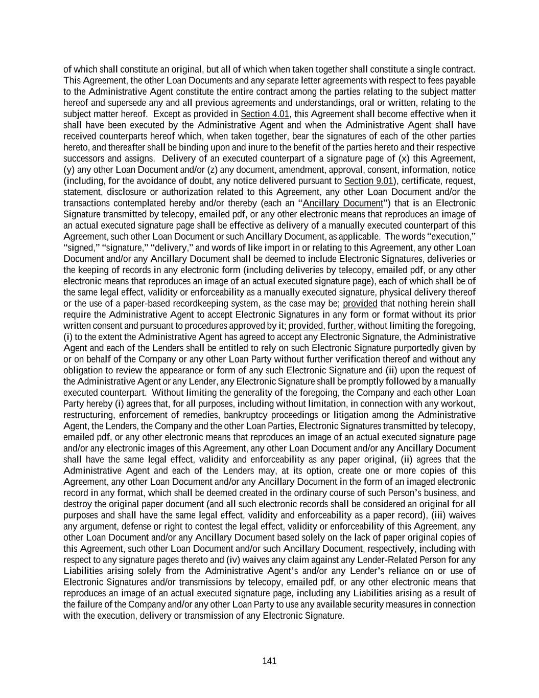141 of which shall constitute an original, but all of which when taken together shall constitute a single contract. This Agreement, the other Loan Documents and any separate letter agreements with respect to fees payable to the Administrative Agent constitute the entire contract among the parties relating to the subject matter hereof and supersede any and all previous agreements and understandings, oral or written, relating to the subject matter hereof. Except as provided in Section 4.01, this Agreement shall become effective when it shall have been executed by the Administrative Agent and when the Administrative Agent shall have received counterparts hereof which, when taken together, bear the signatures of each of the other parties hereto, and thereafter shall be binding upon and inure to the benefit of the parties hereto and their respective successors and assigns. Delivery of an executed counterpart of a signature page of (x) this Agreement, (y) any other Loan Document and/or (z) any document, amendment, approval, consent, information, notice (including, for the avoidance of doubt, any notice delivered pursuant to Section 9.01), certificate, request, statement, disclosure or authorization related to this Agreement, any other Loan Document and/or the transactions contemplated hereby and/or thereby (each an “Ancillary Document”) that is an Electronic Signature transmitted by telecopy, emailed pdf, or any other electronic means that reproduces an image of an actual executed signature page shall be effective as delivery of a manually executed counterpart of this Agreement, such other Loan Document or such Ancillary Document, as applicable. The words “execution,” “signed,” “signature,” “delivery,” and words of like import in or relating to this Agreement, any other Loan Document and/or any Ancillary Document shall be deemed to include Electronic Signatures, deliveries or the keeping of records in any electronic form (including deliveries by telecopy, emailed pdf, or any other electronic means that reproduces an image of an actual executed signature page), each of which shall be of the same legal effect, validity or enforceability as a manually executed signature, physical delivery thereof or the use of a paper-based recordkeeping system, as the case may be; provided that nothing herein shall require the Administrative Agent to accept Electronic Signatures in any form or format without its prior written consent and pursuant to procedures approved by it; provided, further, without limiting the foregoing, (i) to the extent the Administrative Agent has agreed to accept any Electronic Signature, the Administrative Agent and each of the Lenders shall be entitled to rely on such Electronic Signature purportedly given by or on behalf of the Company or any other Loan Party without further verification thereof and without any obligation to review the appearance or form of any such Electronic Signature and (ii) upon the request of the Administrative Agent or any Lender, any Electronic Signature shall be promptly followed by a manually executed counterpart. Without limiting the generality of the foregoing, the Company and each other Loan Party hereby (i) agrees that, for all purposes, including without limitation, in connection with any workout, restructuring, enforcement of remedies, bankruptcy proceedings or litigation among the Administrative Agent, the Lenders, the Company and the other Loan Parties, Electronic Signatures transmitted by telecopy, emailed pdf, or any other electronic means that reproduces an image of an actual executed signature page and/or any electronic images of this Agreement, any other Loan Document and/or any Ancillary Document shall have the same legal effect, validity and enforceability as any paper original, (ii) agrees that the Administrative Agent and each of the Lenders may, at its option, create one or more copies of this Agreement, any other Loan Document and/or any Ancillary Document in the form of an imaged electronic record in any format, which shall be deemed created in the ordinary course of such Person’s business, and destroy the original paper document (and all such electronic records shall be considered an original for all purposes and shall have the same legal effect, validity and enforceability as a paper record), (iii) waives any argument, defense or right to contest the legal effect, validity or enforceability of this Agreement, any other Loan Document and/or any Ancillary Document based solely on the lack of paper original copies of this Agreement, such other Loan Document and/or such Ancillary Document, respectively, including with respect to any signature pages thereto and (iv) waives any claim against any Lender-Related Person for any Liabilities arising solely from the Administrative Agent’s and/or any Lender’s reliance on or use of Electronic Signatures and/or transmissions by telecopy, emailed pdf, or any other electronic means that reproduces an image of an actual executed signature page, including any Liabilities arising as a result of the failure of the Company and/or any other Loan Party to use any available security measures in connection with the execution, delivery or transmission of any Electronic Signature.