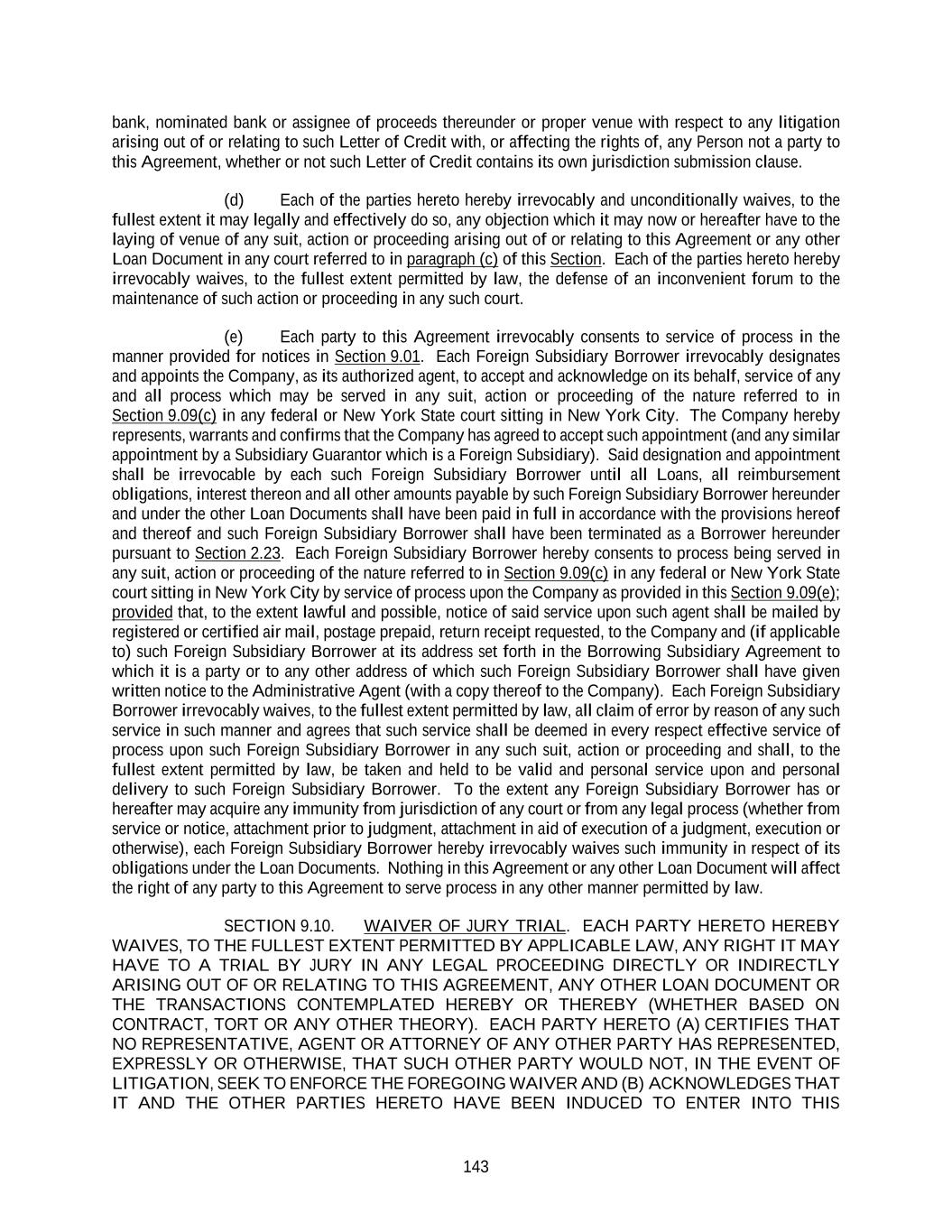 143 bank, nominated bank or assignee of proceeds thereunder or proper venue with respect to any litigation arising out of or relating to such Letter of Credit with, or affecting the rights of, any Person not a party to this Agreement, whether or not such Letter of Credit contains its own jurisdiction submission clause. (d) Each of the parties hereto hereby irrevocably and unconditionally waives, to the fullest extent it may legally and effectively do so, any objection which it may now or hereafter have to the laying of venue of any suit, action or proceeding arising out of or relating to this Agreement or any other Loan Document in any court referred to in paragraph (c) of this Section. Each of the parties hereto hereby irrevocably waives, to the fullest extent permitted by law, the defense of an inconvenient forum to the maintenance of such action or proceeding in any such court. (e) Each party to this Agreement irrevocably consents to service of process in the manner provided for notices in Section 9.01. Each Foreign Subsidiary Borrower irrevocably designates and appoints the Company, as its authorized agent, to accept and acknowledge on its behalf, service of any and all process which may be served in any suit, action or proceeding of the nature referred to in Section 9.09(c) in any federal or New York State court sitting in New York City. The Company hereby represents, warrants and confirms that the Company has agreed to accept such appointment (and any similar appointment by a Subsidiary Guarantor which is a Foreign Subsidiary). Said designation and appointment shall be irrevocable by each such Foreign Subsidiary Borrower until all Loans, all reimbursement obligations, interest thereon and all other amounts payable by such Foreign Subsidiary Borrower hereunder and under the other Loan Documents shall have been paid in full in accordance with the provisions hereof and thereof and such Foreign Subsidiary Borrower shall have been terminated as a Borrower hereunder pursuant to Section 2.23. Each Foreign Subsidiary Borrower hereby consents to process being served in any suit, action or proceeding of the nature referred to in Section 9.09(c) in any federal or New York State court sitting in New York City by service of process upon the Company as provided in this Section 9.09(e); provided that, to the extent lawful and possible, notice of said service upon such agent shall be mailed by registered or certified air mail, postage prepaid, return receipt requested, to the Company and (if applicable to) such Foreign Subsidiary Borrower at its address set forth in the Borrowing Subsidiary Agreement to which it is a party or to any other address of which such Foreign Subsidiary Borrower shall have given written notice to the Administrative Agent (with a copy thereof to the Company). Each Foreign Subsidiary Borrower irrevocably waives, to the fullest extent permitted by law, all claim of error by reason of any such service in such manner and agrees that such service shall be deemed in every respect effective service of process upon such Foreign Subsidiary Borrower in any such suit, action or proceeding and shall, to the fullest extent permitted by law, be taken and held to be valid and personal service upon and personal delivery to such Foreign Subsidiary Borrower. To the extent any Foreign Subsidiary Borrower has or hereafter may acquire any immunity from jurisdiction of any court or from any legal process (whether from service or notice, attachment prior to judgment, attachment in aid of execution of a judgment, execution or otherwise), each Foreign Subsidiary Borrower hereby irrevocably waives such immunity in respect of its obligations under the Loan Documents. Nothing in this Agreement or any other Loan Document will affect the right of any party to this Agreement to serve process in any other manner permitted by law. SECTION 9.10. WAIVER OF JURY TRIAL. EACH PARTY HERETO HEREBY WAIVES, TO THE FULLEST EXTENT PERMITTED BY APPLICABLE LAW, ANY RIGHT IT MAY HAVE TO A TRIAL BY JURY IN ANY LEGAL PROCEEDING DIRECTLY OR INDIRECTLY ARISING OUT OF OR RELATING TO THIS AGREEMENT, ANY OTHER LOAN DOCUMENT OR THE TRANSACTIONS CONTEMPLATED HEREBY OR THEREBY (WHETHER BASED ON CONTRACT, TORT OR ANY OTHER THEORY). EACH PARTY HERETO (A) CERTIFIES THAT NO REPRESENTATIVE, AGENT OR ATTORNEY OF ANY OTHER PARTY HAS REPRESENTED, EXPRESSLY OR OTHERWISE, THAT SUCH OTHER PARTY WOULD NOT, IN THE EVENT OF LITIGATION, SEEK TO ENFORCE THE FOREGOING WAIVER AND (B) ACKNOWLEDGES THAT IT AND THE OTHER PARTIES HERETO HAVE BEEN INDUCED TO ENTER INTO THIS