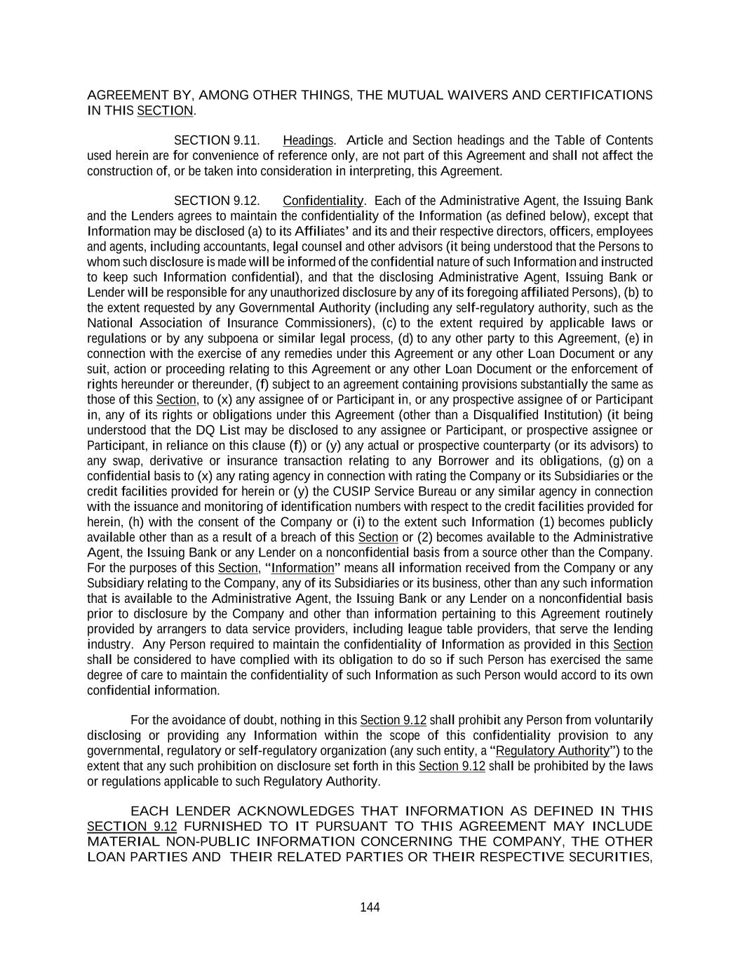 144 AGREEMENT BY, AMONG OTHER THINGS, THE MUTUAL WAIVERS AND CERTIFICATIONS IN THIS SECTION. SECTION 9.11. Headings. Article and Section headings and the Table of Contents used herein are for convenience of reference only, are not part of this Agreement and shall not affect the construction of, or be taken into consideration in interpreting, this Agreement. SECTION 9.12. Confidentiality. Each of the Administrative Agent, the Issuing Bank and the Lenders agrees to maintain the confidentiality of the Information (as defined below), except that Information may be disclosed (a) to its Affiliates’ and its and their respective directors, officers, employees and agents, including accountants, legal counsel and other advisors (it being understood that the Persons to whom such disclosure is made will be informed of the confidential nature of such Information and instructed to keep such Information confidential), and that the disclosing Administrative Agent, Issuing Bank or Lender will be responsible for any unauthorized disclosure by any of its foregoing affiliated Persons), (b) to the extent requested by any Governmental Authority (including any self-regulatory authority, such as the National Association of Insurance Commissioners), (c) to the extent required by applicable laws or regulations or by any subpoena or similar legal process, (d) to any other party to this Agreement, (e) in connection with the exercise of any remedies under this Agreement or any other Loan Document or any suit, action or proceeding relating to this Agreement or any other Loan Document or the enforcement of rights hereunder or thereunder, (f) subject to an agreement containing provisions substantially the same as those of this Section, to (x) any assignee of or Participant in, or any prospective assignee of or Participant in, any of its rights or obligations under this Agreement (other than a Disqualified Institution) (it being understood that the DQ List may be disclosed to any assignee or Participant, or prospective assignee or Participant, in reliance on this clause (f)) or (y) any actual or prospective counterparty (or its advisors) to any swap, derivative or insurance transaction relating to any Borrower and its obligations, (g) on a confidential basis to (x) any rating agency in connection with rating the Company or its Subsidiaries or the credit facilities provided for herein or (y) the CUSIP Service Bureau or any similar agency in connection with the issuance and monitoring of identification numbers with respect to the credit facilities provided for herein, (h) with the consent of the Company or (i) to the extent such Information (1) becomes publicly available other than as a result of a breach of this Section or (2) becomes available to the Administrative Agent, the Issuing Bank or any Lender on a nonconfidential basis from a source other than the Company. For the purposes of this Section, “Information” means all information received from the Company or any Subsidiary relating to the Company, any of its Subsidiaries or its business, other than any such information that is available to the Administrative Agent, the Issuing Bank or any Lender on a nonconfidential basis prior to disclosure by the Company and other than information pertaining to this Agreement routinely provided by arrangers to data service providers, including league table providers, that serve the lending industry. Any Person required to maintain the confidentiality of Information as provided in this Section shall be considered to have complied with its obligation to do so if such Person has exercised the same degree of care to maintain the confidentiality of such Information as such Person would accord to its own confidential information. For the avoidance of doubt, nothing in this Section 9.12 shall prohibit any Person from voluntarily disclosing or providing any Information within the scope of this confidentiality provision to any governmental, regulatory or self-regulatory organization (any such entity, a “Regulatory Authority”) to the extent that any such prohibition on disclosure set forth in this Section 9.12 shall be prohibited by the laws or regulations applicable to such Regulatory Authority. EACH LENDER ACKNOWLEDGES THAT INFORMATION AS DEFINED IN THIS SECTION 9.12 FURNISHED TO IT PURSUANT TO THIS AGREEMENT MAY INCLUDE MATERIAL NON-PUBLIC INFORMATION CONCERNING THE COMPANY, THE OTHER LOAN PARTIES AND THEIR RELATED PARTIES OR THEIR RESPECTIVE SECURITIES,