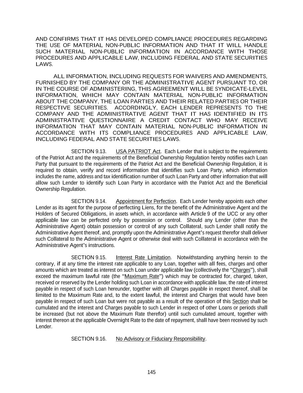 145 AND CONFIRMS THAT IT HAS DEVELOPED COMPLIANCE PROCEDURES REGARDING THE USE OF MATERIAL NON-PUBLIC INFORMATION AND THAT IT WILL HANDLE SUCH MATERIAL NON-PUBLIC INFORMATION IN ACCORDANCE WITH THOSE PROCEDURES AND APPLICABLE LAW, INCLUDING FEDERAL AND STATE SECURITIES LAWS. ALL INFORMATION, INCLUDING REQUESTS FOR WAIVERS AND AMENDMENTS, FURNISHED BY THE COMPANY OR THE ADMINISTRATIVE AGENT PURSUANT TO, OR IN THE COURSE OF ADMINISTERING, THIS AGREEMENT WILL BE SYNDICATE-LEVEL INFORMATION, WHICH MAY CONTAIN MATERIAL NON-PUBLIC INFORMATION ABOUT THE COMPANY, THE LOAN PARTIES AND THEIR RELATED PARTIES OR THEIR RESPECTIVE SECURITIES. ACCORDINGLY, EACH LENDER REPRESENTS TO THE COMPANY AND THE ADMINISTRATIVE AGENT THAT IT HAS IDENTIFIED IN ITS ADMINISTRATIVE QUESTIONNAIRE A CREDIT CONTACT WHO MAY RECEIVE INFORMATION THAT MAY CONTAIN MATERIAL NON-PUBLIC INFORMATION IN ACCORDANCE WITH ITS COMPLIANCE PROCEDURES AND APPLICABLE LAW, INCLUDING FEDERAL AND STATE SECURITIES LAWS. SECTION 9.13. USA PATRIOT Act. Each Lender that is subject to the requirements of the Patriot Act and the requirements of the Beneficial Ownership Regulation hereby notifies each Loan Party that pursuant to the requirements of the Patriot Act and the Beneficial Ownership Regulation, it is required to obtain, verify and record information that identifies such Loan Party, which information includes the name, address and tax identification number of such Loan Party and other information that will allow such Lender to identify such Loan Party in accordance with the Patriot Act and the Beneficial Ownership Regulation. SECTION 9.14. Appointment for Perfection. Each Lender hereby appoints each other Lender as its agent for the purpose of perfecting Liens, for the benefit of the Administrative Agent and the Holders of Secured Obligations, in assets which, in accordance with Article 9 of the UCC or any other applicable law can be perfected only by possession or control. Should any Lender (other than the Administrative Agent) obtain possession or control of any such Collateral, such Lender shall notify the Administrative Agent thereof, and, promptly upon the Administrative Agent’s request therefor shall deliver such Collateral to the Administrative Agent or otherwise deal with such Collateral in accordance with the Administrative Agent’s instructions. SECTION 9.15. Interest Rate Limitation. Notwithstanding anything herein to the contrary, if at any time the interest rate applicable to any Loan, together with all fees, charges and other amounts which are treated as interest on such Loan under applicable law (collectively the “Charges”), shall exceed the maximum lawful rate (the “Maximum Rate”) which may be contracted for, charged, taken, received or reserved by the Lender holding such Loan in accordance with applicable law, the rate of interest payable in respect of such Loan hereunder, together with all Charges payable in respect thereof, shall be limited to the Maximum Rate and, to the extent lawful, the interest and Charges that would have been payable in respect of such Loan but were not payable as a result of the operation of this Section shall be cumulated and the interest and Charges payable to such Lender in respect of other Loans or periods shall be increased (but not above the Maximum Rate therefor) until such cumulated amount, together with interest thereon at the applicable Overnight Rate to the date of repayment, shall have been received by such Lender. SECTION 9.16. No Advisory or Fiduciary Responsibility.