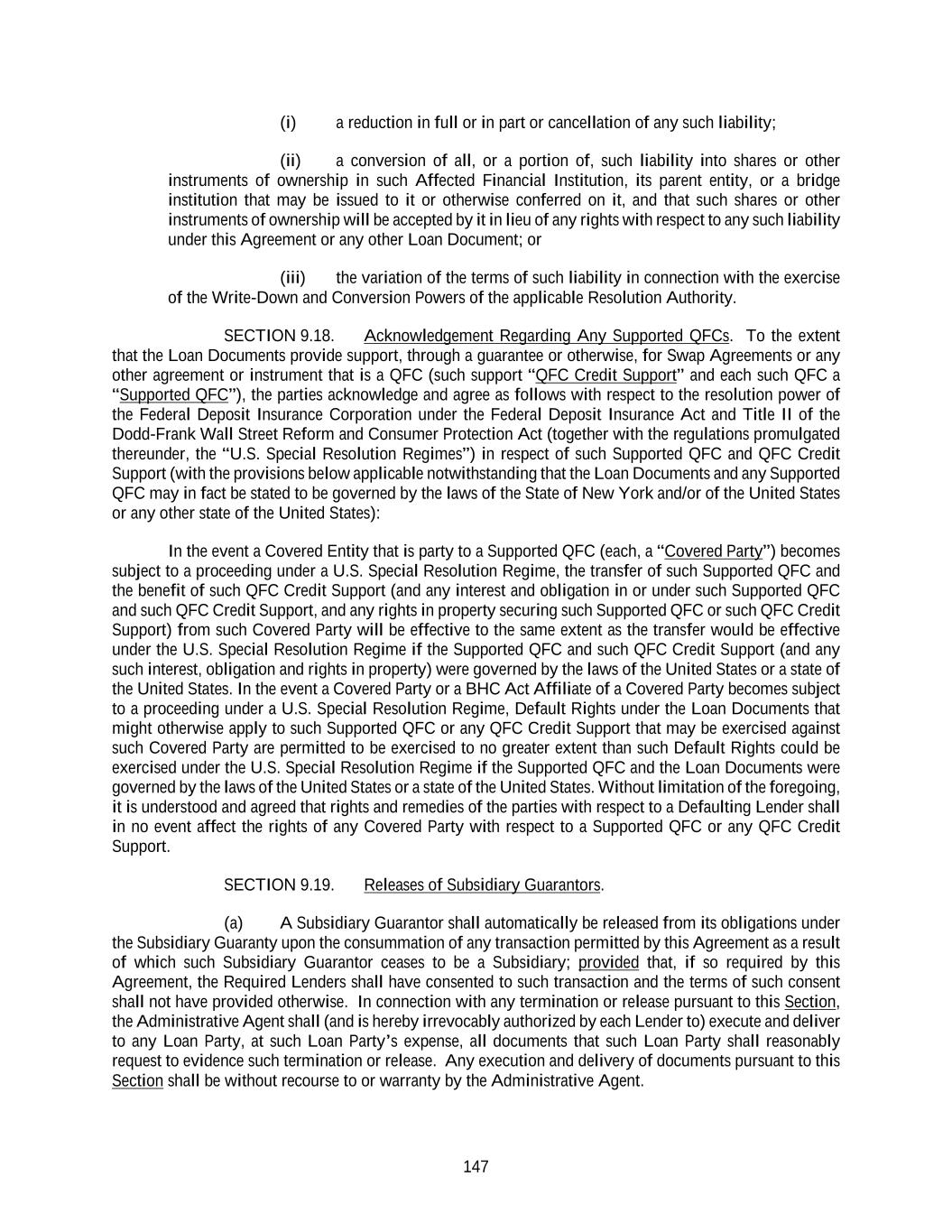 147 (i) a reduction in full or in part or cancellation of any such liability; (ii) a conversion of all, or a portion of, such liability into shares or other instruments of ownership in such Affected Financial Institution, its parent entity, or a bridge institution that may be issued to it or otherwise conferred on it, and that such shares or other instruments of ownership will be accepted by it in lieu of any rights with respect to any such liability under this Agreement or any other Loan Document; or (iii) the variation of the terms of such liability in connection with the exercise of the Write-Down and Conversion Powers of the applicable Resolution Authority. SECTION 9.18. Acknowledgement Regarding Any Supported QFCs. To the extent that the Loan Documents provide support, through a guarantee or otherwise, for Swap Agreements or any other agreement or instrument that is a QFC (such support “QFC Credit Support” and each such QFC a “Supported QFC”), the parties acknowledge and agree as follows with respect to the resolution power of the Federal Deposit Insurance Corporation under the Federal Deposit Insurance Act and Title II of the Dodd-Frank Wall Street Reform and Consumer Protection Act (together with the regulations promulgated thereunder, the “U.S. Special Resolution Regimes”) in respect of such Supported QFC and QFC Credit Support (with the provisions below applicable notwithstanding that the Loan Documents and any Supported QFC may in fact be stated to be governed by the laws of the State of New York and/or of the United States or any other state of the United States): In the event a Covered Entity that is party to a Supported QFC (each, a “Covered Party”) becomes subject to a proceeding under a U.S. Special Resolution Regime, the transfer of such Supported QFC and the benefit of such QFC Credit Support (and any interest and obligation in or under such Supported QFC and such QFC Credit Support, and any rights in property securing such Supported QFC or such QFC Credit Support) from such Covered Party will be effective to the same extent as the transfer would be effective under the U.S. Special Resolution Regime if the Supported QFC and such QFC Credit Support (and any such interest, obligation and rights in property) were governed by the laws of the United States or a state of the United States. In the event a Covered Party or a BHC Act Affiliate of a Covered Party becomes subject to a proceeding under a U.S. Special Resolution Regime, Default Rights under the Loan Documents that might otherwise apply to such Supported QFC or any QFC Credit Support that may be exercised against such Covered Party are permitted to be exercised to no greater extent than such Default Rights could be exercised under the U.S. Special Resolution Regime if the Supported QFC and the Loan Documents were governed by the laws of the United States or a state of the United States. Without limitation of the foregoing, it is understood and agreed that rights and remedies of the parties with respect to a Defaulting Lender shall in no event affect the rights of any Covered Party with respect to a Supported QFC or any QFC Credit Support. SECTION 9.19. Releases of Subsidiary Guarantors. (a) A Subsidiary Guarantor shall automatically be released from its obligations under the Subsidiary Guaranty upon the consummation of any transaction permitted by this Agreement as a result of which such Subsidiary Guarantor ceases to be a Subsidiary; provided that, if so required by this Agreement, the Required Lenders shall have consented to such transaction and the terms of such consent shall not have provided otherwise. In connection with any termination or release pursuant to this Section, the Administrative Agent shall (and is hereby irrevocably authorized by each Lender to) execute and deliver to any Loan Party, at such Loan Party’s expense, all documents that such Loan Party shall reasonably request to evidence such termination or release. Any execution and delivery of documents pursuant to this Section shall be without recourse to or warranty by the Administrative Agent.