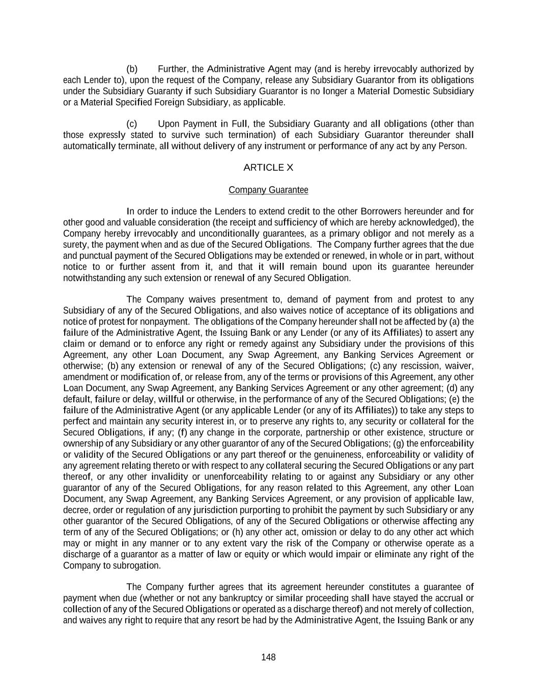 148 (b) Further, the Administrative Agent may (and is hereby irrevocably authorized by each Lender to), upon the request of the Company, release any Subsidiary Guarantor from its obligations under the Subsidiary Guaranty if such Subsidiary Guarantor is no longer a Material Domestic Subsidiary or a Material Specified Foreign Subsidiary, as applicable. (c) Upon Payment in Full, the Subsidiary Guaranty and all obligations (other than those expressly stated to survive such termination) of each Subsidiary Guarantor thereunder shall automatically terminate, all without delivery of any instrument or performance of any act by any Person. ARTICLE X Company Guarantee In order to induce the Lenders to extend credit to the other Borrowers hereunder and for other good and valuable consideration (the receipt and sufficiency of which are hereby acknowledged), the Company hereby irrevocably and unconditionally guarantees, as a primary obligor and not merely as a surety, the payment when and as due of the Secured Obligations. The Company further agrees that the due and punctual payment of the Secured Obligations may be extended or renewed, in whole or in part, without notice to or further assent from it, and that it will remain bound upon its guarantee hereunder notwithstanding any such extension or renewal of any Secured Obligation. The Company waives presentment to, demand of payment from and protest to any Subsidiary of any of the Secured Obligations, and also waives notice of acceptance of its obligations and notice of protest for nonpayment. The obligations of the Company hereunder shall not be affected by (a) the failure of the Administrative Agent, the Issuing Bank or any Lender (or any of its Affiliates) to assert any claim or demand or to enforce any right or remedy against any Subsidiary under the provisions of this Agreement, any other Loan Document, any Swap Agreement, any Banking Services Agreement or otherwise; (b) any extension or renewal of any of the Secured Obligations; (c) any rescission, waiver, amendment or modification of, or release from, any of the terms or provisions of this Agreement, any other Loan Document, any Swap Agreement, any Banking Services Agreement or any other agreement; (d) any default, failure or delay, willful or otherwise, in the performance of any of the Secured Obligations; (e) the failure of the Administrative Agent (or any applicable Lender (or any of its Affiliates)) to take any steps to perfect and maintain any security interest in, or to preserve any rights to, any security or collateral for the Secured Obligations, if any; (f) any change in the corporate, partnership or other existence, structure or ownership of any Subsidiary or any other guarantor of any of the Secured Obligations; (g) the enforceability or validity of the Secured Obligations or any part thereof or the genuineness, enforceability or validity of any agreement relating thereto or with respect to any collateral securing the Secured Obligations or any part thereof, or any other invalidity or unenforceability relating to or against any Subsidiary or any other guarantor of any of the Secured Obligations, for any reason related to this Agreement, any other Loan Document, any Swap Agreement, any Banking Services Agreement, or any provision of applicable law, decree, order or regulation of any jurisdiction purporting to prohibit the payment by such Subsidiary or any other guarantor of the Secured Obligations, of any of the Secured Obligations or otherwise affecting any term of any of the Secured Obligations; or (h) any other act, omission or delay to do any other act which may or might in any manner or to any extent vary the risk of the Company or otherwise operate as a discharge of a guarantor as a matter of law or equity or which would impair or eliminate any right of the Company to subrogation. The Company further agrees that its agreement hereunder constitutes a guarantee of payment when due (whether or not any bankruptcy or similar proceeding shall have stayed the accrual or collection of any of the Secured Obligations or operated as a discharge thereof) and not merely of collection, and waives any right to require that any resort be had by the Administrative Agent, the Issuing Bank or any