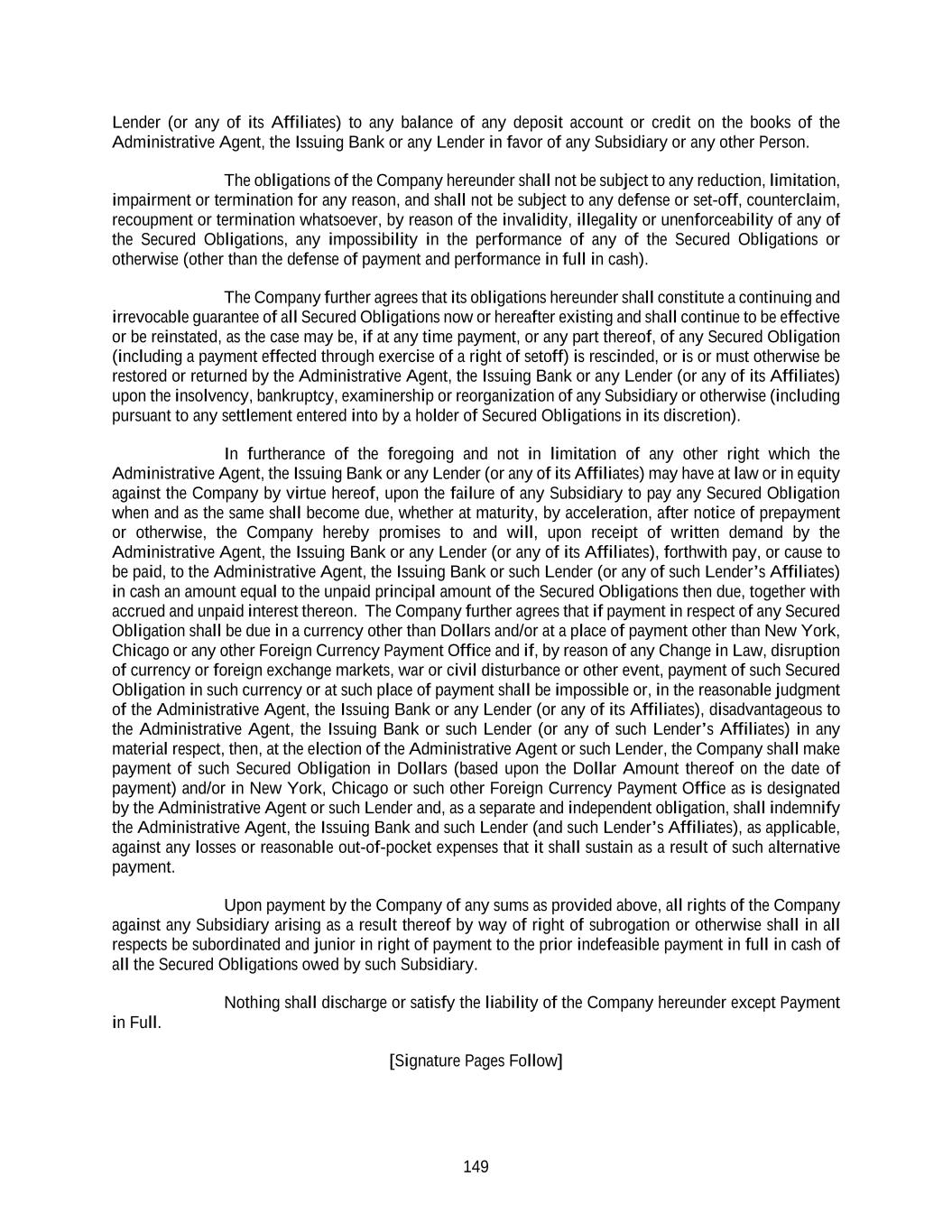 149 Lender (or any of its Affiliates) to any balance of any deposit account or credit on the books of the Administrative Agent, the Issuing Bank or any Lender in favor of any Subsidiary or any other Person. The obligations of the Company hereunder shall not be subject to any reduction, limitation, impairment or termination for any reason, and shall not be subject to any defense or set-off, counterclaim, recoupment or termination whatsoever, by reason of the invalidity, illegality or unenforceability of any of the Secured Obligations, any impossibility in the performance of any of the Secured Obligations or otherwise (other than the defense of payment and performance in full in cash). The Company further agrees that its obligations hereunder shall constitute a continuing and irrevocable guarantee of all Secured Obligations now or hereafter existing and shall continue to be effective or be reinstated, as the case may be, if at any time payment, or any part thereof, of any Secured Obligation (including a payment effected through exercise of a right of setoff) is rescinded, or is or must otherwise be restored or returned by the Administrative Agent, the Issuing Bank or any Lender (or any of its Affiliates) upon the insolvency, bankruptcy, examinership or reorganization of any Subsidiary or otherwise (including pursuant to any settlement entered into by a holder of Secured Obligations in its discretion). In furtherance of the foregoing and not in limitation of any other right which the Administrative Agent, the Issuing Bank or any Lender (or any of its Affiliates) may have at law or in equity against the Company by virtue hereof, upon the failure of any Subsidiary to pay any Secured Obligation when and as the same shall become due, whether at maturity, by acceleration, after notice of prepayment or otherwise, the Company hereby promises to and will, upon receipt of written demand by the Administrative Agent, the Issuing Bank or any Lender (or any of its Affiliates), forthwith pay, or cause to be paid, to the Administrative Agent, the Issuing Bank or such Lender (or any of such Lender’s Affiliates) in cash an amount equal to the unpaid principal amount of the Secured Obligations then due, together with accrued and unpaid interest thereon. The Company further agrees that if payment in respect of any Secured Obligation shall be due in a currency other than Dollars and/or at a place of payment other than New York, Chicago or any other Foreign Currency Payment Office and if, by reason of any Change in Law, disruption of currency or foreign exchange markets, war or civil disturbance or other event, payment of such Secured Obligation in such currency or at such place of payment shall be impossible or, in the reasonable judgment of the Administrative Agent, the Issuing Bank or any Lender (or any of its Affiliates), disadvantageous to the Administrative Agent, the Issuing Bank or such Lender (or any of such Lender’s Affiliates) in any material respect, then, at the election of the Administrative Agent or such Lender, the Company shall make payment of such Secured Obligation in Dollars (based upon the Dollar Amount thereof on the date of payment) and/or in New York, Chicago or such other Foreign Currency Payment Office as is designated by the Administrative Agent or such Lender and, as a separate and independent obligation, shall indemnify the Administrative Agent, the Issuing Bank and such Lender (and such Lender’s Affiliates), as applicable, against any losses or reasonable out-of-pocket expenses that it shall sustain as a result of such alternative payment. Upon payment by the Company of any sums as provided above, all rights of the Company against any Subsidiary arising as a result thereof by way of right of subrogation or otherwise shall in all respects be subordinated and junior in right of payment to the prior indefeasible payment in full in cash of all the Secured Obligations owed by such Subsidiary. Nothing shall discharge or satisfy the liability of the Company hereunder except Payment in Full. [Signature Pages Follow]