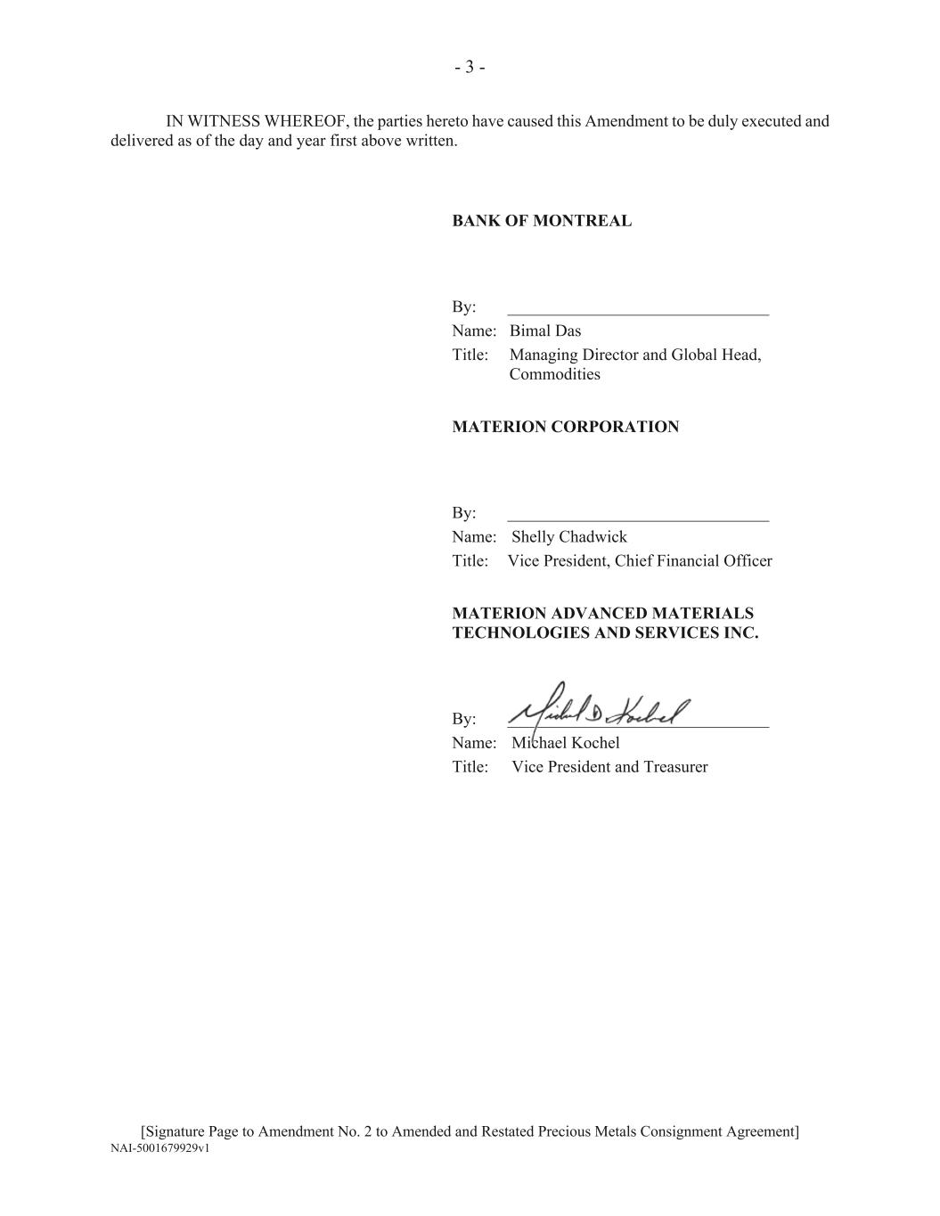 NAI-5001679929v1 - 3 - [Signature Page to Amendment No. 2 to Amended and Restated Precious Metals Consignment Agreement] IN WITNESS WHEREOF, the parties hereto have caused this Amendment to be duly executed and delivered as of the day and year first above written. BANK OF MONTREAL By: _______________________________ Name: Bimal Das Title: Managing Director and Global Head, Commodities MATERION CORPORATION By: _______________________________ Name: Shelly Chadwick Title: Vice President, Chief Financial Officer MATERION ADVANCED MATERIALS TECHNOLOGIES AND SERVICES INC. By: _______________________________ Name: Michael Kochel Title: Vice President and Treasurer