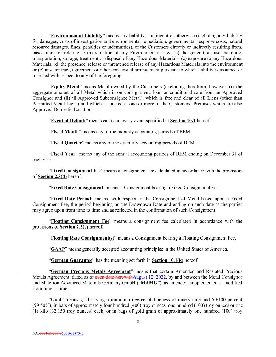 NAI-5001621302v25001621479v5 -8- “Environmental Liability” means any liability, contingent or otherwise (including any liability for damages, costs of investigation and environmental remediation, governmental response costs, natural resource damages, fines, penalties or indemnities), of the Customers directly or indirectly resulting from, based upon or relating to (a) violation of any Environmental Law, (b) the generation, use, handling, transportation, storage, treatment or disposal of any Hazardous Materials, (c) exposure to any Hazardous Materials, (d) the presence, release or threatened release of any Hazardous Materials into the environment or (e) any contract, agreement or other consensual arrangement pursuant to which liability is assumed or imposed with respect to any of the foregoing. “Equity Metal” means Metal owned by the Customers (excluding therefrom, however, (i) the aggregate amount of all Metal which is on consignment, loan or conditional sale from an Approved Consignor and (ii) all Approved Subconsignee Metal), which is free and clear of all Liens (other than Permitted Metal Liens) and which is located at one or more of the Customers’ Premises which are also Approved Domestic Locations. “Event of Default” means each and every event specified in Section 10.1 hereof. “Fiscal Month” means any of the monthly accounting periods of BEM. “Fiscal Quarter” means any of the quarterly accounting periods of BEM. “Fiscal Year” means any of the annual accounting periods of BEM ending on December 31 of each year. “Fixed Consignment Fee” means a consignment fee calculated in accordance with the provisions of Section 2.3(d) hereof. “Fixed Rate Consignment” means a Consignment bearing a Fixed Consignment Fee. “Fixed Rate Period” means, with respect to the Consignment of Metal based upon a Fixed Consignment Fee, the period beginning on the Drawdown Date and ending on such date as the parties may agree upon from time to time and as reflected in the confirmation of such Consignment. “Floating Consignment Fee” means a consignment fee calculated in accordance with the provisions of Section 2.3(c) hereof. “Floating Rate Consignment(s)” means a Consignment bearing a Floating Consignment Fee. “GAAP” means generally accepted accounting principles in the United States of America. “German Guarantee” has the meaning set forth in Section 10.1(k) hereof. “German Precious Metals Agreement” means that certain Amended and Restated Precious Metals Agreement, dated as of even date herewithAugust 12, 2022, by and between the Metal Consignor and Materion Advanced Materials Germany GmbH (“MAMG”), as amended, supplemented or modified from time to time. “Gold” means gold having a minimum degree of fineness of ninety-nine and 50/100 percent (99.50%), in bars of approximately four hundred (400) troy ounces, one hundred (100) troy ounces or one (1) kilo (32.150 troy ounces) each, or in bags of gold grain of approximately one hundred (100) troy