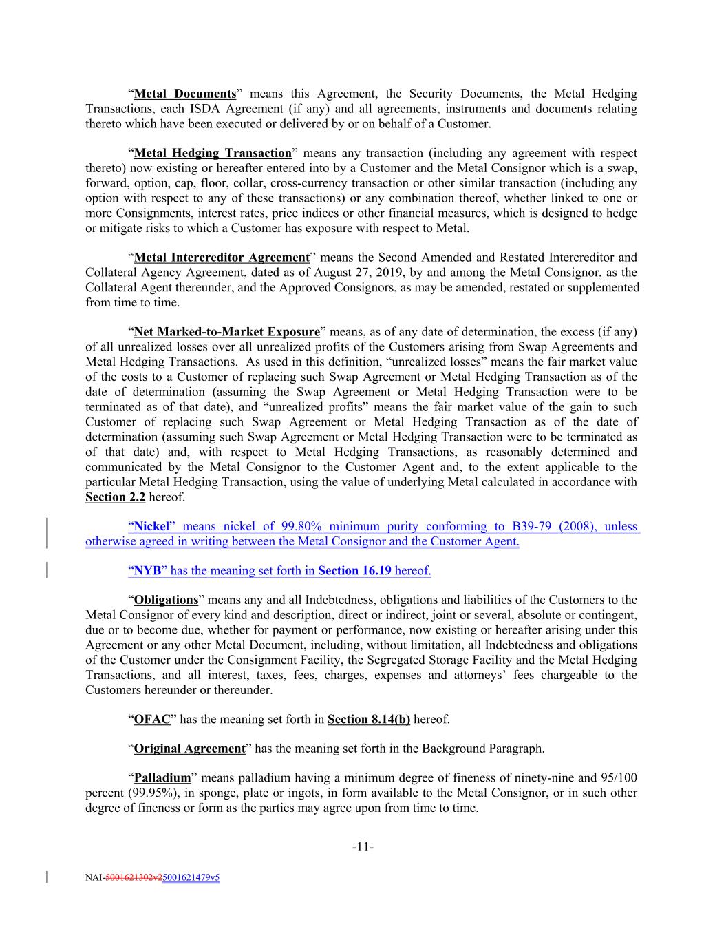 NAI-5001621302v25001621479v5 -11- “Metal Documents” means this Agreement, the Security Documents, the Metal Hedging Transactions, each ISDA Agreement (if any) and all agreements, instruments and documents relating thereto which have been executed or delivered by or on behalf of a Customer. “Metal Hedging Transaction” means any transaction (including any agreement with respect thereto) now existing or hereafter entered into by a Customer and the Metal Consignor which is a swap, forward, option, cap, floor, collar, cross-currency transaction or other similar transaction (including any option with respect to any of these transactions) or any combination thereof, whether linked to one or more Consignments, interest rates, price indices or other financial measures, which is designed to hedge or mitigate risks to which a Customer has exposure with respect to Metal. “Metal Intercreditor Agreement” means the Second Amended and Restated Intercreditor and Collateral Agency Agreement, dated as of August 27, 2019, by and among the Metal Consignor, as the Collateral Agent thereunder, and the Approved Consignors, as may be amended, restated or supplemented from time to time. “Net Marked-to-Market Exposure” means, as of any date of determination, the excess (if any) of all unrealized losses over all unrealized profits of the Customers arising from Swap Agreements and Metal Hedging Transactions. As used in this definition, “unrealized losses” means the fair market value of the costs to a Customer of replacing such Swap Agreement or Metal Hedging Transaction as of the date of determination (assuming the Swap Agreement or Metal Hedging Transaction were to be terminated as of that date), and “unrealized profits” means the fair market value of the gain to such Customer of replacing such Swap Agreement or Metal Hedging Transaction as of the date of determination (assuming such Swap Agreement or Metal Hedging Transaction were to be terminated as of that date) and, with respect to Metal Hedging Transactions, as reasonably determined and communicated by the Metal Consignor to the Customer Agent and, to the extent applicable to the particular Metal Hedging Transaction, using the value of underlying Metal calculated in accordance with Section 2.2 hereof. “Nickel” means nickel of 99.80% minimum purity conforming to B39-79 (2008), unless otherwise agreed in writing between the Metal Consignor and the Customer Agent. “NYB” has the meaning set forth in Section 16.19 hereof. “Obligations” means any and all Indebtedness, obligations and liabilities of the Customers to the Metal Consignor of every kind and description, direct or indirect, joint or several, absolute or contingent, due or to become due, whether for payment or performance, now existing or hereafter arising under this Agreement or any other Metal Document, including, without limitation, all Indebtedness and obligations of the Customer under the Consignment Facility, the Segregated Storage Facility and the Metal Hedging Transactions, and all interest, taxes, fees, charges, expenses and attorneys’ fees chargeable to the Customers hereunder or thereunder. “OFAC” has the meaning set forth in Section 8.14(b) hereof. “Original Agreement” has the meaning set forth in the Background Paragraph. “Palladium” means palladium having a minimum degree of fineness of ninety-nine and 95/100 percent (99.95%), in sponge, plate or ingots, in form available to the Metal Consignor, or in such other degree of fineness or form as the parties may agree upon from time to time.