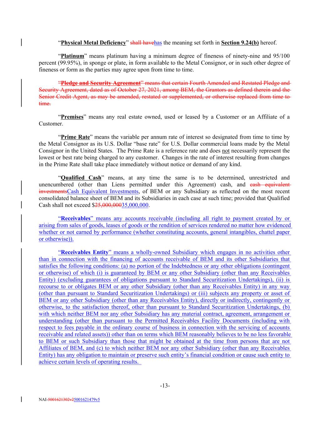 NAI-5001621302v25001621479v5 -13- “Physical Metal Deficiency” shall havehas the meaning set forth in Section 9.24(b) hereof. “Platinum” means platinum having a minimum degree of fineness of ninety-nine and 95/100 percent (99.95%), in sponge or plate, in form available to the Metal Consignor, or in such other degree of fineness or form as the parties may agree upon from time to time. “Pledge and Security Agreement” means that certain Fourth Amended and Restated Pledge and Security Agreement, dated as of October 27, 2021, among BEM, the Grantors as defined therein and the Senior Credit Agent, as may be amended, restated or supplemented, or otherwise replaced from time to time. “Premises” means any real estate owned, used or leased by a Customer or an Affiliate of a Customer. “Prime Rate” means the variable per annum rate of interest so designated from time to time by the Metal Consignor as its U.S. Dollar “base rate” for U.S. Dollar commercial loans made by the Metal Consignor in the United States. The Prime Rate is a reference rate and does not necessarily represent the lowest or best rate being charged to any customer. Changes in the rate of interest resulting from changes in the Prime Rate shall take place immediately without notice or demand of any kind. “Qualified Cash” means, at any time the same is to be determined, unrestricted and unencumbered (other than Liens permitted under this Agreement) cash, and cash equivalent investmentsCash Equivalent Investments, of BEM or any Subsidiary as reflected on the most recent consolidated balance sheet of BEM and its Subsidiaries in each case at such time; provided that Qualified Cash shall not exceed $25,000,00035,000,000. “Receivables” means any accounts receivable (including all right to payment created by or arising from sales of goods, leases of goods or the rendition of services rendered no matter how evidenced whether or not earned by performance (whether constituting accounts, general intangibles, chattel paper or otherwise)). “Receivables Entity” means a wholly-owned Subsidiary which engages in no activities other than in connection with the financing of accounts receivable of BEM and its other Subsidiaries that satisfies the following conditions: (a) no portion of the Indebtedness or any other obligations (contingent or otherwise) of which (i) is guaranteed by BEM or any other Subsidiary (other than any Receivables Entity) (excluding guarantees of obligations pursuant to Standard Securitization Undertakings), (ii) is recourse to or obligates BEM or any other Subsidiary (other than any Receivables Entity) in any way (other than pursuant to Standard Securitization Undertakings) or (iii) subjects any property or asset of BEM or any other Subsidiary (other than any Receivables Entity), directly or indirectly, contingently or otherwise, to the satisfaction thereof, other than pursuant to Standard Securitization Undertakings, (b) with which neither BEM nor any other Subsidiary has any material contract, agreement, arrangement or understanding (other than pursuant to the Permitted Receivables Facility Documents (including with respect to fees payable in the ordinary course of business in connection with the servicing of accounts receivable and related assets)) other than on terms which BEM reasonably believes to be no less favorable to BEM or such Subsidiary than those that might be obtained at the time from persons that are not Affiliates of BEM, and (c) to which neither BEM nor any other Subsidiary (other than any Receivables Entity) has any obligation to maintain or preserve such entity’s financial condition or cause such entity to achieve certain levels of operating results.