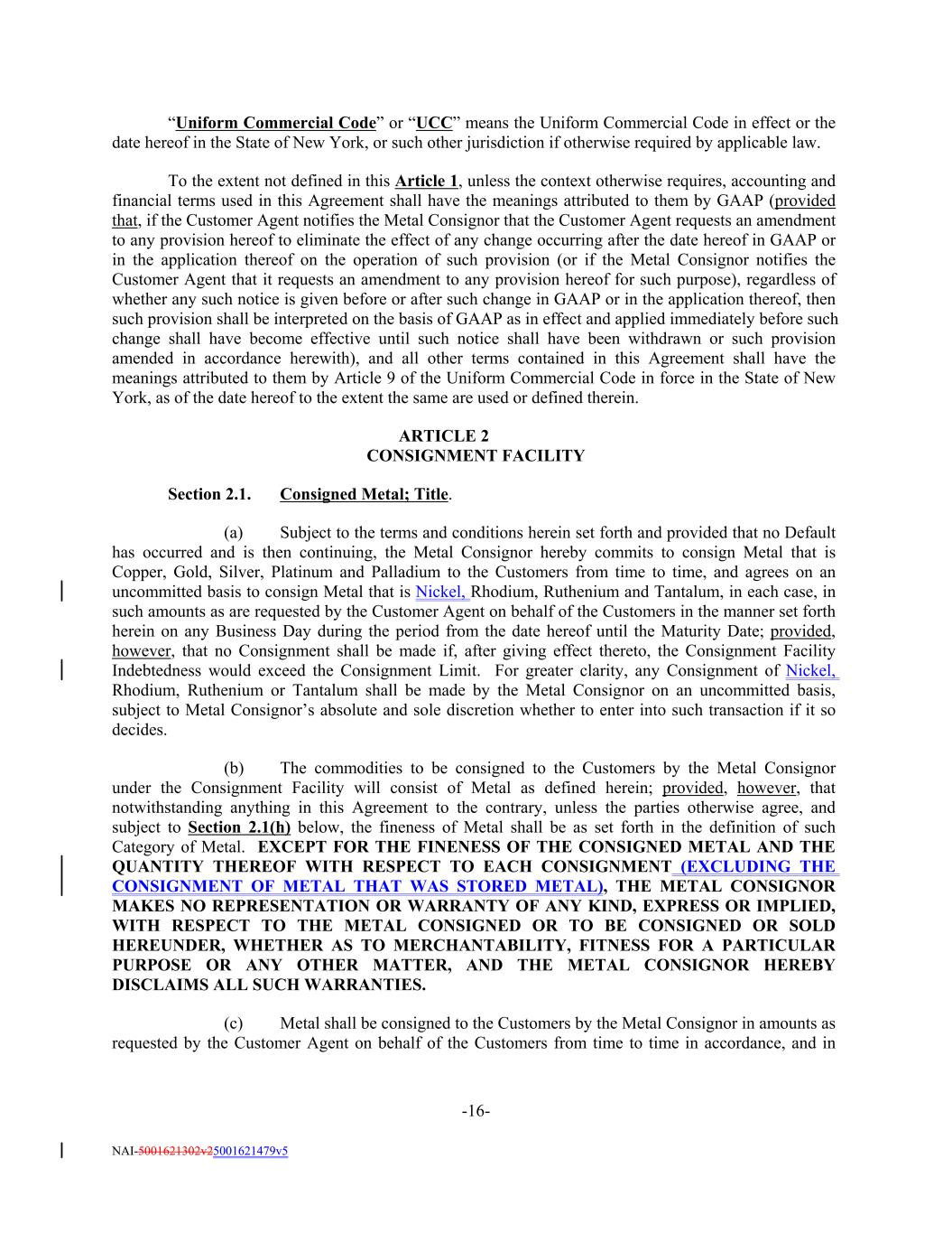 NAI-5001621302v25001621479v5 -16- “Uniform Commercial Code” or “UCC” means the Uniform Commercial Code in effect or the date hereof in the State of New York, or such other jurisdiction if otherwise required by applicable law. To the extent not defined in this Article 1, unless the context otherwise requires, accounting and financial terms used in this Agreement shall have the meanings attributed to them by GAAP (provided that, if the Customer Agent notifies the Metal Consignor that the Customer Agent requests an amendment to any provision hereof to eliminate the effect of any change occurring after the date hereof in GAAP or in the application thereof on the operation of such provision (or if the Metal Consignor notifies the Customer Agent that it requests an amendment to any provision hereof for such purpose), regardless of whether any such notice is given before or after such change in GAAP or in the application thereof, then such provision shall be interpreted on the basis of GAAP as in effect and applied immediately before such change shall have become effective until such notice shall have been withdrawn or such provision amended in accordance herewith), and all other terms contained in this Agreement shall have the meanings attributed to them by Article 9 of the Uniform Commercial Code in force in the State of New York, as of the date hereof to the extent the same are used or defined therein. ARTICLE 2 CONSIGNMENT FACILITY Section 2.1. Consigned Metal; Title. (a) Subject to the terms and conditions herein set forth and provided that no Default has occurred and is then continuing, the Metal Consignor hereby commits to consign Metal that is Copper, Gold, Silver, Platinum and Palladium to the Customers from time to time, and agrees on an uncommitted basis to consign Metal that is Nickel, Rhodium, Ruthenium and Tantalum, in each case, in such amounts as are requested by the Customer Agent on behalf of the Customers in the manner set forth herein on any Business Day during the period from the date hereof until the Maturity Date; provided, however, that no Consignment shall be made if, after giving effect thereto, the Consignment Facility Indebtedness would exceed the Consignment Limit. For greater clarity, any Consignment of Nickel, Rhodium, Ruthenium or Tantalum shall be made by the Metal Consignor on an uncommitted basis, subject to Metal Consignor’s absolute and sole discretion whether to enter into such transaction if it so decides. (b) The commodities to be consigned to the Customers by the Metal Consignor under the Consignment Facility will consist of Metal as defined herein; provided, however, that notwithstanding anything in this Agreement to the contrary, unless the parties otherwise agree, and subject to Section 2.1(h) below, the fineness of Metal shall be as set forth in the definition of such Category of Metal. EXCEPT FOR THE FINENESS OF THE CONSIGNED METAL AND THE QUANTITY THEREOF WITH RESPECT TO EACH CONSIGNMENT (EXCLUDING THE CONSIGNMENT OF METAL THAT WAS STORED METAL), THE METAL CONSIGNOR MAKES NO REPRESENTATION OR WARRANTY OF ANY KIND, EXPRESS OR IMPLIED, WITH RESPECT TO THE METAL CONSIGNED OR TO BE CONSIGNED OR SOLD HEREUNDER, WHETHER AS TO MERCHANTABILITY, FITNESS FOR A PARTICULAR PURPOSE OR ANY OTHER MATTER, AND THE METAL CONSIGNOR HEREBY DISCLAIMS ALL SUCH WARRANTIES. (c) Metal shall be consigned to the Customers by the Metal Consignor in amounts as requested by the Customer Agent on behalf of the Customers from time to time in accordance, and in