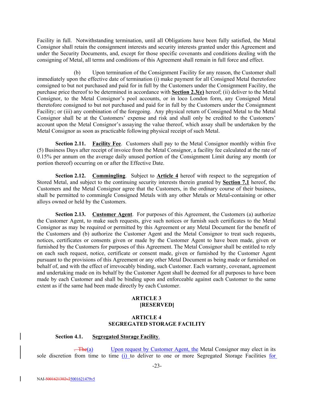NAI-5001621302v25001621479v5 -23- Facility in full. Notwithstanding termination, until all Obligations have been fully satisfied, the Metal Consignor shall retain the consignment interests and security interests granted under this Agreement and under the Security Documents, and, except for those specific covenants and conditions dealing with the consigning of Metal, all terms and conditions of this Agreement shall remain in full force and effect. (b) Upon termination of the Consignment Facility for any reason, the Customer shall immediately upon the effective date of termination (i) make payment for all Consigned Metal theretofore consigned to but not purchased and paid for in full by the Customers under the Consignment Facility, the purchase price thereof to be determined in accordance with Section 2.3(e) hereof; (ii) deliver to the Metal Consignor, to the Metal Consignor’s pool accounts, or in loco London form, any Consigned Metal theretofore consigned to but not purchased and paid for in full by the Customers under the Consignment Facility; or (iii) any combination of the foregoing. Any physical return of Consigned Metal to the Metal Consignor shall be at the Customers’ expense and risk and shall only be credited to the Customers’ account upon the Metal Consignor’s assaying the value thereof, which assay shall be undertaken by the Metal Consignor as soon as practicable following physical receipt of such Metal. Section 2.11. Facility Fee. Customers shall pay to the Metal Consignor monthly within five (5) Business Days after receipt of invoice from the Metal Consignor, a facility fee calculated at the rate of 0.15% per annum on the average daily unused portion of the Consignment Limit during any month (or portion thereof) occurring on or after the Effective Date. Section 2.12. Commingling. Subject to Article 4 hereof with respect to the segregation of Stored Metal, and subject to the continuing security interests therein granted by Section 7.1 hereof, the Customers and the Metal Consignor agree that the Customers, in the ordinary course of their business, shall be permitted to commingle Consigned Metals with any other Metals or Metal-containing or other alloys owned or held by the Customers. Section 2.13. Customer Agent. For purposes of this Agreement, the Customers (a) authorize the Customer Agent, to make such requests, give such notices or furnish such certificates to the Metal Consignor as may be required or permitted by this Agreement or any Metal Document for the benefit of the Customers and (b) authorize the Customer Agent and the Metal Consignor to treat such requests, notices, certificates or consents given or made by the Customer Agent to have been made, given or furnished by the Customers for purposes of this Agreement. The Metal Consignor shall be entitled to rely on each such request, notice, certificate or consent made, given or furnished by the Customer Agent pursuant to the provisions of this Agreement or any other Metal Document as being made or furnished on behalf of, and with the effect of irrevocably binding, such Customer. Each warranty, covenant, agreement and undertaking made on its behalf by the Customer Agent shall be deemed for all purposes to have been made by each Customer and shall be binding upon and enforceable against each Customer to the same extent as if the same had been made directly by each Customer. ARTICLE 3 [RESERVED] ARTICLE 4 SEGREGATED STORAGE FACILITY Section 4.1. Segregated Storage Facility. . The(a) Upon request by Customer Agent, the Metal Consignor may elect in its sole discretion from time to time (i) to deliver to one or more Segregated Storage Facilities for