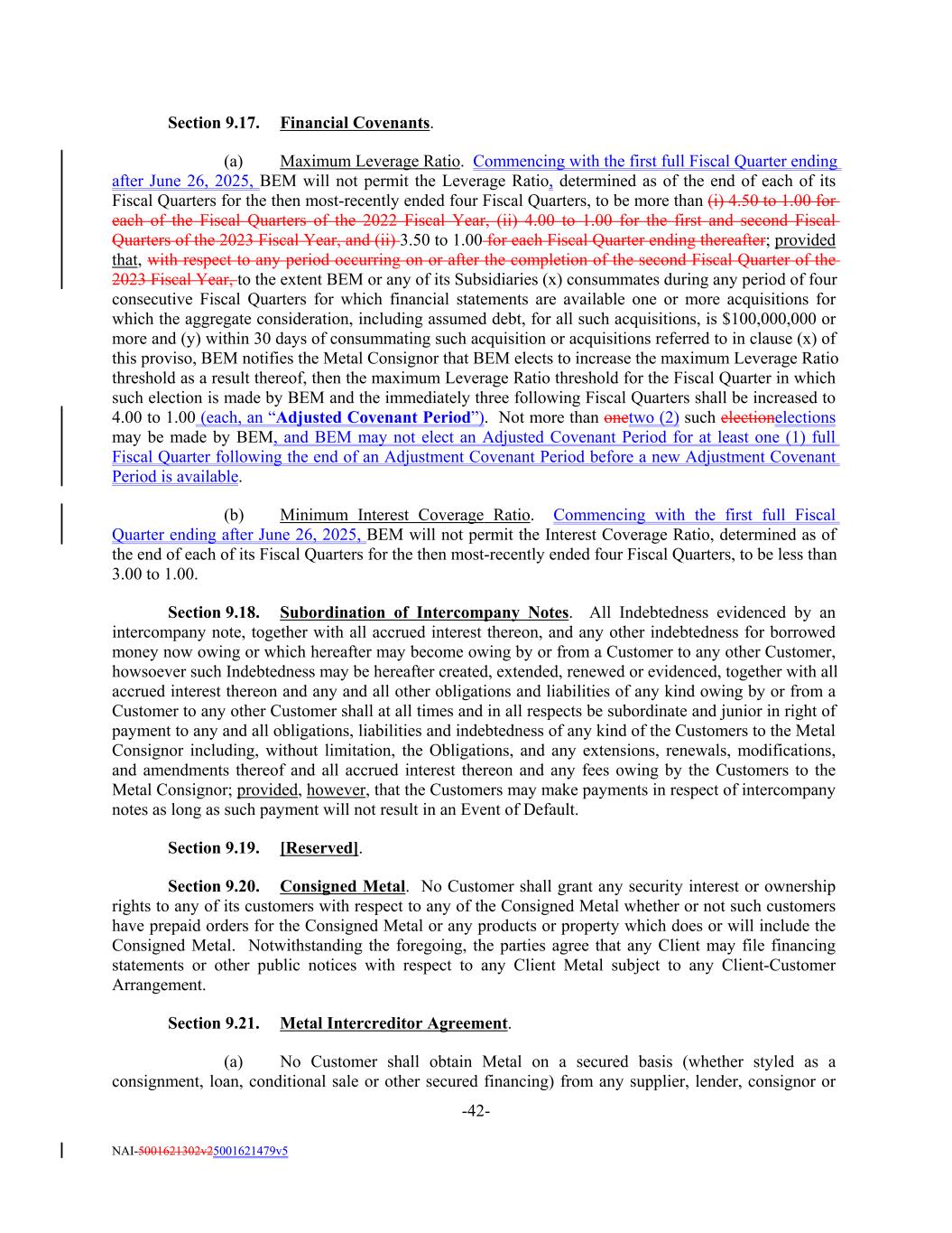 NAI-5001621302v25001621479v5 -42- Section 9.17. Financial Covenants. (a) Maximum Leverage Ratio. Commencing with the first full Fiscal Quarter ending after June 26, 2025, BEM will not permit the Leverage Ratio, determined as of the end of each of its Fiscal Quarters for the then most-recently ended four Fiscal Quarters, to be more than (i) 4.50 to 1.00 for each of the Fiscal Quarters of the 2022 Fiscal Year, (ii) 4.00 to 1.00 for the first and second Fiscal Quarters of the 2023 Fiscal Year, and (ii) 3.50 to 1.00 for each Fiscal Quarter ending thereafter; provided that, with respect to any period occurring on or after the completion of the second Fiscal Quarter of the 2023 Fiscal Year, to the extent BEM or any of its Subsidiaries (x) consummates during any period of four consecutive Fiscal Quarters for which financial statements are available one or more acquisitions for which the aggregate consideration, including assumed debt, for all such acquisitions, is $100,000,000 or more and (y) within 30 days of consummating such acquisition or acquisitions referred to in clause (x) of this proviso, BEM notifies the Metal Consignor that BEM elects to increase the maximum Leverage Ratio threshold as a result thereof, then the maximum Leverage Ratio threshold for the Fiscal Quarter in which such election is made by BEM and the immediately three following Fiscal Quarters shall be increased to 4.00 to 1.00 (each, an “Adjusted Covenant Period”). Not more than onetwo (2) such electionelections may be made by BEM, and BEM may not elect an Adjusted Covenant Period for at least one (1) full Fiscal Quarter following the end of an Adjustment Covenant Period before a new Adjustment Covenant Period is available. (b) Minimum Interest Coverage Ratio. Commencing with the first full Fiscal Quarter ending after June 26, 2025, BEM will not permit the Interest Coverage Ratio, determined as of the end of each of its Fiscal Quarters for the then most-recently ended four Fiscal Quarters, to be less than 3.00 to 1.00. Section 9.18. Subordination of Intercompany Notes. All Indebtedness evidenced by an intercompany note, together with all accrued interest thereon, and any other indebtedness for borrowed money now owing or which hereafter may become owing by or from a Customer to any other Customer, howsoever such Indebtedness may be hereafter created, extended, renewed or evidenced, together with all accrued interest thereon and any and all other obligations and liabilities of any kind owing by or from a Customer to any other Customer shall at all times and in all respects be subordinate and junior in right of payment to any and all obligations, liabilities and indebtedness of any kind of the Customers to the Metal Consignor including, without limitation, the Obligations, and any extensions, renewals, modifications, and amendments thereof and all accrued interest thereon and any fees owing by the Customers to the Metal Consignor; provided, however, that the Customers may make payments in respect of intercompany notes as long as such payment will not result in an Event of Default. Section 9.19. [Reserved]. Section 9.20. Consigned Metal. No Customer shall grant any security interest or ownership rights to any of its customers with respect to any of the Consigned Metal whether or not such customers have prepaid orders for the Consigned Metal or any products or property which does or will include the Consigned Metal. Notwithstanding the foregoing, the parties agree that any Client may file financing statements or other public notices with respect to any Client Metal subject to any Client-Customer Arrangement. Section 9.21. Metal Intercreditor Agreement. (a) No Customer shall obtain Metal on a secured basis (whether styled as a consignment, loan, conditional sale or other secured financing) from any supplier, lender, consignor or
