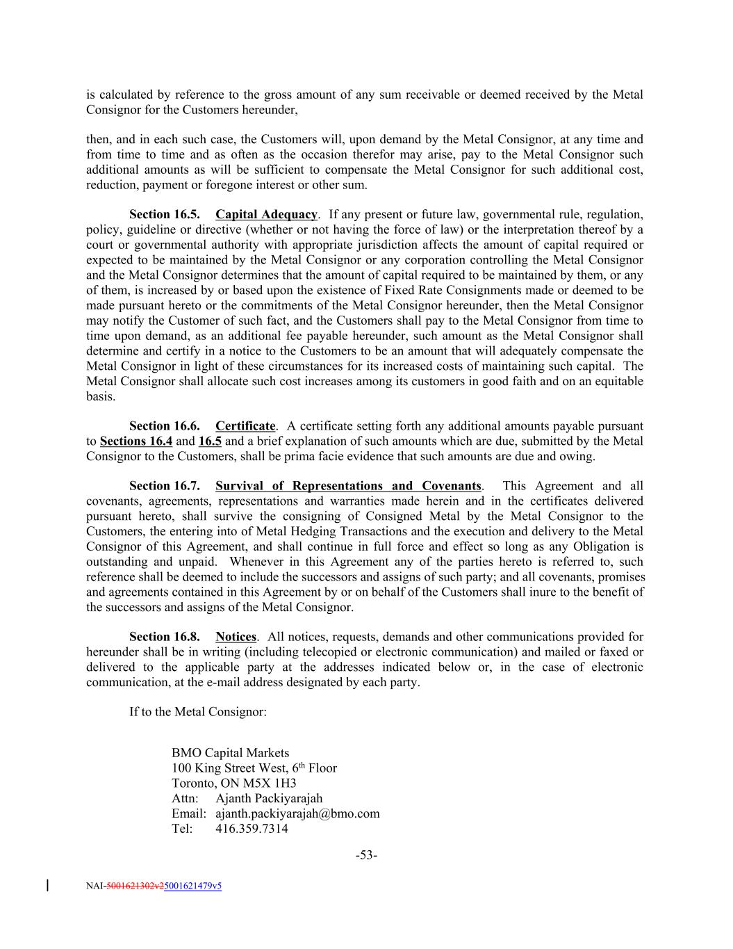NAI-5001621302v25001621479v5 -53- is calculated by reference to the gross amount of any sum receivable or deemed received by the Metal Consignor for the Customers hereunder, then, and in each such case, the Customers will, upon demand by the Metal Consignor, at any time and from time to time and as often as the occasion therefor may arise, pay to the Metal Consignor such additional amounts as will be sufficient to compensate the Metal Consignor for such additional cost, reduction, payment or foregone interest or other sum. Section 16.5. Capital Adequacy. If any present or future law, governmental rule, regulation, policy, guideline or directive (whether or not having the force of law) or the interpretation thereof by a court or governmental authority with appropriate jurisdiction affects the amount of capital required or expected to be maintained by the Metal Consignor or any corporation controlling the Metal Consignor and the Metal Consignor determines that the amount of capital required to be maintained by them, or any of them, is increased by or based upon the existence of Fixed Rate Consignments made or deemed to be made pursuant hereto or the commitments of the Metal Consignor hereunder, then the Metal Consignor may notify the Customer of such fact, and the Customers shall pay to the Metal Consignor from time to time upon demand, as an additional fee payable hereunder, such amount as the Metal Consignor shall determine and certify in a notice to the Customers to be an amount that will adequately compensate the Metal Consignor in light of these circumstances for its increased costs of maintaining such capital. The Metal Consignor shall allocate such cost increases among its customers in good faith and on an equitable basis. Section 16.6. Certificate. A certificate setting forth any additional amounts payable pursuant to Sections 16.4 and 16.5 and a brief explanation of such amounts which are due, submitted by the Metal Consignor to the Customers, shall be prima facie evidence that such amounts are due and owing. Section 16.7. Survival of Representations and Covenants. This Agreement and all covenants, agreements, representations and warranties made herein and in the certificates delivered pursuant hereto, shall survive the consigning of Consigned Metal by the Metal Consignor to the Customers, the entering into of Metal Hedging Transactions and the execution and delivery to the Metal Consignor of this Agreement, and shall continue in full force and effect so long as any Obligation is outstanding and unpaid. Whenever in this Agreement any of the parties hereto is referred to, such reference shall be deemed to include the successors and assigns of such party; and all covenants, promises and agreements contained in this Agreement by or on behalf of the Customers shall inure to the benefit of the successors and assigns of the Metal Consignor. Section 16.8. Notices. All notices, requests, demands and other communications provided for hereunder shall be in writing (including telecopied or electronic communication) and mailed or faxed or delivered to the applicable party at the addresses indicated below or, in the case of electronic communication, at the e-mail address designated by each party. If to the Metal Consignor: BMO Capital Markets 100 King Street West, 6th Floor Toronto, ON M5X 1H3 Attn: Ajanth Packiyarajah Email: ajanth.packiyarajah@bmo.com Tel: 416.359.7314