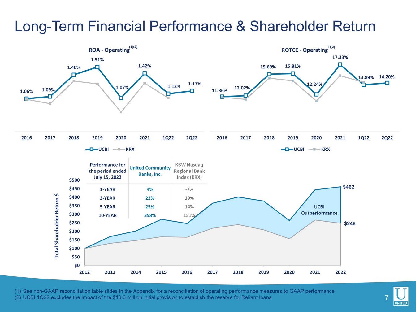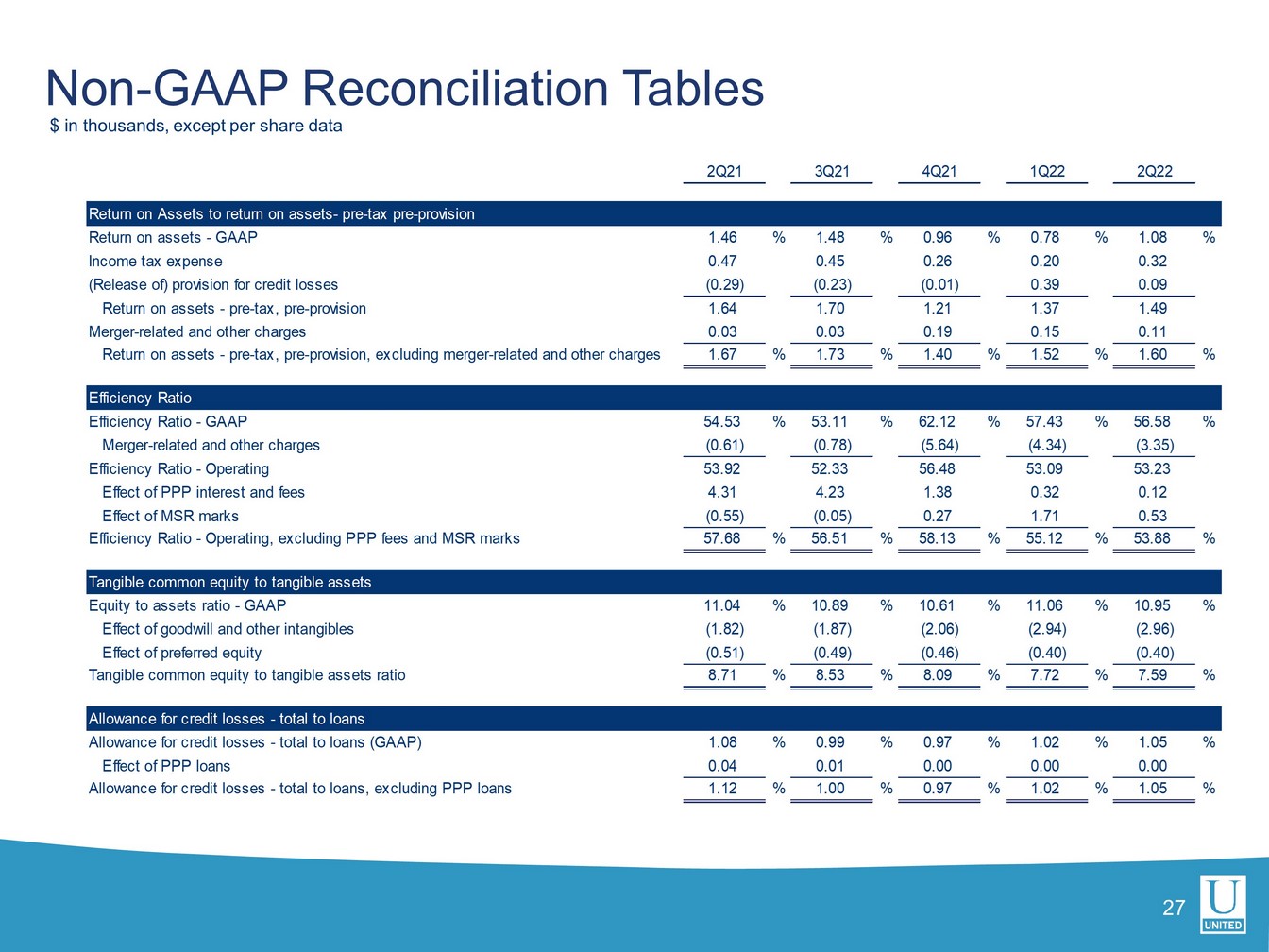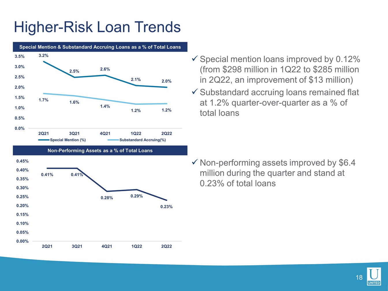 ユナイテッドの第2四半期の総資産利益率(ROA)は1.08%、普通株主資本利益率は9.31%でした。営業利益ベースでは、ROAは1.17%、有形普通株式利益率は14.20%でした。合併関連費用およびその他の費用を除いたユナイテッドの税引前ROAは、1.60%でした。