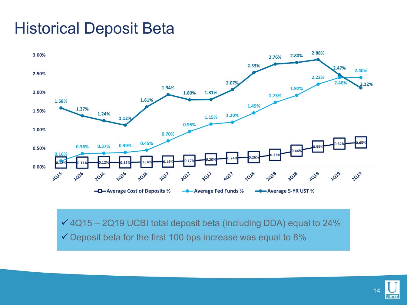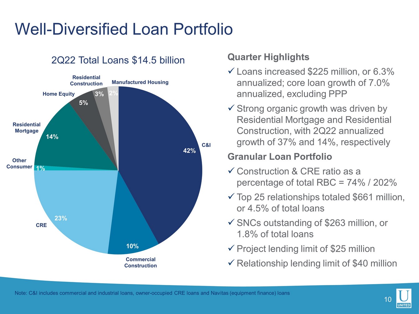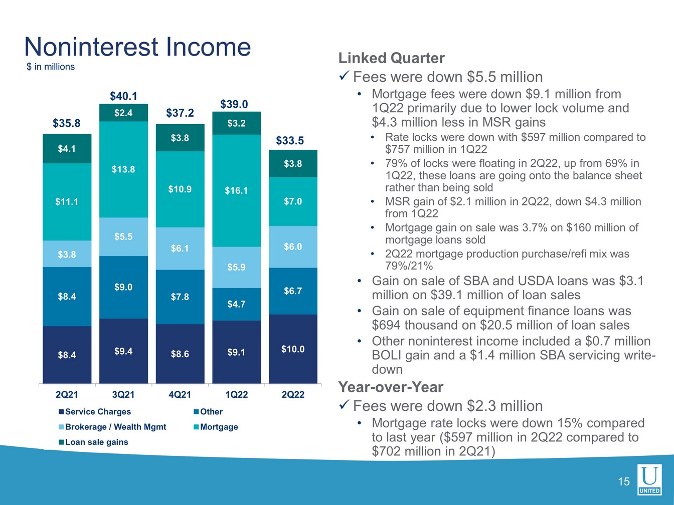 ユナイテッドの第2四半期の総資産利益率(ROA)は1.08%、普通株主資本利益率は9.31%でした。営業利益ベースでは、ROAは1.17%、有形普通株式利益率は14.20%でした。合併関連費用およびその他の費用を除いたユナイテッドの税引前ROAは、1.60%でした。