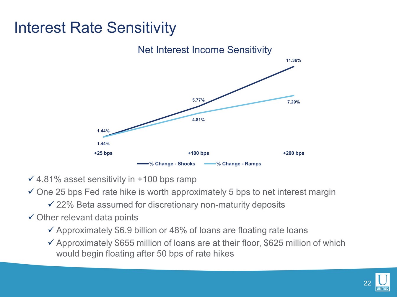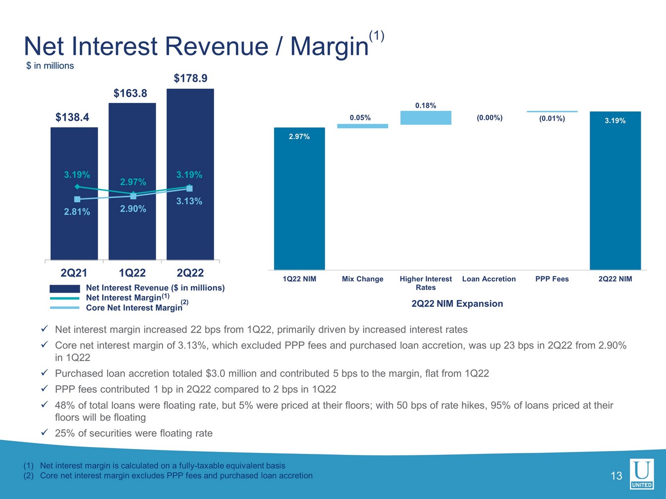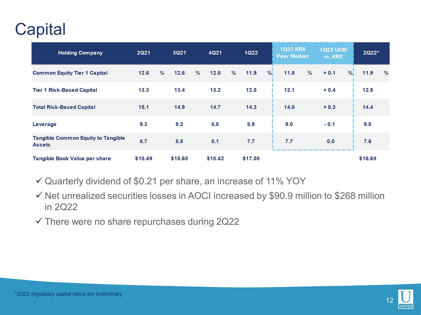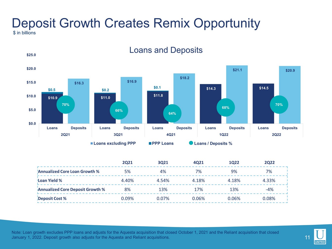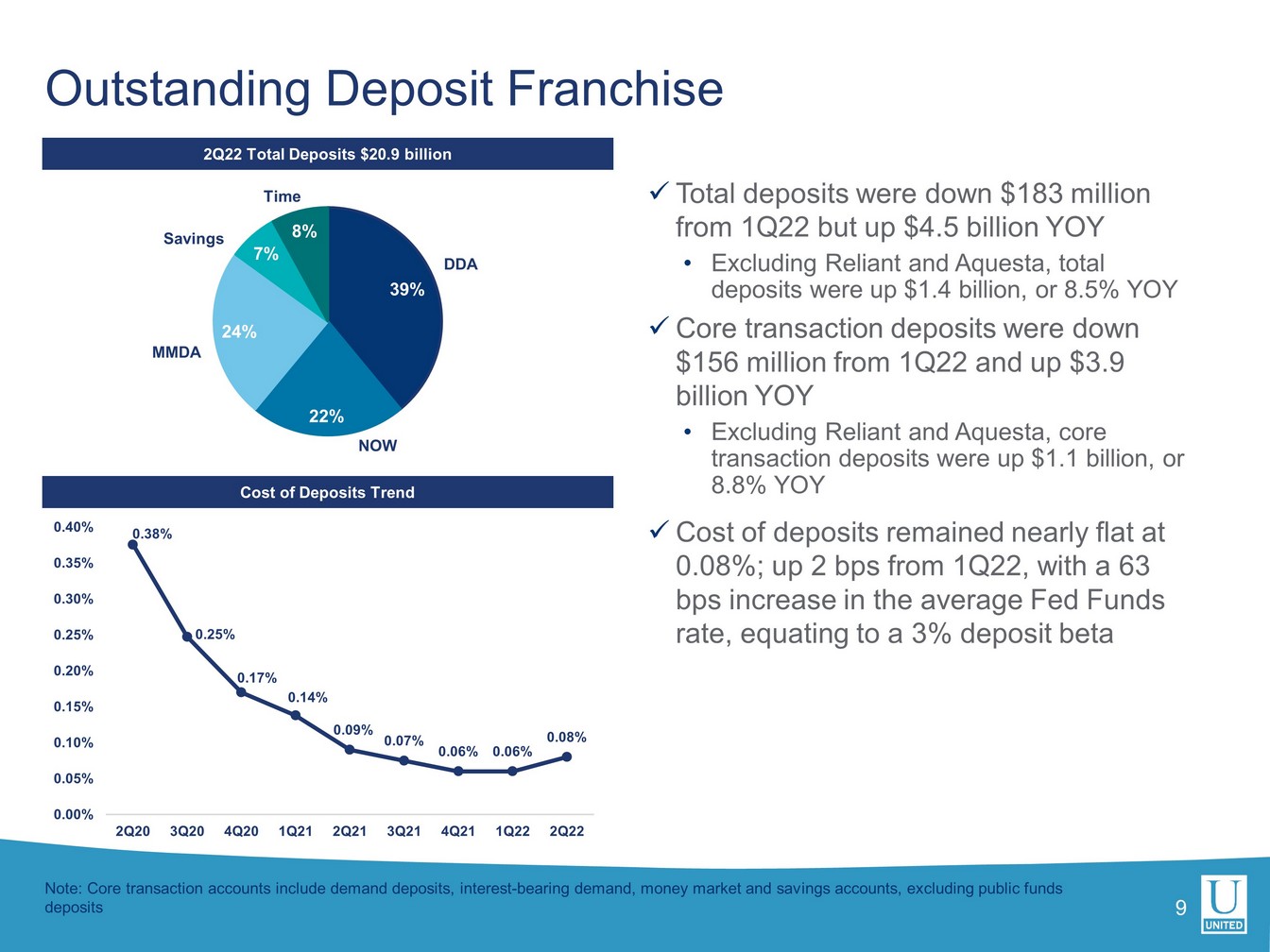 当四半期のローン総額は 2 億 2500 万ドル増加しました。PPP の影響を除くと、中核有機債権の伸びは年率 7.0%でした。預金は 1 億 8300 万ドル(0.9%)減少しました。ユナイテッドの預金コストはわずか2ベーシスポイント増の0.08%でしたが、利払い資産の平均利回りは24ベーシスポイント増の3.34%でした。