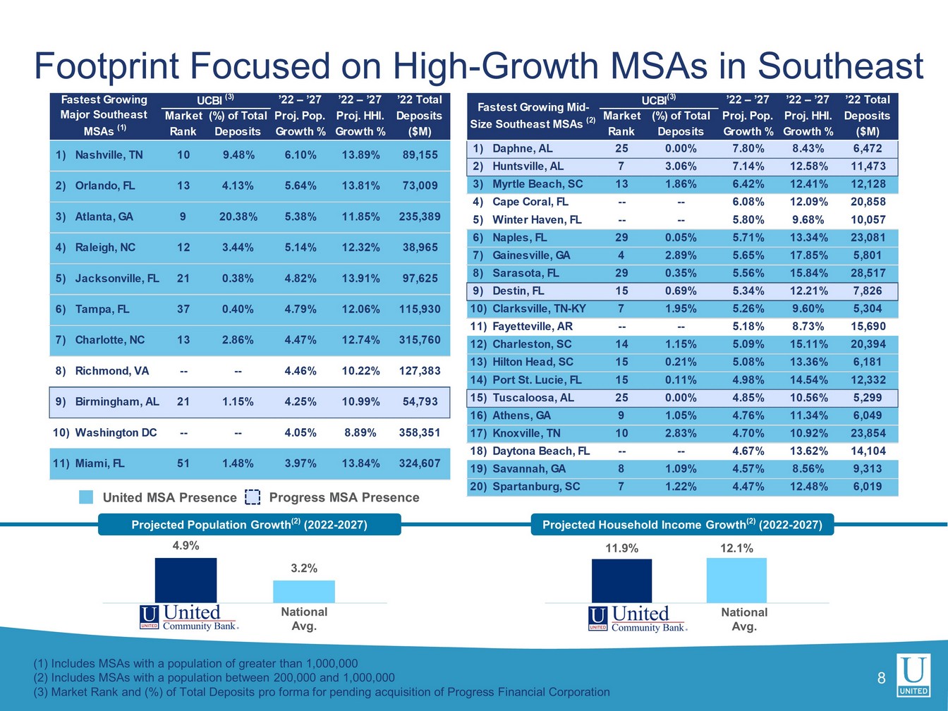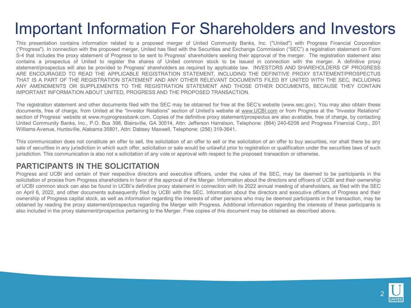Important Information For Shareholders and Investors 2 This presentation contains information related to a proposed merger of United Community Banks, Inc . ("United") with Progress Financial Corporation (“Progress") . In connection with the proposed merger, United has filed with the Securities and Exchange Commission (“SEC”) a registration statement on Form S - 4 that includes the proxy statement of Progress to be sent to Progress’ shareholders seeking their approval of the merger . The registration statement also contains a prospectus of United to register the shares of United common stock to be issued in connection with the merger . A definitive proxy statement/prospectus will also be provided to Progress’ shareholders as required by applicable law . INVESTORS AND SHAREHOLDERS OF PROGRESS ARE ENCOURAGED TO READ THE APPLICABLE REGISTRATION STATEMENT, INCLUDING THE DEFINITIVE PROXY STATEMENT/PROSPECTUS THAT IS A PART OF THE REGISTRATION STATEMENT AND ANY OTHER RELEVANT DOCUMENTS FILED BY UNITED WITH THE SEC, INCLUDING ANY AMENDMENTS OR SUPPLEMENTS TO THE REGISTRATION STATEMENT AND THOSE OTHER DOCUMENTS, BECAUSE THEY CONTAIN IMPORTANT INFORMATION ABOUT UNITED, PROGRESS AND THE PROPOSED TRANSACTION . The registration statement and other documents filed with the SEC may be obtained for free at the SEC’s website (www . sec . gov) . You may also obtain these documents, free of charge, from United at the “Investor Relations” section of United’s website at www . UCBI . com or from Progress at the “Investor Relations” section of Progress’ website at www . myprogressbank . com . Copies of the definitive proxy statement/prospectus are also available , free of charge, by contacting United Community Banks, Inc . , P . O . Box 398 , Blairsville, GA 30514 , Attn : Jefferson Harralson, Telephone : ( 864 ) 240 - 6208 and Progress Financial Corp . , 201 Williams Avenue, Huntsville, Alabama 35801 , Attn : Dabsey Maxwell, Telephone : ( 256 ) 319 - 3641 . This communication does not constitute an offer to sell, the solicitation of an offer to sell or the solicitation of an offer to buy securities, nor shall there be any sale of securities in any jurisdiction in which such offer, solicitation or sale would be unlawful prior to registration or qualification under the securities laws of such jurisdiction . This communication is also not a solicitation of any vote or approval with respect to the proposed transaction or otherwise . PARTICIPANTS IN THE SOLICITATION Progress and UCBI and certain of their respective directors and executive officers, under the rules of the SEC, may be deemed to be participants in the solicitation of proxies from Progress shareholders in favor of the approval of the Merger . Information about the directors and officers of UCBI and their ownership of UCBI common stock can also be found in UCBI’s definitive proxy statement in connection with its 2022 annual meeting of shareholders, as filed with the SEC on April 6 , 2022 , and other documents subsequently filed by UCBI with the SEC . Information about the directors and executive officers of Progress and their ownership of Progress capital stock, as well as information regarding the interests of other persons who may be deemed participants in the transaction, may be obtained by reading the proxy statement/prospectus regarding the Merger with Progress . Additional information regarding the interests of these participants is also included in the proxy statement/prospectus pertaining to the Merger . Free copies of this document may be obtained as described above .
