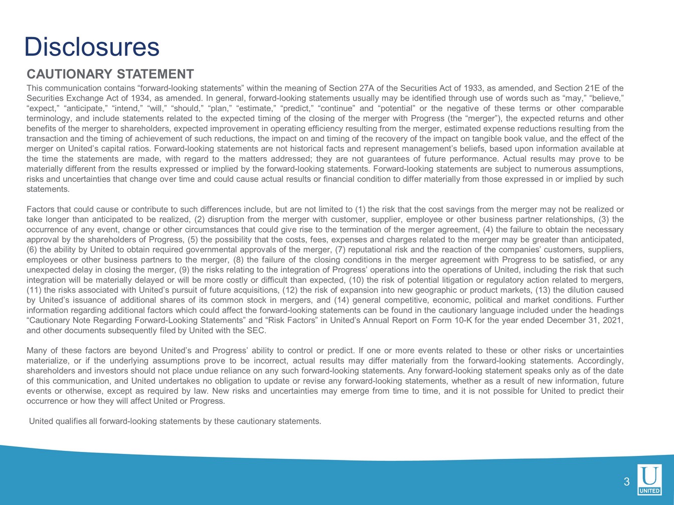 Factors that could cause or contribute to such differences include, but are not limited to (1) the risk that the cost savings and any revenue synergies from the Progress acquisition may not be realized or take longer than anticipated to be realized, (2) disruption of customer, supplier, employee or other business partner relationships as a result of the Progress acquisition, (3) the occurrence of any event, change or other circumstances that could give rise to a delay in closing the Progress acquisition or the termination of the merger agreement, (4) the failure to obtain the necessary approval by the shareholders of Progress, (5) the possibility that the costs, fees, expenses and charges related to the acquisition of Progress may be greater than anticipated, (6) the ability of United to obtain required governmental approvals of the Progress acquisition, (7) reputational risk and the reaction of the companies’ customers, suppliers, employees or other business partners to the acquisition of Progress, (8) the failure of the closing conditions in the Progress merger agreement to be satisfied, or any unexpected delay in closing the acquisition, (9) the risks relating to the integration of Progress’ operations into the operations of United, including the risk that such integration will be materially delayed or will be more costly or difficult than expected, (10) the risk of potential litigation or regulatory action related to the acquisition of Progress, (11) the risks associated with United’s pursuit of future acquisitions, (12) the risk of expansion into new geographic or product markets, (13) the dilution caused by United’s issuance of additional shares of its common stock in the acquisition of Progress, and (14) general competitive, economic, political and market conditions. Further information regarding additional factors which could affect the forward-looking statements contained in this press release can be found in the cautionary language included under the headings “Cautionary Note Regarding Forward-Looking Statements” and “Risk Factors” in United’s Annual Report on Form 10-K for the year ended December 31, 2021, and other documents subsequently filed by United with the United States Securities and Exchange Commission (“SEC”).