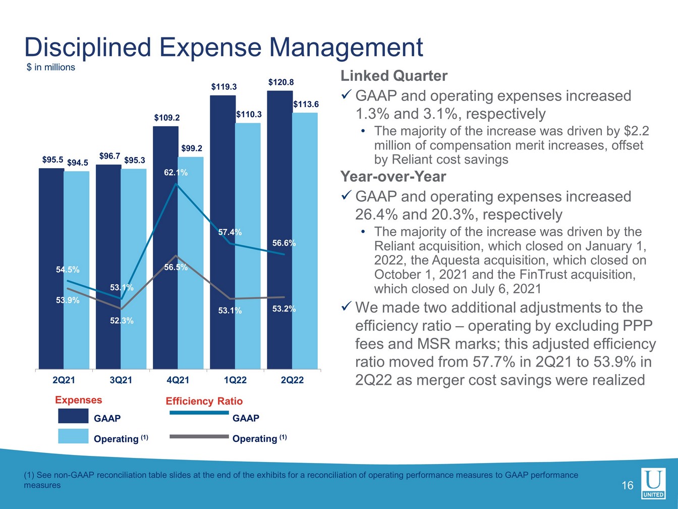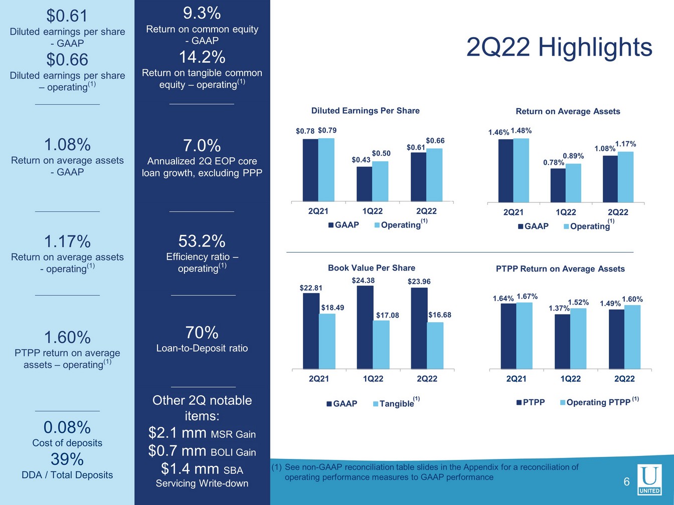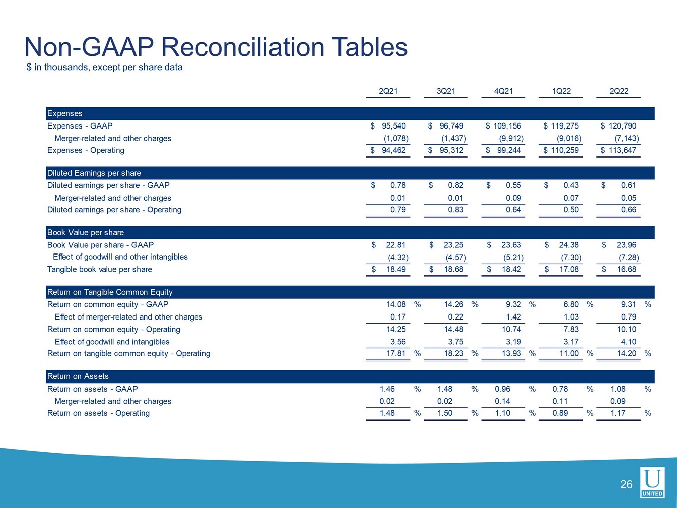 This press release, including the accompanying financial statement tables, contains financial information determined by methods other than in accordance with generally accepted accounting principles, or GAAP. This financial information includes certain operating performance measures, which exclude merger-related and other charges that are not considered part of recurring operations, such as “operating net income,” “pre-tax, pre-provision income,” “operating net income per diluted common share,” “operating earnings per share,” “tangible book value per common share,” “operating return on common equity,” “operating return on tangible common equity,” “operating return on assets,” “return on assets - pre-tax, pre-provision, excluding merger-related and other charges,” “return on assets - pre-tax, pre-provision,” “operating efficiency ratio,” and “tangible common equity to tangible assets.” These non-GAAP measures are included because United believes they may provide useful supplemental information for evaluating United’s underlying performance trends. These measures should be viewed in addition to, and not as an alternative to or substitute for, measures determined in accordance with GAAP, and are not necessarily comparable to non-GAAP measures that may be presented by other companies. To the extent applicable, reconciliations of these non-GAAP measures to the most directly comparable measures as reported in accordance with GAAP are included with the accompanying financial statement tables.