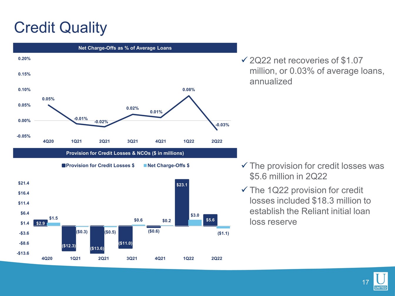 $95.5 $96.7 $109.2 $119.3 $120.8 $94.5 $95.3 $99.2 $110.3 $113.6 2Q21 3Q21 4Q21 1Q22 2Q22 54.5% 53.1% 62.1% 57.4% 56.6% 53.9% 52.3% 56.5% 53.1% 53.2% Efficiency Ratio Expenses Disciplined Expense Management $ in millions Linked Quarter x GAAP and operating expenses increased 1.3% and 3.1%, respectively • The majority of the increase was driven by $2.2 million of compensation merit increases, offset by Reliant cost savings Year - over - Year x GAAP and operating expenses increased 26.4% and 20.3%, respectively • The majority of the increase was driven by the Reliant acquisition, which closed on January 1, 2022, the Aquesta acquisition, which closed on October 1, 2021 and the FinTrust acquisition, which closed on July 6, 2021 x We made two additional adjustments to the efficiency ratio – operating by excluding PPP fees and MSR marks; this adjusted efficiency ratio moved from 57.7% in 2Q21 to 53.9% in 2Q22 as merger cost savings were realized (1) See non - GAAP reconciliation table slides at the end of the exhibits for a reconciliation of operating performance measures to GAAP p erformance measures 16 GAAP Operating (1) GAAP Operating (1)