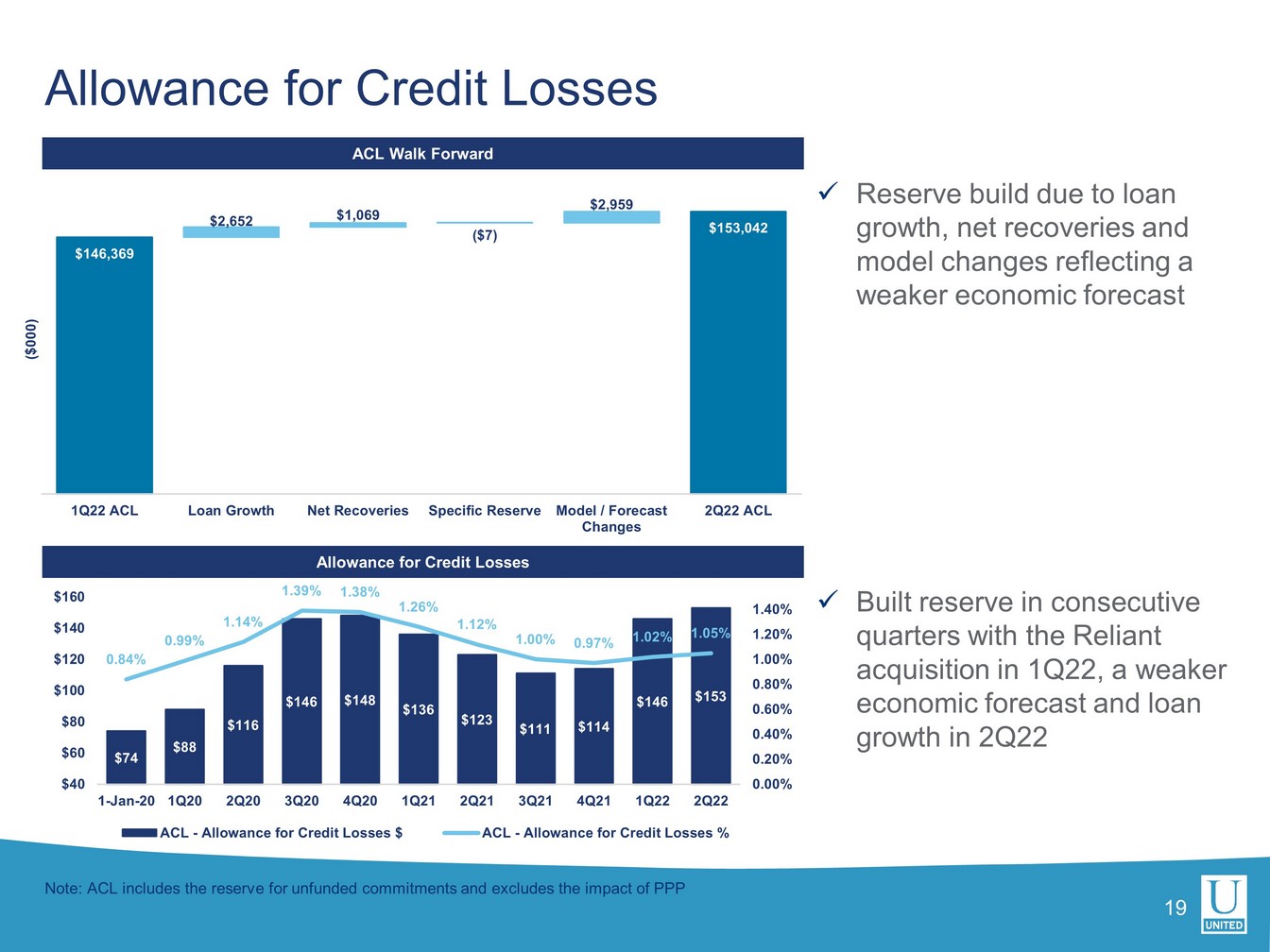 x Special mention loans improved by 0.12% (from $298 million in 1Q22 to $285 million in 2Q22, an improvement of $13 million) x Substandard accruing loans remained flat at 1.2% quarter - over - quarter as a % of total loans Higher - Risk Loan Trends Special Mention & Substandard Accruing Loans as a % of Total Loans Non - Performing Assets as a % of Total Loans 18 0.41% 0.41% 0.28% 0.29% 0.23% 0.00% 0.05% 0.10% 0.15% 0.20% 0.25% 0.30% 0.35% 0.40% 0.45% 2Q21 3Q21 4Q21 1Q22 2Q22 3.2% 2.5% 2.6% 2.1% 2.0% 1.7% 1.6% 1.4% 1.2% 1.2% 0.0% 0.5% 1.0% 1.5% 2.0% 2.5% 3.0% 3.5% 2Q21 3Q21 4Q21 1Q22 2Q22 Special Mention (%) Substandard Accruing(%) x Non - performing assets improved by $6.4 million during the quarter and stand at 0.23% of total loans