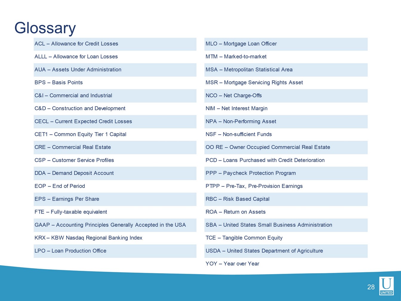 Non - GAAP Reconciliation Tables $ in thousands, except per share data 27 2Q21 3Q21 4Q21 1Q22 2Q22 Return on Assets to return on assets- pre-tax pre-provision Return on assets - GAAP 1.46 % 1.48 % 0.96 % 0.78 % 1.08 % Income tax expense 0.47 0.45 0.26 0.20 0.32 (Release of) provision for credit losses (0.29) (0.23) (0.01) 0.39 0.09 Return on assets - pre-tax, pre-provision 1.64 1.70 1.21 1.37 1.49 Merger-related and other charges 0.03 0.03 0.19 0.15 0.11 Return on assets - pre-tax, pre-provision, excluding merger-related and other charges 1.67 % 1.73 % 1.40 % 1.52 % 1.60 % Efficiency Ratio Efficiency Ratio - GAAP 54.53 % 53.11 % 62.12 % 57.43 % 56.58 % Merger-related and other charges (0.61) (0.78) (5.64) (4.34) (3.35) Efficiency Ratio - Operating 53.92 52.33 56.48 53.09 53.23 Effect of PPP interest and fees 4.31 4.23 1.38 0.32 0.12 Effect of MSR marks (0.55) (0.05) 0.27 1.71 0.53 Efficiency Ratio - Operating, excluding PPP fees and MSR marks 57.68 % 56.51 % 58.13 % 55.12 % 53.88 % Tangible common equity to tangible assets Equity to assets ratio - GAAP 11.04 % 10.89 % 10.61 % 11.06 % 10.95 % Effect of goodwill and other intangibles (1.82) (1.87) (2.06) (2.94) (2.96) Effect of preferred equity (0.51) (0.49) (0.46) (0.40) (0.40) Tangible common equity to tangible assets ratio 8.71 % 8.53 % 8.09 % 7.72 % 7.59 % Allowance for credit losses - total to loans Allowance for credit losses - total to loans (GAAP) 1.08 % 0.99 % 0.97 % 1.02 % 1.05 % Effect of PPP loans 0.04 0.01 0.00 0.00 0.00 Allowance for credit losses - total to loans, excluding PPP loans 1.12 % 1.00 % 0.97 % 1.02 % 1.05 %