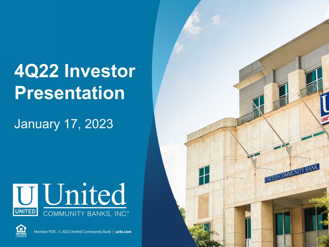 GREENVILLE, SC – January 17, 2023 - United Community Banks, Inc. (NASDAQ: UCBI) (United) today announced that net income for the 2022 fourth quarter was $81.5 million and pre-tax, pre-provision income was $125.9 million. Diluted earnings per share of $0.74 for the quarter represented an increase of $0.19 or 35%, from the fourth quarter a year ago, and was flat from the third quarter of 2022. On an operating basis, United’s diluted earnings per share of $0.75 was up 17% from the year ago quarter. The primary drivers of the increased earnings in both periods were increased interest rates and organic loan growth, as well as the acquisition of Reliant Bancorp, Inc., which closed on January 1, 2022 and was not reflected in the year-ago quarter. United’s return on assets was 1.33%, or 1.35% on an operating basis. Return on equity was 10.9% and return on tangible common equity was 15.2%. On a pre-tax, pre-provision basis, operating return on assets was 2.09% for the quarter. Highlights for the quarter include strong annualized loan growth of 12%, 19 basis points of net interest margin expansion and further improvement in the efficiency ratio to 47.95%, or 47.35% on an operating basis, which excludes the effect of merger-related and other charges.