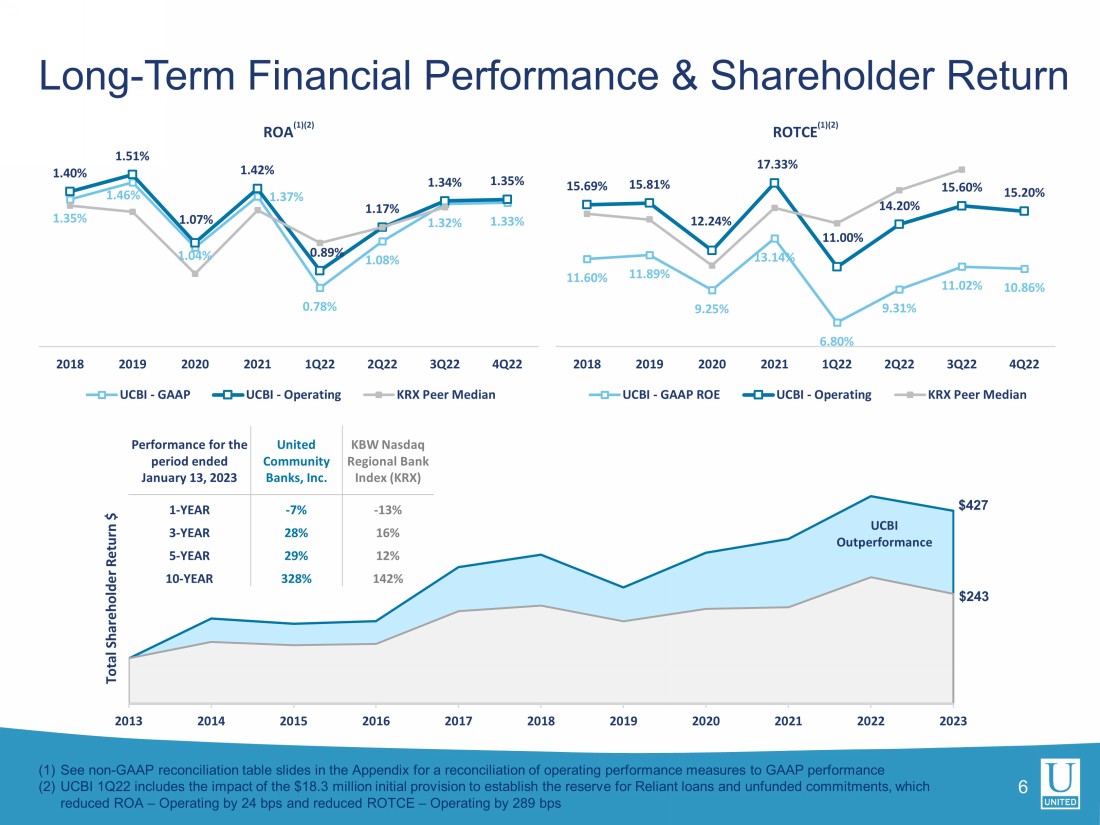 #2 Highest Net Promoter Score among all banks nationwide in 2021 – J.D. Power TOP 10 WORLD’S BEST BANKS and #3 in the United States – Forbes 206 BANKING OFFICES ACROSS THE SOUTHEAST #1 IN CUSTOMER SATISFACTION i n 2022 with Retail Banking in the Southeast – J.D. Power United Community Banks, Inc. $ 24.0 BILLION IN TOTAL ASSETS $4.3 BILLION IN AUA $ 19.9 BILLION IN TOTAL DEPOSITS BEST BANKS TO WORK FOR i n 2022 for the sixth consecutive year – American Banker $0.22 QUARTERLY DIVIDEND – UP 10% Y OY 4 Premier Southeast Regional Bank x Metro - focused branch network with locations in the fastest - growing MSAs in the Southeast x 198 branches, 8 LPOs, and 6 MLOs across six Southeast states x Top 10 market share in GA and SC x Proven ability to integrate – 13 acquisitions completed over the past 10 years Committed to Service Since 1950 Extended Navitas and SBA Markets $ 15.3 BILLION IN TOTAL LOANS Company Overview 12.8 % TIER 1 RBC 100 BEST BANKS IN AMERICA i n 2022 f or the ninth consecutive year – Forbes x Offered nationwide x SBA business has both in - footprint and national business (4 specific verticals) x Navitas subsidiary is a technology - enabled small - ticket, essential - use commercial equipment finance provider UCBI Banking Offices Note: See glossary located at the end of this presentation for reference on certain acronyms Regional Full Service Branch Network National Navitas and SBA Markets $23.63 $23.78 $24.38 $18.42 $16.52 $17.13 4Q21 3Q22 4Q22 Book Value Per Share GAAP Tangible 77% Loan - to - Deposit ratio 10.86% Return on common equity – GAAP 15.2% Return on tangible common equity – operating (1) Other 4Q notable items: $3.6mm (pre - tax) gain on equity investment marks $1.8mm (after - tax) tax loss on BOLI surrender $0.74 Diluted earnings per share – GAAP $0.75 Diluted earnings per share – operating (1) 1.33% Return on average assets – GAAP 1.35% Return on average assets – operating (1) 2.09% PTPP return on average assets – operating (1) 0.49% Cost of deposits 38% DDA / Total Deposits 4 Q22 Highlights (1) See non - GAAP reconciliation table slides in the Appendix for a reconciliation of operating performance measures to GAAP performance $0.55 $0.74 $0.74 $0.64 $0.75 $0.75 4Q21 3Q22 4Q22 Diluted Earnings Per Share GAAP Operating (1) 0.96% 1.32% 1.33% 1.10% 1.34% 1.35% 4Q21 3Q22 4Q22 Return on Average Assets GAAP Operating 1.21% 1.94% 2.07% 1.40% 1.97% 2.09% 4Q21 3Q22 4Q22 PTPP Return on Average Assets PTPP Operating PTPP (1) (1) 12% Annualized 4Q EOP loan growth 48.0% Efficiency ratio – GAAP 47.4% Efficiency ratio – operating (1) 5 (1)