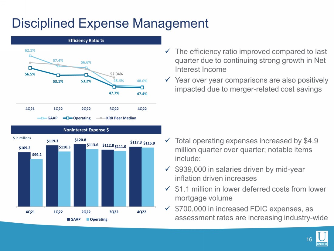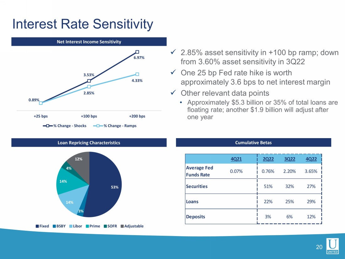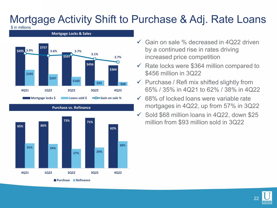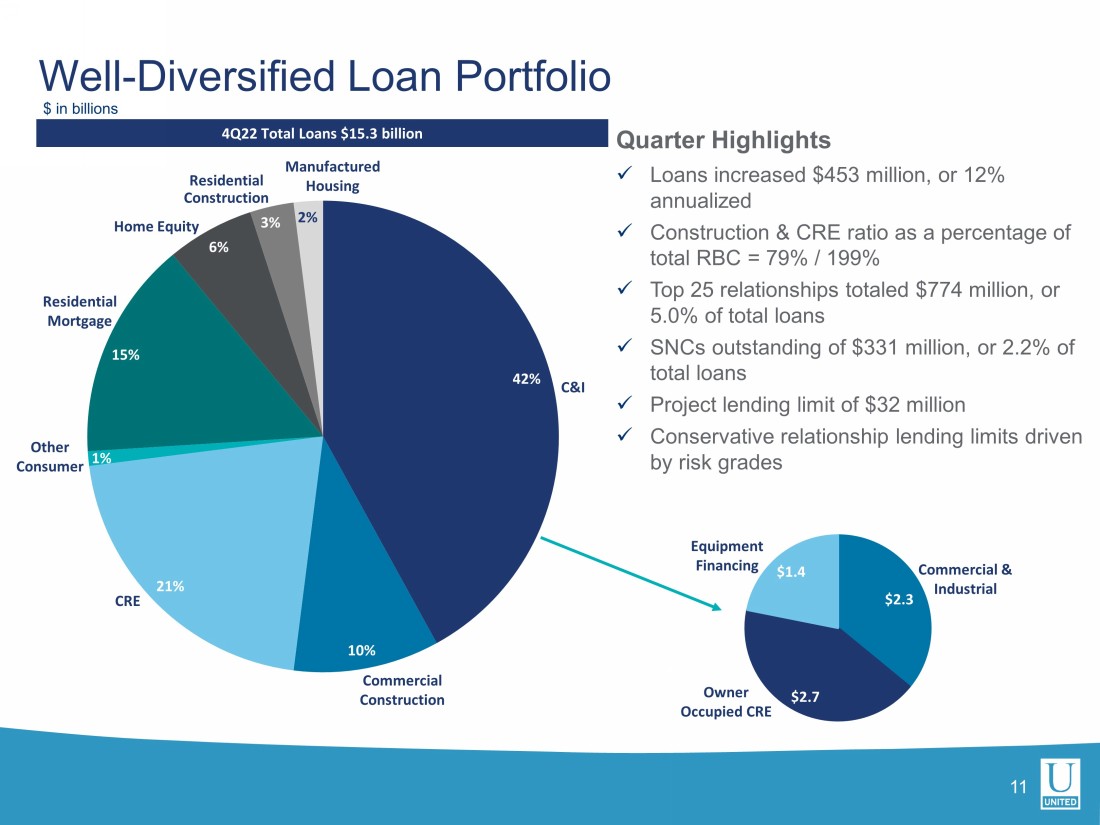 Mr. Harton concluded, “2023 will be another great year for United despite some changes in the environment. Deposit competition will continue to increase as depositors seek higher returns for their excess liquidity. Well publicized recession fears may drive increasing provision costs for the industry. We believe we are well prepared to navigate these conditions due to the strength of our balance sheet, and more importantly, the strength of our teams. In 2022, we further strengthened our Board of Directors, added new market leaders, new commercial bankers and new line-of-business leaders. We also expanded our service capabilities with new locations across our footprint. In closing, I would note that we are all very proud that in October, United was named one of the “Best Banks to Work For” by American Banker for the sixth consecutive year. Everything begins with being a great place to work for great people. One of my goals for the year is to do an even better job of making sure we keep our company feeling small and connected as we continue to grow.”