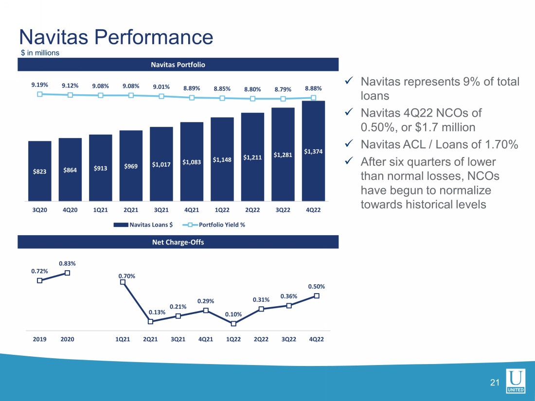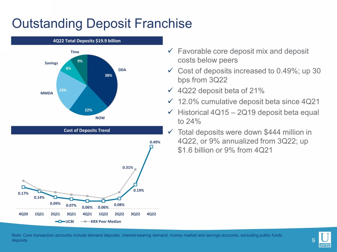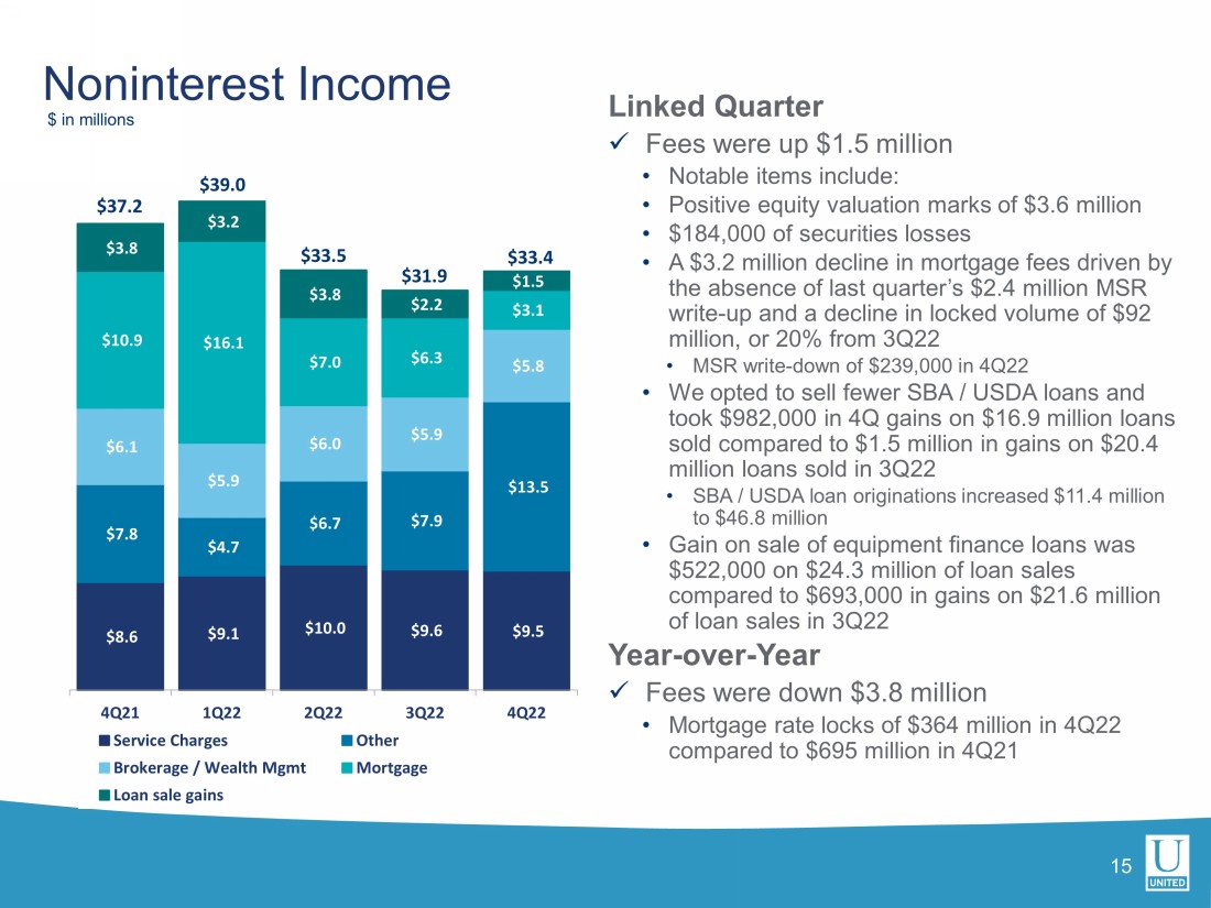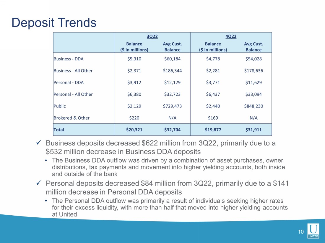 Mr. Harton concluded, “2023 will be another great year for United despite some changes in the environment. Deposit competition will continue to increase as depositors seek higher returns for their excess liquidity. Well publicized recession fears may drive increasing provision costs for the industry. We believe we are well prepared to navigate these conditions due to the strength of our balance sheet, and more importantly, the strength of our teams. In 2022, we further strengthened our Board of Directors, added new market leaders, new commercial bankers and new line-of-business leaders. We also expanded our service capabilities with new locations across our footprint. In closing, I would note that we are all very proud that in October, United was named one of the “Best Banks to Work For” by American Banker for the sixth consecutive year. Everything begins with being a great place to work for great people. One of my goals for the year is to do an even better job of making sure we keep our company feeling small and connected as we continue to grow.”