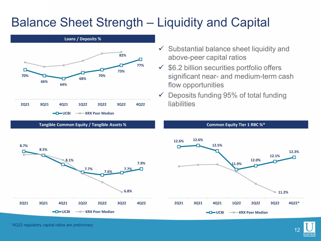 Balance Business - DDA $5,310 $60,184 $4,778 $54,028 Business - All Other $2,371 $186,344 $2,281 $178,636 Personal - DDA $3,912 $12,129 $3,771 $11,629 Personal - All Other $6,380 $32,723 $6,437 $33,094 Public $2,129 $729,473 $2,440 $848,230 Brokered & Other $220 N/A $169 N/A Total $20,321 $32,704 $19,877 $31,911 11 4 Q22 Total Loans $15.3 billion Well - Diversified Loan Portfolio Quarter Highlights x Loans increased $453 million, or 12% annualized x Construction & CRE ratio as a percentage of total RBC = 79% / 199% x Top 25 relationships totaled $774 million, or 5.0% of total loans x SNCs outstanding of $331 million, or 2.2% of total loans x Project lending limit of $32 million x Conservative relationship lending limits driven by risk grades 42% 10% 21% 1% 15% 6% 3% 2% Residential Mortgage Manufactured Housing C&I Commercial Construction CRE Other Consumer Home Equity Residential Construction $2.3 $2.7 $1.4 Commercial & Industrial Owner Occupied CRE Equipment Financing $ in billions 8.7% 8.5% 8.1% 7.7% 7.6% 7.7% 7.9% 6.8% 2Q21 3Q21 4Q21 1Q22 2Q22 3Q22 4Q22 UCBI KRX Peer Median 12 Loans / Deposits % Tangible Common Equity / Tangible Assets % Common Equity Tier 1 RBC %* 70% 66% 64% 68% 70% 73% 77% 82% 2Q21 3Q21 4Q21 1Q22 2Q22 3Q22 4Q22 UCBI KRX Peer Median x S ubstantial balance sheet liquidity and above - peer capital ratios x $6.2 billion securities portfolio offers significant near - and medium - term cash flow opportunities x Deposits funding 95% of total funding liabilities 12.6% 12.6% 12.5% 11.9% 12.0% 12.1% 12.3% 11.2% 2Q21 3Q21 4Q21 1Q22 2Q22 3Q22 4Q22* UCBI KRX Peer Median Balance Sheet Strength – Liquidity and Capital *4Q22 regulatory capital ratios are preliminary