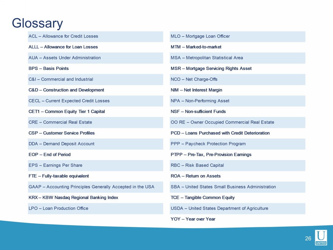 This press release, including the accompanying financial statement tables, contains financial information determined by methods other than in accordance with generally accepted accounting principles, or GAAP. This financial information includes certain operating performance measures, which exclude merger-related and other charges that are not considered part of recurring operations, such as “operating net income,” “pre-tax, pre-provision income,” “operating net income per diluted common share,” “operating earnings per share,” “tangible book value per common share,” “operating return on common equity,” “operating return on tangible common equity,” “operating return on assets,” “return on assets - pre-tax, pre-provision, excluding merger-related and other charges,” “return on assets - pre-tax, pre-provision,” “operating efficiency ratio,” and “tangible common equity to tangible assets.” These non-GAAP measures are included because United believes they may provide useful supplemental information for evaluating United’s underlying performance trends. These measures should be viewed in addition to, and not as an alternative to or substitute for, measures determined in accordance with GAAP, and are not necessarily comparable to non-GAAP measures that may be presented by other companies. To the extent applicable, reconciliations of these non-GAAP measures to the most directly comparable measures as reported in accordance with GAAP are included with the accompanying financial statement tables.