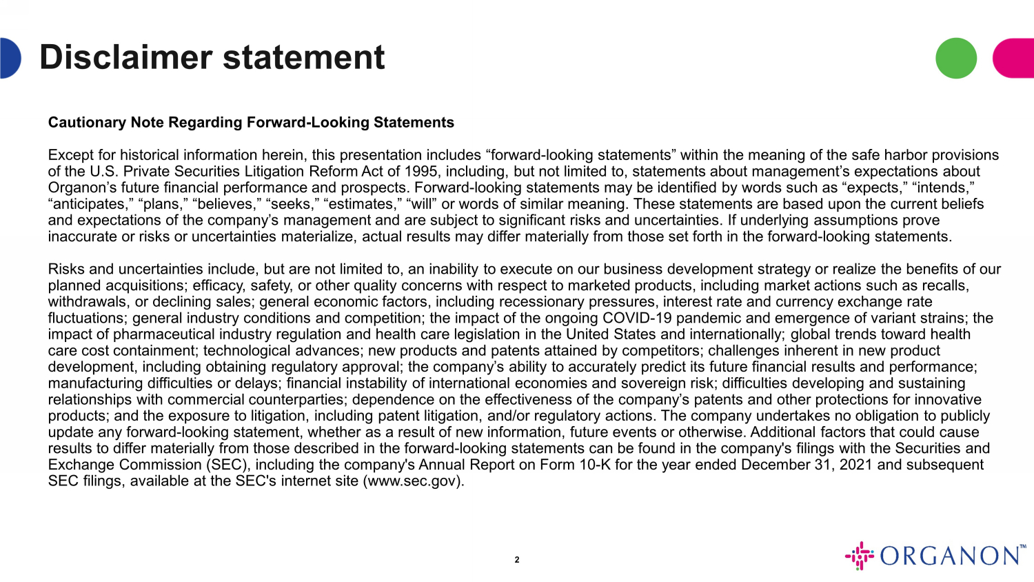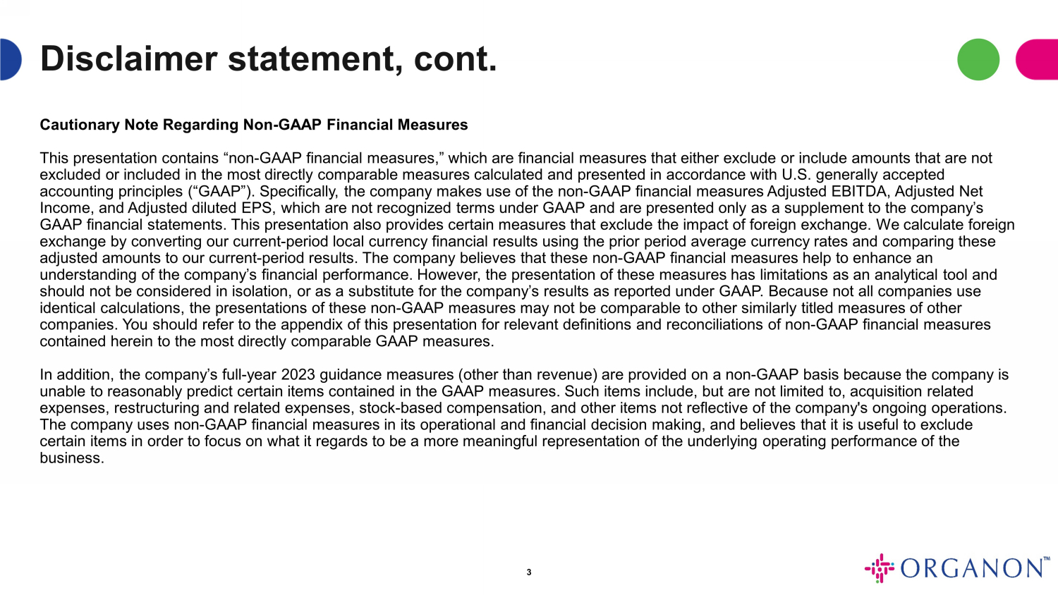 オルガノンは、法的手続きの最終結果、異常な利益と損失、GAAPに基づく税制上の影響をもたらす事項の発生、および買収関連費用を合理的な確実性をもって不当な努力なしに予測できないため、GAAPベースの財務指標を将来予測に基づいて提供しません。これらの項目は不確実であり、様々な要因に左右されるため、GAAPに準拠して計算されたオルガノンの業績にとって重要である可能性があります。