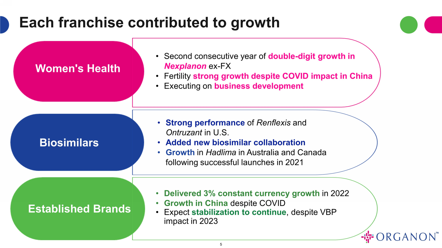 エスタブリッシュトブランドの売上は、報告ベースでは5%減少、2022年通期では為替を除いて3%増加しました。2022 年は、6%を超える数量成長により、一部市場における価格引き下げを相殺しました。日本市場における競合他社数社に影響を与えた一時的な供給問題や、Atozet™(エゼチミブおよびアトルバスタチン)、呼吸器系ポートフォリオの好調な業績が通年業績に寄与しました。しかし、独占権喪失のリスクはほとんどなく、これらの有名ブランドの可能性を最大限に引き出すことに引き続き注力することで、2023年のEstablished Brandsフランチャイズは恒常通貨ベースで横ばいの業績となるとオルガノンは予想しています。