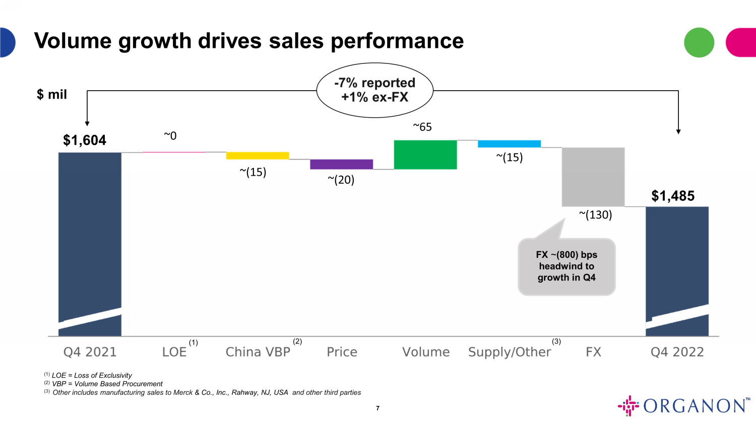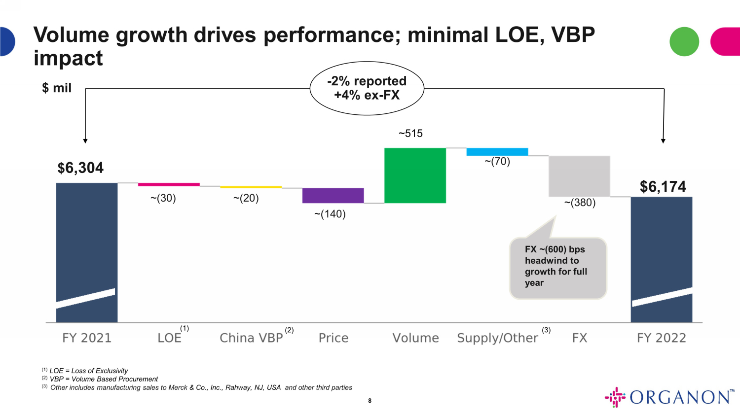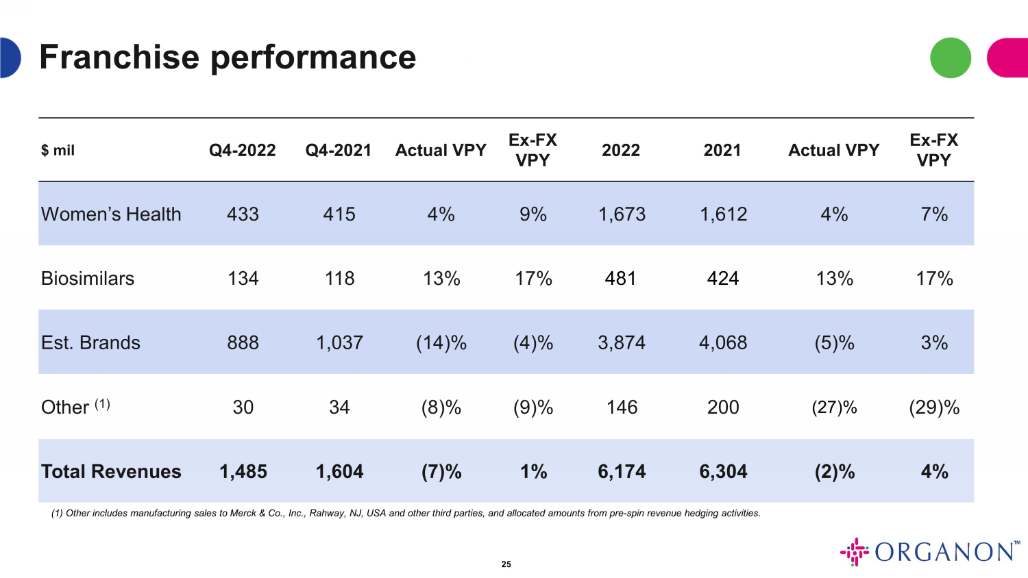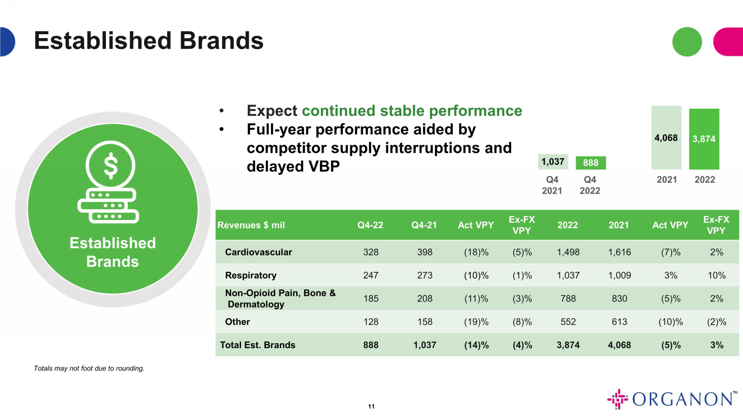 エスタブリッシュトブランドの売上は、2022年第4四半期に2021年第4四半期と比較して報告ベースで14%、為替差益を除くと4%減少しました。第4四半期の前年同期比減少は、主に2022年11月にエゼトロールTM(エゼチミブ)が中国におけるVBP(数量ベース調達)第7ラウンドに組み入れられたことに関連しています。さらに、2023年1月、オルガノンは、DiprospanTM、Celestone Chronodose TM、Celestone Soluspan®の商標で販売されているベタメタゾン懸濁注射剤の一部市場において、ベルギーのヘイスト施設における製造ラインの不適合部品に関するマーケットアクションを開始しました。この措置により、2022年第4四半期にエスタブリッシュド・ブランドの売上が8百万ドル減少しています。製品の品質に関する苦情は報告されておらず、影響を受けた可能性があり配布された製品バッチに起因する有害事象の報告もありません。