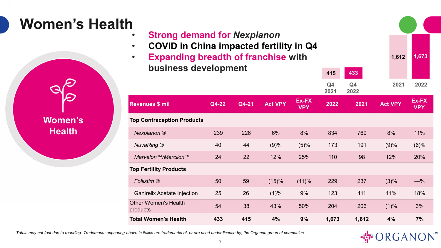 | Women’s Health | $ | 433 | $ | 415 | 4 | % | 9 | % | ||||||||