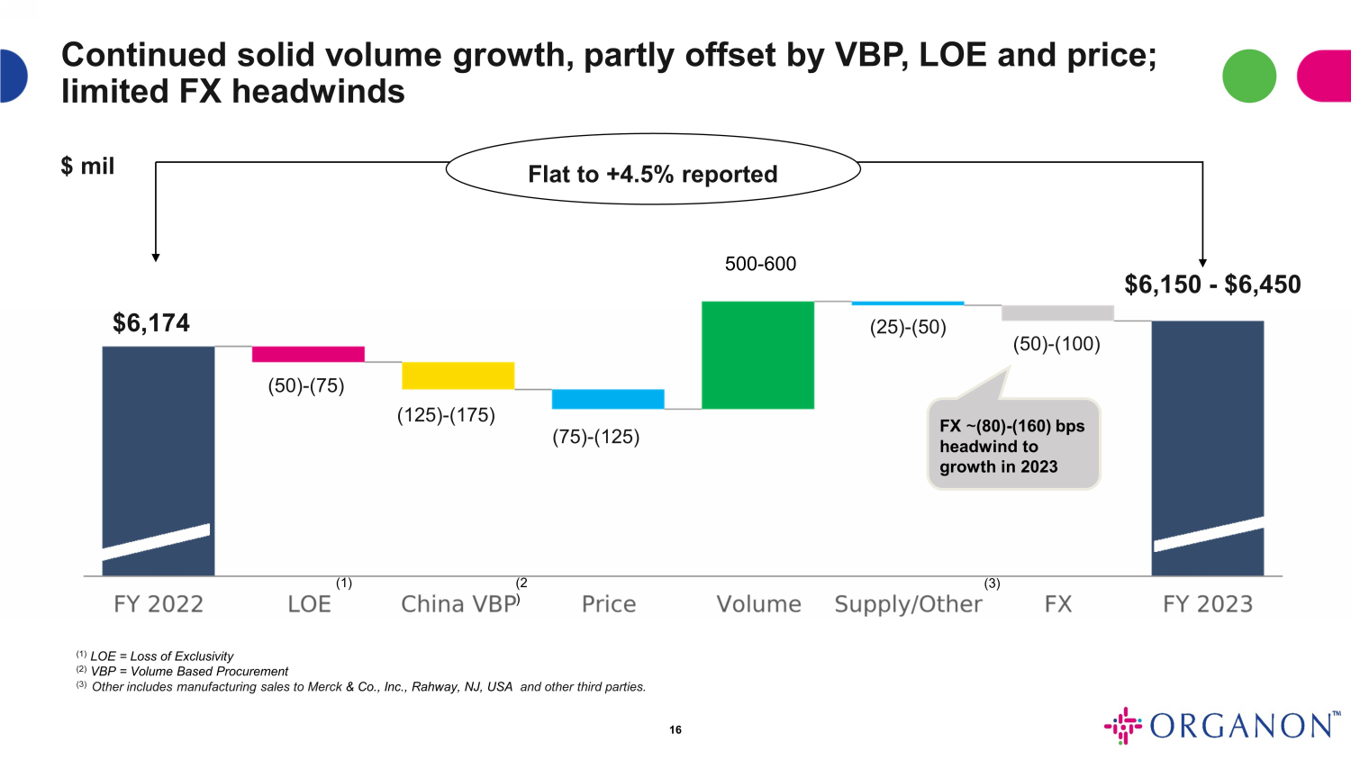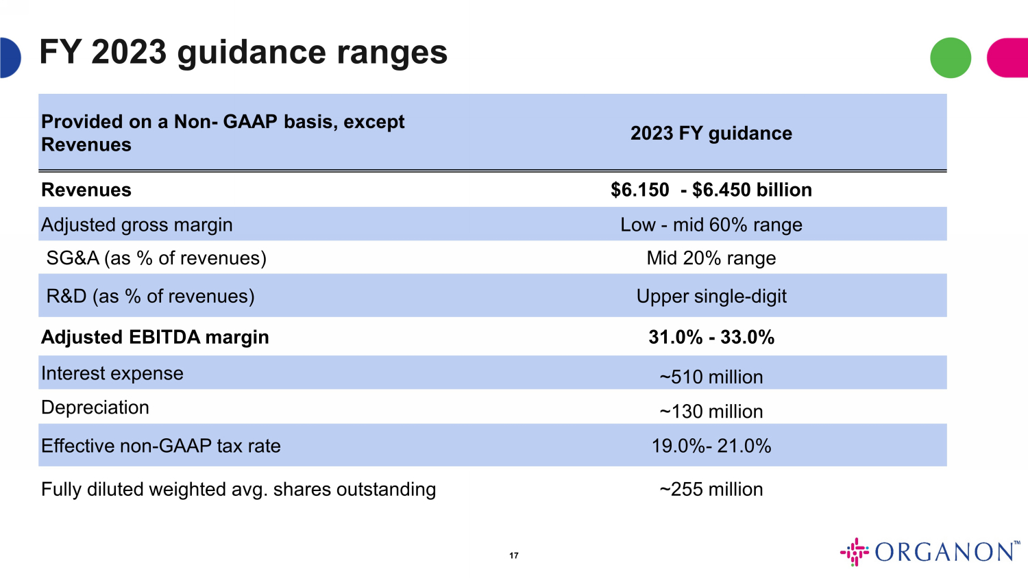 | 1 | 研究開発費の見積もり範囲には、2023年通年のIPR&D費として約40百万ドルの見積もりが含まれています。これは、当社の現在のポートフォリオの製品によって2023年に達成される可能性のあるマイルストーンの見積もりに基づいています。オルガノンの財務ガイダンスでは、まだ実行されていない事業開発取引に関する将来のIPR&Dの見積もりは想定されていません。 |