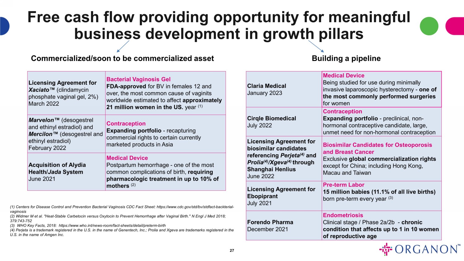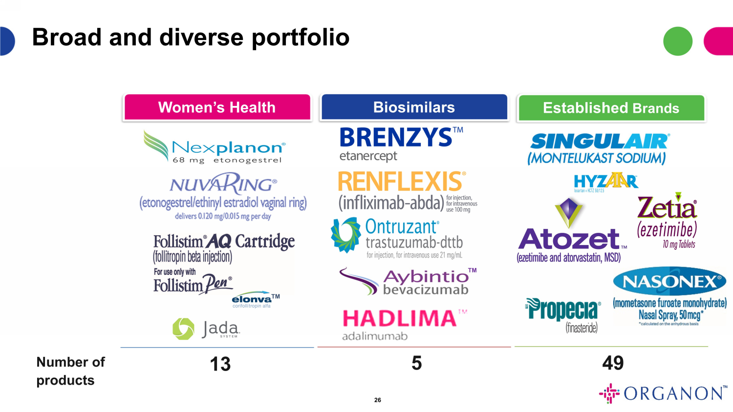 オルガノンは、女性の生涯を通じた健康増進に焦点を当てたグローバル・ヘルスケア・カンパニーです。オルガノンは、さまざまな治療分野において60以上の医薬品および製品のポートフォリオを有しています。ウィメンズヘルスのポートフォリオに加え、拡大するバイオシミラー事業と安定した既存薬のフランチャイズにより、オルガノンの製品は強いキャッシュフローを生み出し、ウィメンズヘルスのイノベーションと将来の成長機会への投資をサポートします。さらに、オルガノンは、急成長する国際市場における規模と存在感を活用し、製品の商業化を目指すバイオ医薬品の革新的企業との提携の機会を探っています。