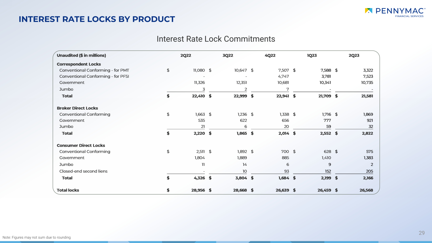 ACQUISITIONS AND ORIGINATIONS BY PRODUCT 28 Acquisitions/Originations Note: Figures may not sum due to rounding Unaudited ($ in millions) 2Q22 3Q22 4Q22 1Q23 2Q23 Correspondent Acquisitions Conventional Conforming - for PMT 10,320$ 10,225$ 6,771$ 6,629$ 3,029$ Conventional Conforming - for PFSI - - 3,912 4,063 7,018 Government 10,649 12,161 10,081 9,461 11,139 Jumbo 3 2 - - - Total 20,973$ 22,387$ 20,764$ 20,153$ 21,186$ Broker Direct Originations Conventional Conforming 1,556$ 909$ 758$ 1,097$ 1,436$ Government 396 384 362 441 685 Jumbo 24 5 7 28 19 Total 1,976$ 1,298$ 1,126$ 1,565$ 2,140$ Consumer Direct Originations Conventional Conforming 2,246$ 1,198$ 489$ 365$ 400$ Government 1,492 1,130 572 610 1,028 Jumbo 5 2 4 1 4 Closed-end second liens - 1 45 81 122 Total 3,744$ 2,330$ 1,110$ 1,057$ 1,553$ Total acquisitions/originations 26,693$ 26,016$ 23,000$ 22,775$ 24,879$ UPB of loans fulfilled for PMT (included in correspondent acquisitions) 10,324$ 10,227$ 6,771$ 6,629$ 3,029$ INTEREST RATE LOCKS BY PRODUCT 29 Note: Figures may not sum due to rounding Interest Rate Lock Commitments Unaudited ($ in millions) 2Q22 3Q22 4Q22 1Q23 2Q23 Correspondent Locks Conventional Conforming - for PMT 11,080$ 10,647$ 7,507$ 7,588$ 3,322$ Conventional Conforming - for PFSI - - 4,747 3,781 7,523 Government 11,326 12,351 10,681 10,341 10,735 Jumbo 3 2 7 - - Total 22,410$ 22,999$ 22,941$ 21,709$ 21,581$ Broker Direct Locks Conventional Conforming 1,663$ 1,236$ 1,338$ 1,716$ 1,869$ Government 535 622 656 777 921 Jumbo 21 6 20 59 32 Total 2,220$ 1,865$ 2,014$ 2,552$ 2,822$ Consumer Direct Locks Conventional Conforming 2,511$ 1,892$ 700$ 628$ 575$ Government 1,804 1,889 885 1,410 1,383 Jumbo 11 14 6 9 2 Closed-end second liens - 10 93 152 205 Total 4,326$ 3,804$ 1,684$ 2,199$ 2,166$ Total locks 28,956$ 28,668$ 26,639$ 26,459$ 26,568$