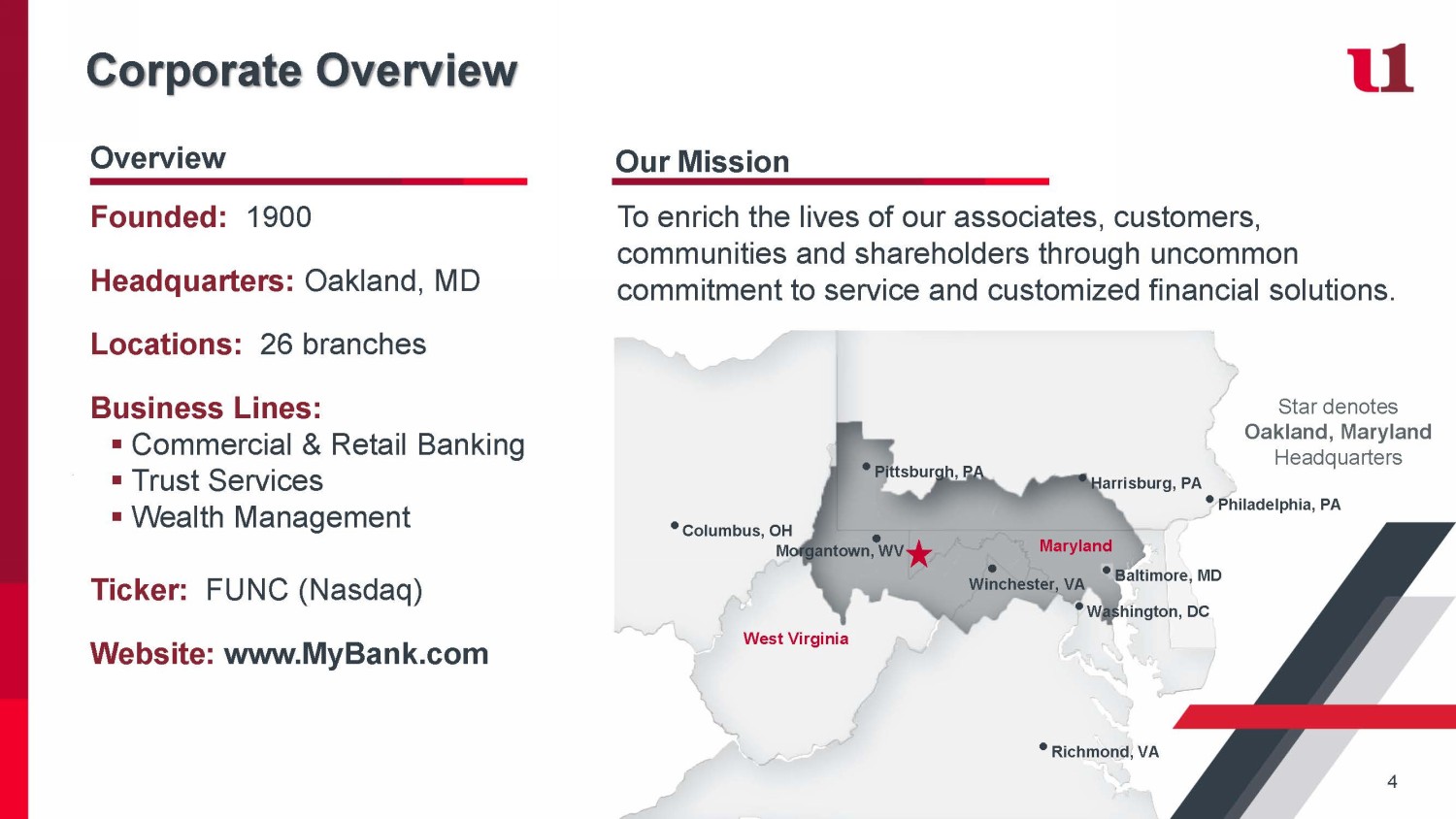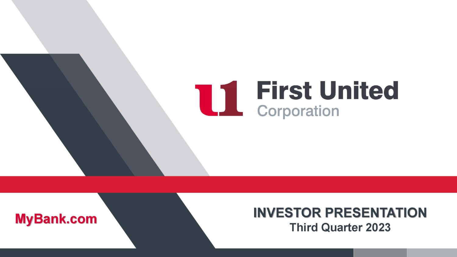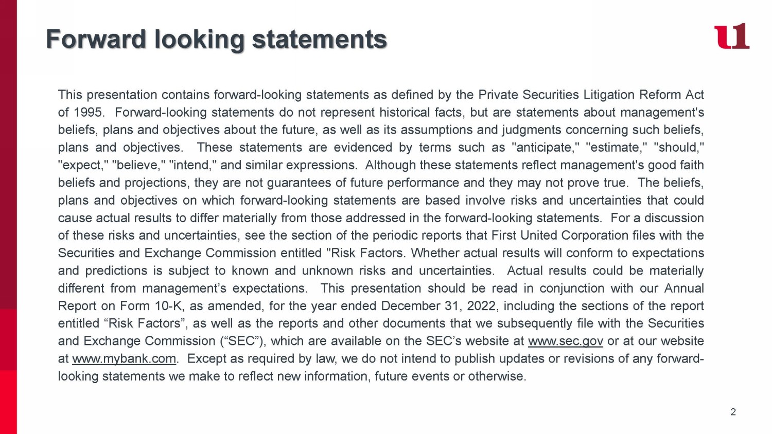 2 Forward looking statements This presentation contains forward - looking statements as defined by the Private Securities Litigation Reform Act of 1995 . Forward - looking statements do not represent historical facts, but are statements about management's beliefs, plans and objectives about the future, as well as its assumptions and judgments concerning such beliefs, plans and objectives . These statements are evidenced by terms such as "anticipate," "estimate," "should," "expect," "believe," "intend," and similar expressions . Although these statements reflect management's good faith beliefs and projections, they are not guarantees of future performance and they may not prove true . The beliefs, plans and objectives on which forward - looking statements are based involve risks and uncertainties that could cause actual results to differ materially from those addressed in the forward - looking statements . For a discussion of these risks and uncertainties, see the section of the periodic reports that First United Corporation files with the Securities and Exchange Commission entitled "Risk Factors . Whether actual results will conform to expectations and predictions is subject to known and unknown risks and uncertainties . Actual results could be materially different from management’s expectations . This presentation should be read in conjunction with our Annual Report on Form 10 - K, as amended, for the year ended December 31 , 2022 , including the sections of the report entitled “Risk Factors”, as well as the reports and other documents that we subsequently file with the Securities and Exchange Commission (“SEC”), which are available on the SEC’s website at www . sec . gov or at our website at www . mybank . com . Except as required by law, we do not intend to publish updates or revisions of any forward - looking statements we make to reflect new information, future events or otherwise .
