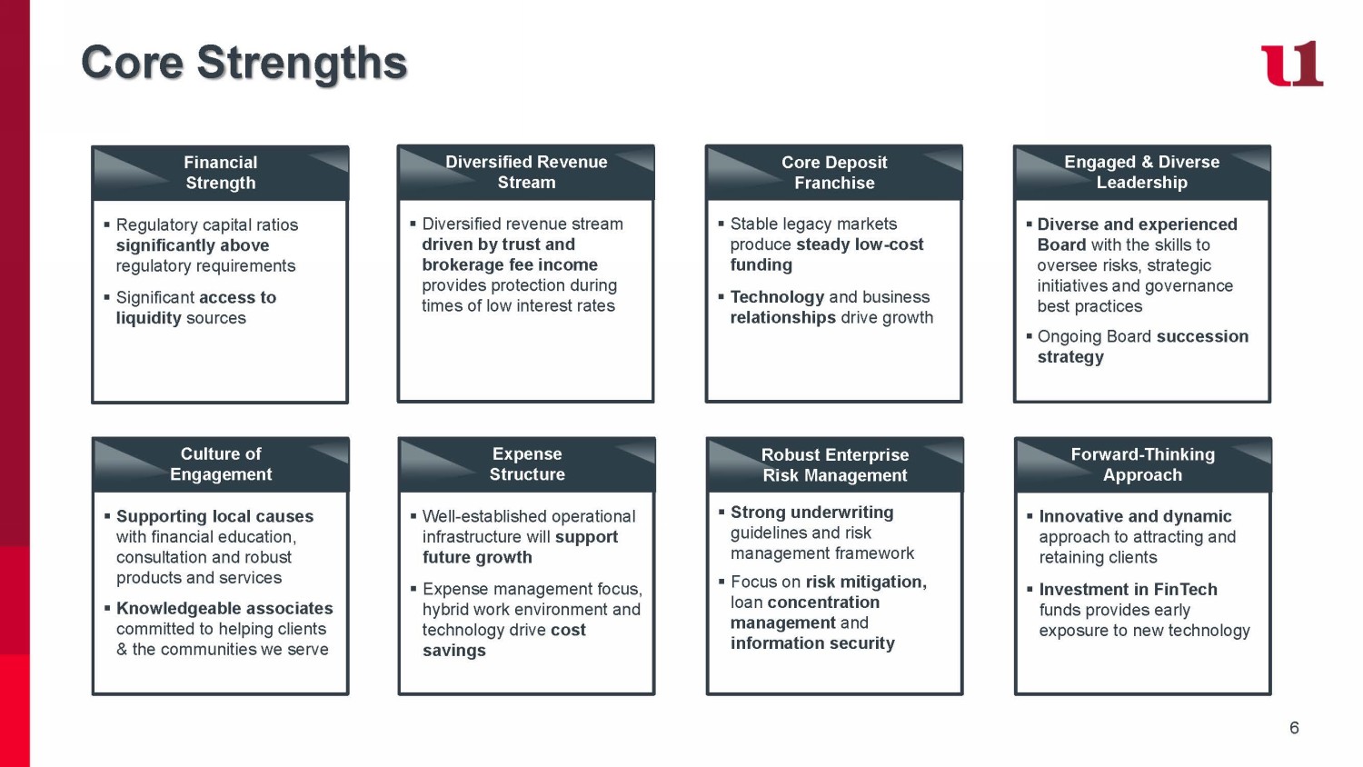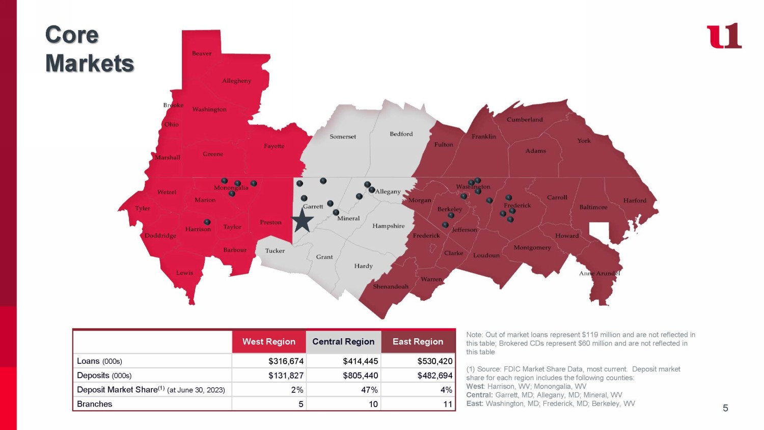 Corporate Overview Founded: 1900 Headquarters: Oakland, MD Locations: 26 branches Business Lines: ▪ Commercial & Retail Banking ▪ Trust Services ▪ Wealth Management Ticker: FUNC (Nasdaq) Website: www.MyBank.com Overview West Virginia Maryland • Pittsburgh, PA • Washington, DC • Columbus, OH • Baltimore, MD • Richmond, VA Morgantown, WV භ • Philadelphia, PA • Harrisburg, PA Winchester, VA භ Star denotes Oakland, Maryland Headquarters 4 5 West Region Central Region East Region Loans (000s) $316,674 $414,445 $530,420 Deposits (000s) $131,827 $805,440 $482,694 Deposit Market Share (1) (at June 30, 2023) 2% 47% 4% Branches 5 10 11 Note: Out of market loans represent $119 million and are not reflected in this table; Brokered CDs represent $60 million and are not reflected in this table (1) Source: FDIC Market Share Data, most current.