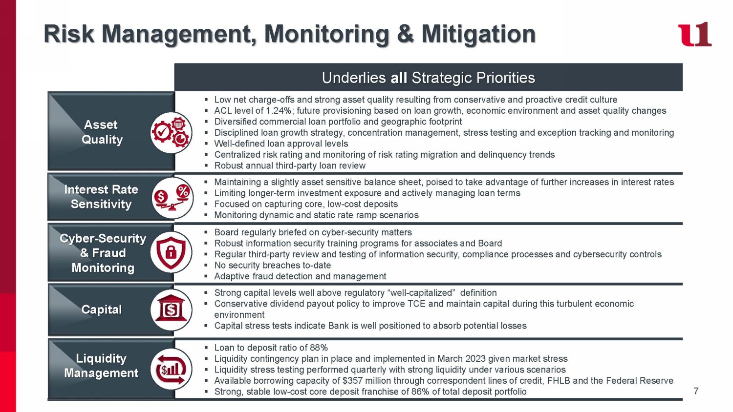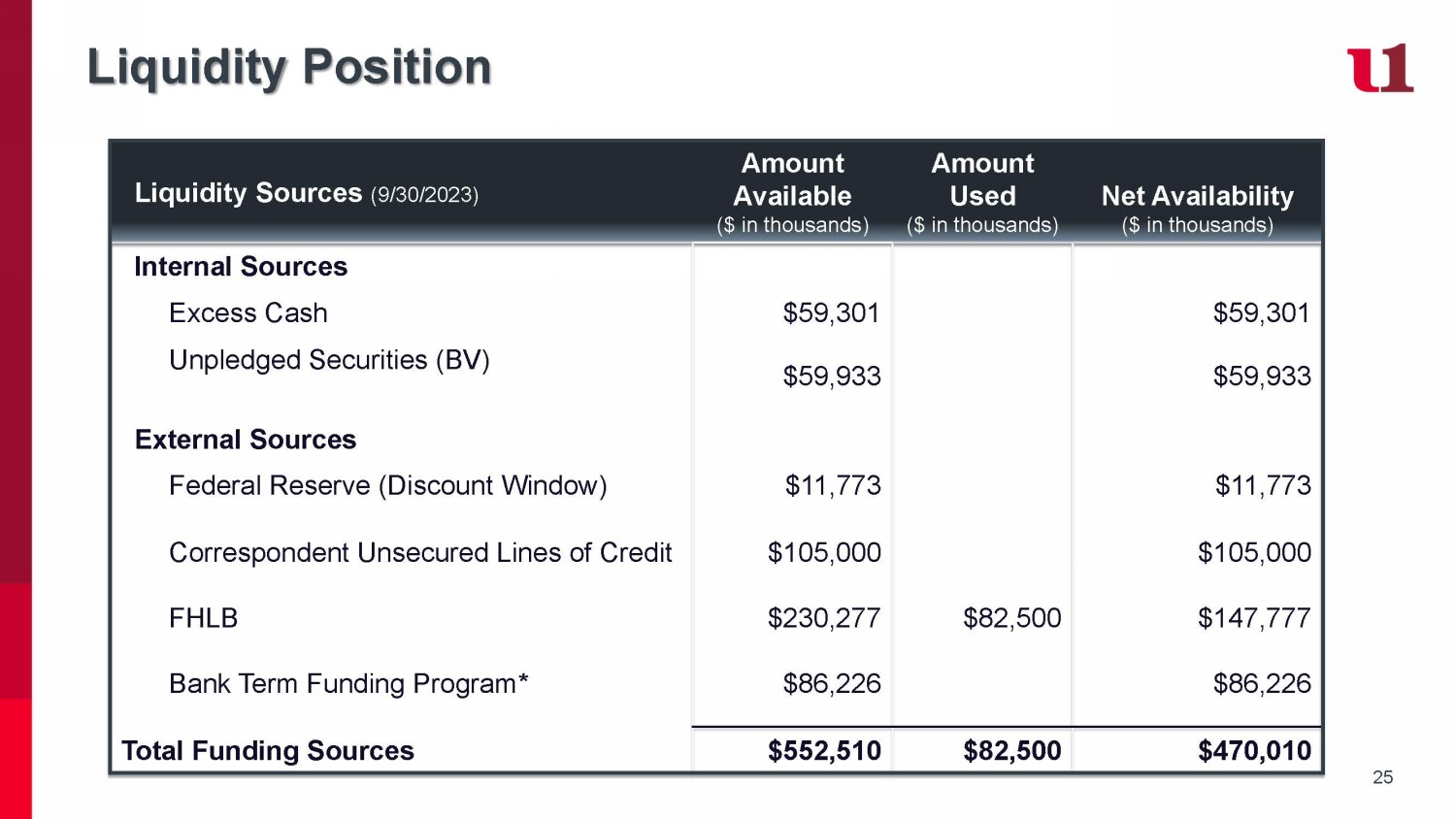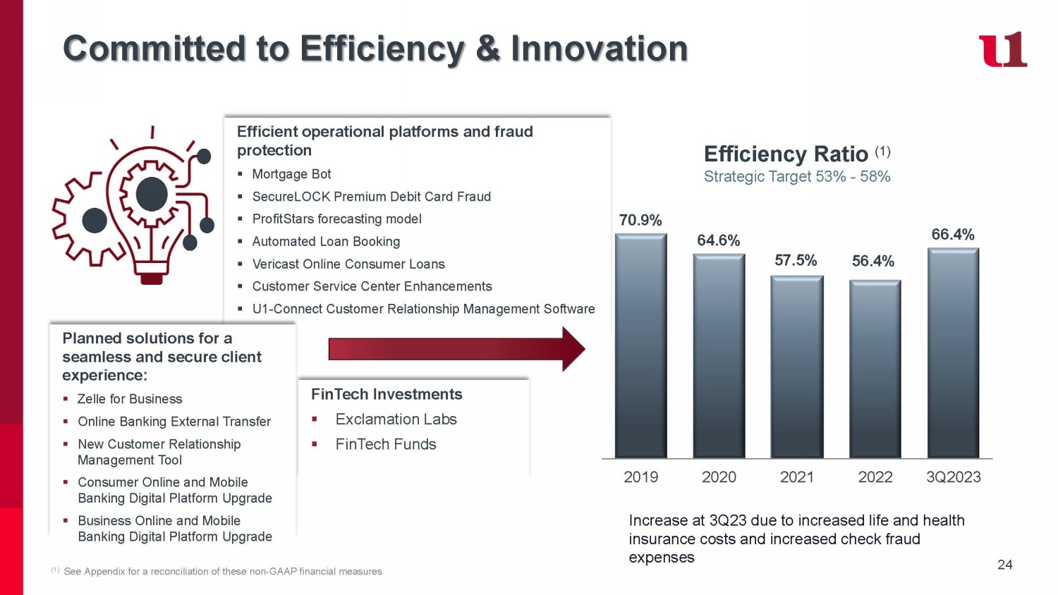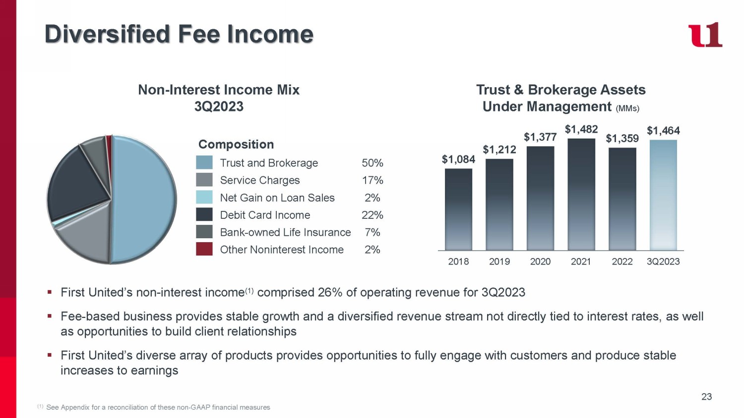 $40 $15 $15 $40 $31 September 2024 August 2024 May 2024 March 2024 December 2023 Dollars (in millions) Brokered CD FHLB Advance Brokered CD Brokered CD FHLB Advance 4.53% 5.29% 5.33% 5.31% 4.70% 22 Net Interest Margin (1) See Appendix for a reconciliation of these non - GAAP financial measures 4.41% 4.57% 3.99% 3.63% 3.85% 4.54% 0.86% 1.18% 0.91% 0.51% 0.44% 1.77% 3.74% 3.68% 3.34% 3.28% 3.56% 3.30% 0.42% 0.70% 0.49% 0.24% 0.21% 1.07% -0.5% 0.5% 1.5% 2.5% 3.5% 4.5% 2018 2019 2020 2021 2022 3Q2023 Yield on Earning Assets Cost of Interest-bearing Liabilities Net Interest Margin Cost of Deposits 23 Diversified Fee Income (1) See Appendix for a reconciliation of these non - GAAP financial measures Composition Trust and Brokerage 50% Service Charges 17% Net Gain on Loan Sales 2% Debit Card Income 22% Bank - owned Life Insurance 7% Other Noninterest Income 2% Non - Interest Income Mix 3Q2023 $1,084 $1,212 $1,377 $1,482 $1,359 $1,464 2018 2019 2020 2021 2022 3Q2023 Trust & Brokerage Assets Under Management (MMs) ▪ First United’s non - interest income (1) comprised 26% of operating revenue for 3Q2023 ▪ Fee - based business provides stable growth and a diversified revenue stream not directly tied to interest rates, as well as opportunities to build client relationships ▪ First United’s diverse array of products provides opportunities to fully engage with customers and produce stable increases to earnings 24 Committed to Efficiency & Innovation 70.9% 64.6% 57.5% 56.4% 66.4% 2019 2020 2021 2022 3Q2023 (1) See Appendix for a reconciliation of these non - GAAP financial measures Efficient operational platforms and fraud protection ▪ Mortgage Bot ▪ SecureLOCK Premium Debit Card Fraud ▪ ProfitStars forecasting model ▪ Automated Loan Booking ▪ Vericast Online Consumer Loans ▪ Customer Service Center Enhancements ▪ U1 - Connect Customer Relationship Management Software Efficiency Ratio (1) Strategic Target 53% - 58% FinTech Investments ▪ Exclamation Labs ▪ FinTech Funds Planned solutions for a seamless and secure client experience: ▪ Zelle for Business ▪ Online Banking External Transfer ▪ New Customer Relationship Management Tool ▪ Consumer Online and Mobile Banking Digital Platform Upgrade ▪ Business Online and Mobile Banking Digital Platform Upgrade Increase at 3Q23 due to increased life and health insurance costs and increased check fraud expenses