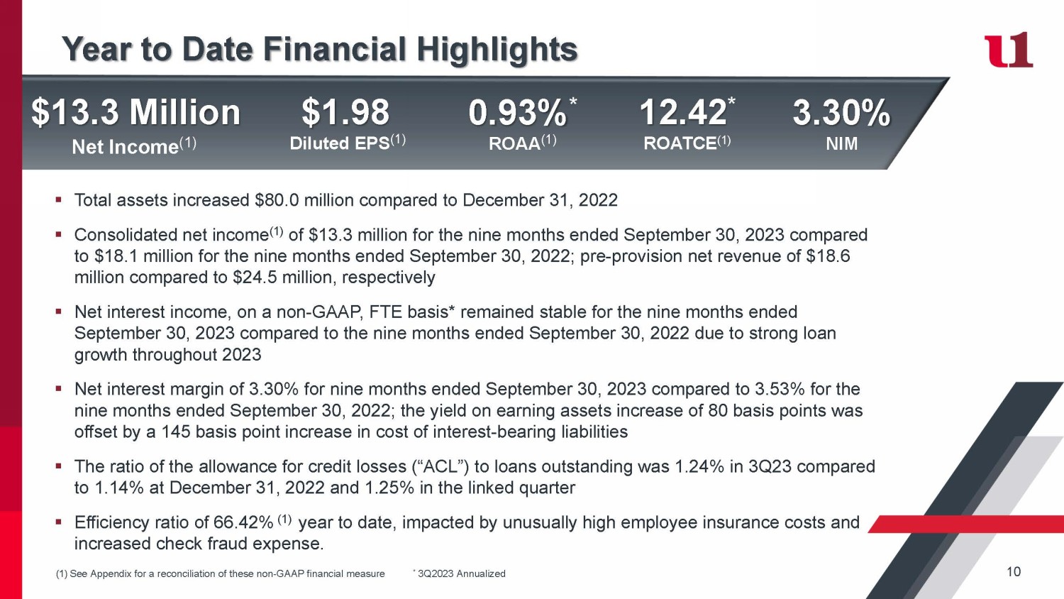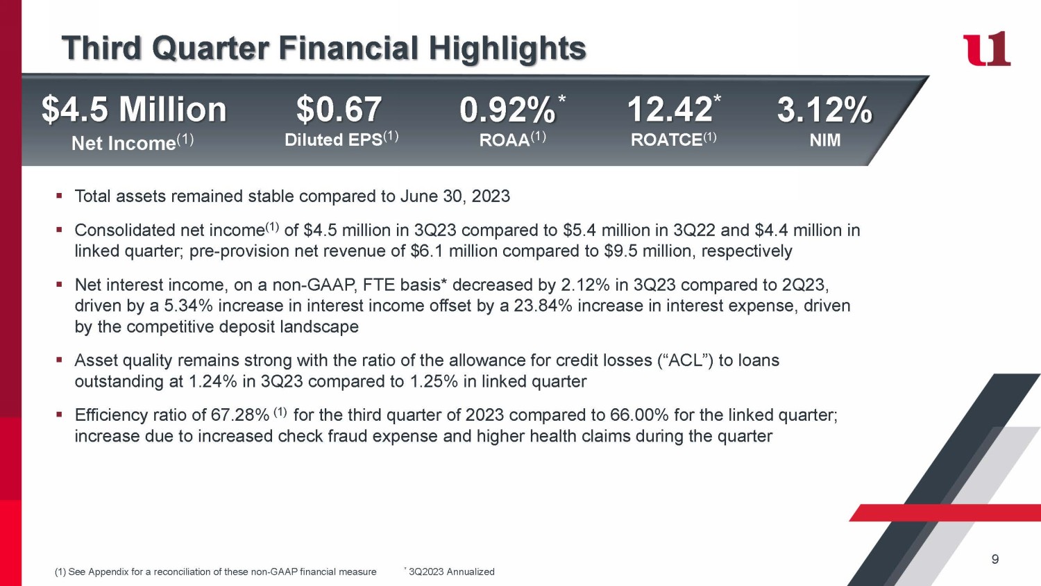 Third Quarter Financial Highlights $4.5 Million Net Income (1) $0.67 Diluted EPS (1) 0.92% * ROAA (1) 12.42 * ROATCE (1) 3.12% NIM ▪ Total assets remained stable compared to June 30, 2023 ▪ Consolidated net income (1) of $4.5 million in 3Q23 compared to $5.4 million in 3Q22 and $4.4 million in linked quarter; pre - provision net revenue of $6.1 million compared to $9.5 million, respectively ▪ Net interest income, on a non - GAAP, FTE basis* decreased by 2.12% in 3Q23 compared to 2Q23, driven by a 5.34% increase in interest income offset by a 23.84% increase in interest expense, driven by the competitive deposit landscape ▪ Asset quality remains strong with the ratio of the allowance for credit losses (“ACL”) to loans outstanding at 1.24% in 3Q23 compared to 1.25% in linked quarter ▪ Efficiency ratio of 67.28% (1) for the third quarter of 2023 compared to 66.00% for the linked quarter; increase due to increased check fraud expense and higher health claims during the quarter (1) See Appendix for a reconciliation of these non - GAAP financial measure * 3Q2023 Annualized 9 Year to Date Financial Highlights $13.3 Million Net Income (1) $1.98 Diluted EPS (1) 0.93% * ROAA (1) 12.42 * ROATCE (1) 3.30% NIM ▪ Total assets increased $80.0 million compared to December 31, 2022 ▪ Consolidated net income (1) of $13.3 million for the nine months ended September 30, 2023 compared to $18.1 million for the nine months ended September 30, 2022; pre - provision net revenue of $18.6 million compared to $24.5 million, respectively ▪ Net interest income, on a non - GAAP, FTE basis* remained stable for the nine months ended September 30, 2023 compared to the nine months ended September 30, 2022 due to strong loan growth throughout 2023 ▪ Net interest margin of 3.30% for nine months ended September 30, 2023 compared to 3.53% for the nine months ended September 30, 2022; the yield on earning assets increase of 80 basis points was offset by a 145 basis point increase in cost of interest - bearing liabilities ▪ The ratio of the allowance for credit losses (“ACL”) to loans outstanding was 1.24% in 3Q23 compared to 1.14% at December 31, 2022 and 1.25% in the linked quarter ▪ Efficiency ratio of 66.42% (1) year to date, impacted by unusually high employee insurance costs and increased check fraud expense.