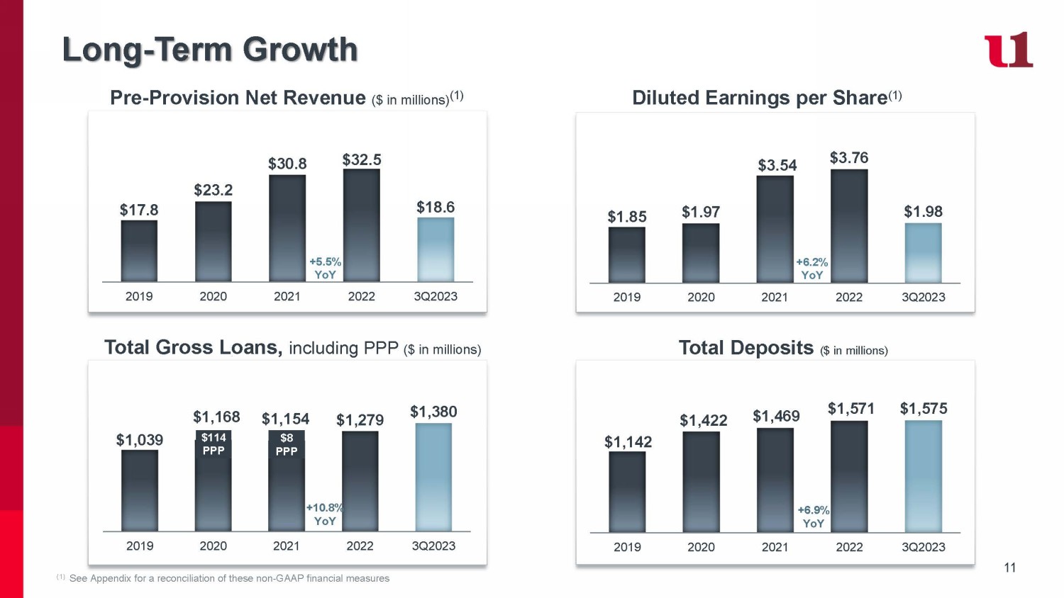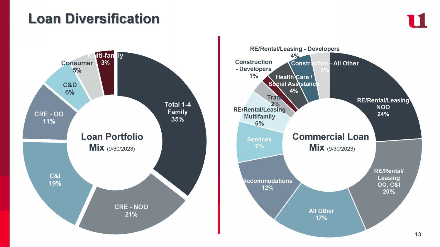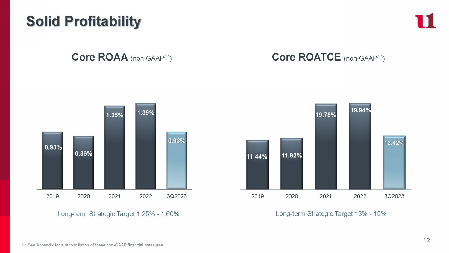11 Long - Term Growth Pre - Provision Net Revenue ($ in millions) (1) $17.8 $23.2 $30.8 $32.5 $18.6 2019 2020 2021 2022 3Q2023 +5.5% YoY (1) See Appendix for a reconciliation of these non - GAAP financial measures $1.85 $1.97 $3.54 $3.76 $1.98 2019 2020 2021 2022 3Q2023 +6.2% YoY Diluted Earnings per Share (1) Total Deposits ($ in millions) $1,142 $1,422 $1,469 $1,571 $1,575 2019 2020 2021 2022 3Q2023 +6.9% YoY Total Gross Loans, including PPP ($ in millions) $1,039 $1,168 $1,154 $1,279 $1,380 2019 2020 2021 2022 3Q2023 +10.8% YoY $114 PPP $8 PPP 12 Solid Profitability (1) See Appendix for a reconciliation of these non - GAAP financial measures 11.44% 11.92% 19.78% 19.94% 12.42% 2019 2020 2021 2022 3Q2023 Long - term Strategic Target 13% - 15% 0.93% 0.86% 1.35% 1.39% 0.93% 2019 2020 2021 2022 3Q2023 Long - term Strategic Target 1.25% - 1.60% Core ROAA (non - GAAP (1) ) Core ROATCE (non - GAAP (1) )