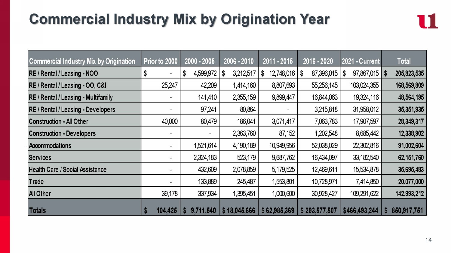 13 Total 1 - 4 Family 35% CRE - NOO 21% C&I 19% CRE - OO 11% C&D 6% Consumer 5% Multi - family 3% Loan Diversification Loan Portfolio Mix (9/30/2023) RE/Rental/Leasing NOO 24% RE/Rental/ Leasing OO, C&I 20% All Other 17% Accommodations 12% Services 7% RE/Rental/Leasing Multifamily 6% Trade 2% Construction - Developers 1% Health Care / Social Assistance 4% RE/Rental/Leasing - Developers 4% Construction - All Other 3% Commercial Loan Mix (9/30/2023)