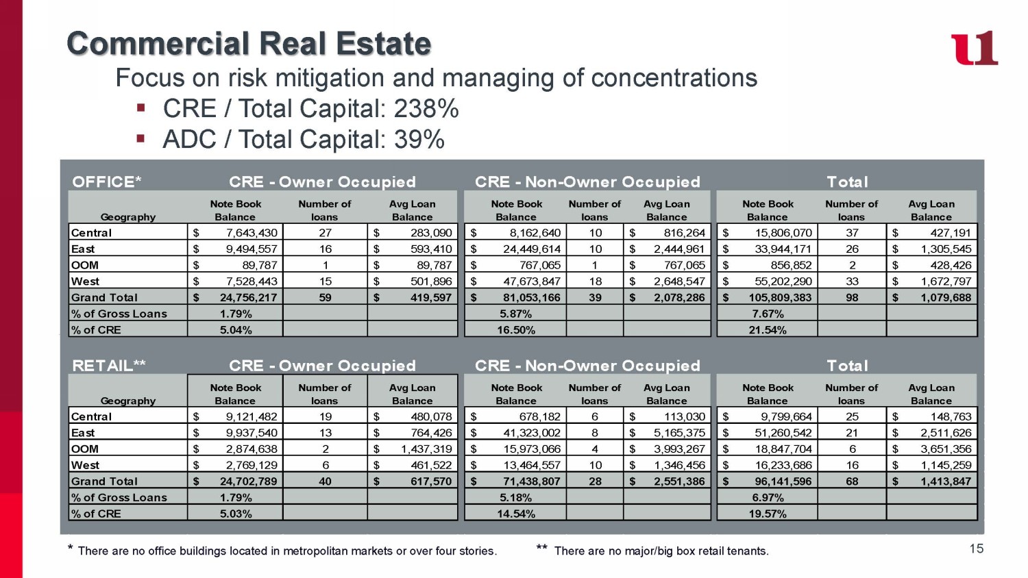 14 Commercial Industry Mix by Origination Year Commercial Industry Mix by Origination Prior to 2000 2000 - 2005 2006 - 2010 2011 - 2015 2016 - 2020 2021 - Current Total RE / Rental / Leasing - NOO -$ 4,599,972$ 3,212,517$ 12,748,016$ 87,396,015$ 97,867,015$ 205,823,535$ RE / Rental / Leasing - OO, C&I 25,247 42,209 1,414,160 8,807,693 55,256,145 103,024,355 168,569,809 RE / Rental / Leasing - Multifamily - 141,410 2,355,159 9,899,447 16,844,063 19,324,116 48,564,195 RE / Rental / Leasing - Developers - 97,241 80,864 - 3,215,818 31,958,012 35,351,935 Construction - All Other 40,000 80,479 186,041 3,071,417 7,063,783 17,907,597 28,349,317 Construction - Developers - - 2,363,760 87,152 1,202,548 8,685,442 12,338,902 Accommodations - 1,521,614 4,190,189 10,949,956 52,038,029 22,302,816 91,002,604 Services - 2,324,183 523,179 9,687,762 16,434,097 33,182,540 62,151,760 Health Care / Social Assistance - 432,609 2,078,859 5,179,525 12,469,611 15,534,878 35,695,483 Trade - 133,889 245,487 1,553,801 10,728,971 7,414,850 20,077,000 All Other 39,178 337,934 1,395,451 1,000,600 30,928,427 109,291,622 142,993,212 Totals 104,425$ 9,711,540$ 18,045,666$ 62,985,369$ 293,577,507$ 466,493,244$ 850,917,751$ 15 Commercial Real Estate Focus on risk mitigation and managing of concentrations ▪ CRE / Total Capital: 238% ▪ ADC / Total Capital: 39% * There are no office buildings located in metropolitan markets or over four stories.