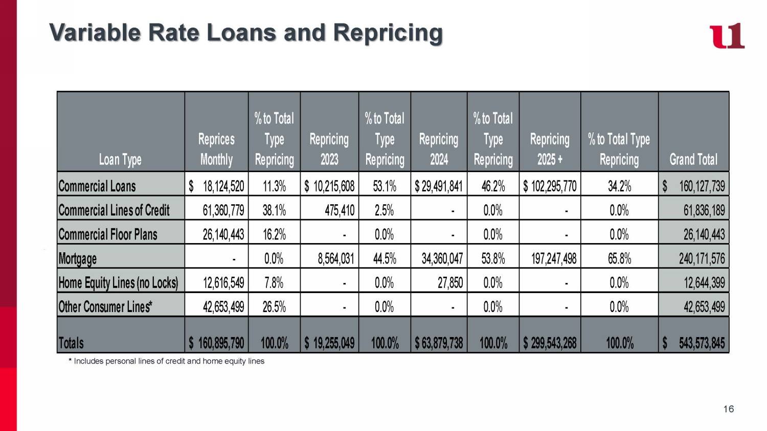 ** There are no major/big box retail tenants. OFFICE* Geography Note Book Balance Number of loans Avg Loan Balance Note Book Balance Number of loans Avg Loan Balance Note Book Balance Number of loans Avg Loan Balance Central 7,643,430$ 27 283,090$ 8,162,640$ 10 816,264$ 15,806,070$ 37 427,191$ East 9,494,557$ 16 593,410$ 24,449,614$ 10 2,444,961$ 33,944,171$ 26 1,305,545$ OOM 89,787$ 1 89,787$ 767,065$ 1 767,065$ 856,852$ 2 428,426$ West 7,528,443$ 15 501,896$ 47,673,847$ 18 2,648,547$ 55,202,290$ 33 1,672,797$ Grand Total 24,756,217$ 59 419,597$ 81,053,166$ 39 2,078,286$ 105,809,383$ 98 1,079,688$ % of Gross Loans 1.79% 5.87% 7.67% % of CRE 5.04% 16.50% 21.54% RETAIL** Geography Note Book Balance Number of loans Avg Loan Balance Note Book Balance Number of loans Avg Loan Balance Note Book Balance Number of loans Avg Loan Balance Central 9,121,482$ 19 480,078$ 678,182$ 6 113,030$ 9,799,664$ 25 148,763$ East 9,937,540$ 13 764,426$ 41,323,002$ 8 5,165,375$ 51,260,542$ 21 2,511,626$ OOM 2,874,638$ 2 1,437,319$ 15,973,066$ 4 3,993,267$ 18,847,704$ 6 3,651,356$ West 2,769,129$ 6 461,522$ 13,464,557$ 10 1,346,456$ 16,233,686$ 16 1,145,259$ Grand Total 24,702,789$ 40 617,570$ 71,438,807$ 28 2,551,386$ 96,141,596$ 68 1,413,847$ % of Gross Loans 1.79% 5.18% 6.97% % of CRE 5.03% 14.54% 19.57% CRE - Owner Occupied CRE - Non-Owner Occupied Total CRE - Owner Occupied CRE - Non-Owner Occupied Total 16 Variable Rate Loans and Repricing * Includes personal lines of credit and home equity lines Loan Type Reprices Monthly % to Total Type Repricing Repricing 2023 % to Total Type Repricing Repricing 2024 % to Total Type Repricing Repricing 2025 + % to Total Type Repricing Grand Total Commercial Loans 18,124,520$ 11.3% 10,215,608$ 53.1% 29,491,841$ 46.2% 102,295,770$ 34.2% 160,127,739$ Commercial Lines of Credit 61,360,779 38.1% 475,410 2.5% - 0.0% - 0.0% 61,836,189 Commercial Floor Plans 26,140,443 16.2% - 0.0% - 0.0% - 0.0% 26,140,443 Mortgage - 0.0% 8,564,031 44.5% 34,360,047 53.8% 197,247,498 65.8% 240,171,576 Home Equity Lines (no Locks) 12,616,549 7.8% - 0.0% 27,850 0.0% - 0.0% 12,644,399 Other Consumer Lines* 42,653,499 26.5% - 0.0% - 0.0% - 0.0% 42,653,499 Totals 160,895,790$ 100.0% 19,255,049$ 100.0% 63,879,738$ 100.0% 299,543,268$ 100.0% 543,573,845$